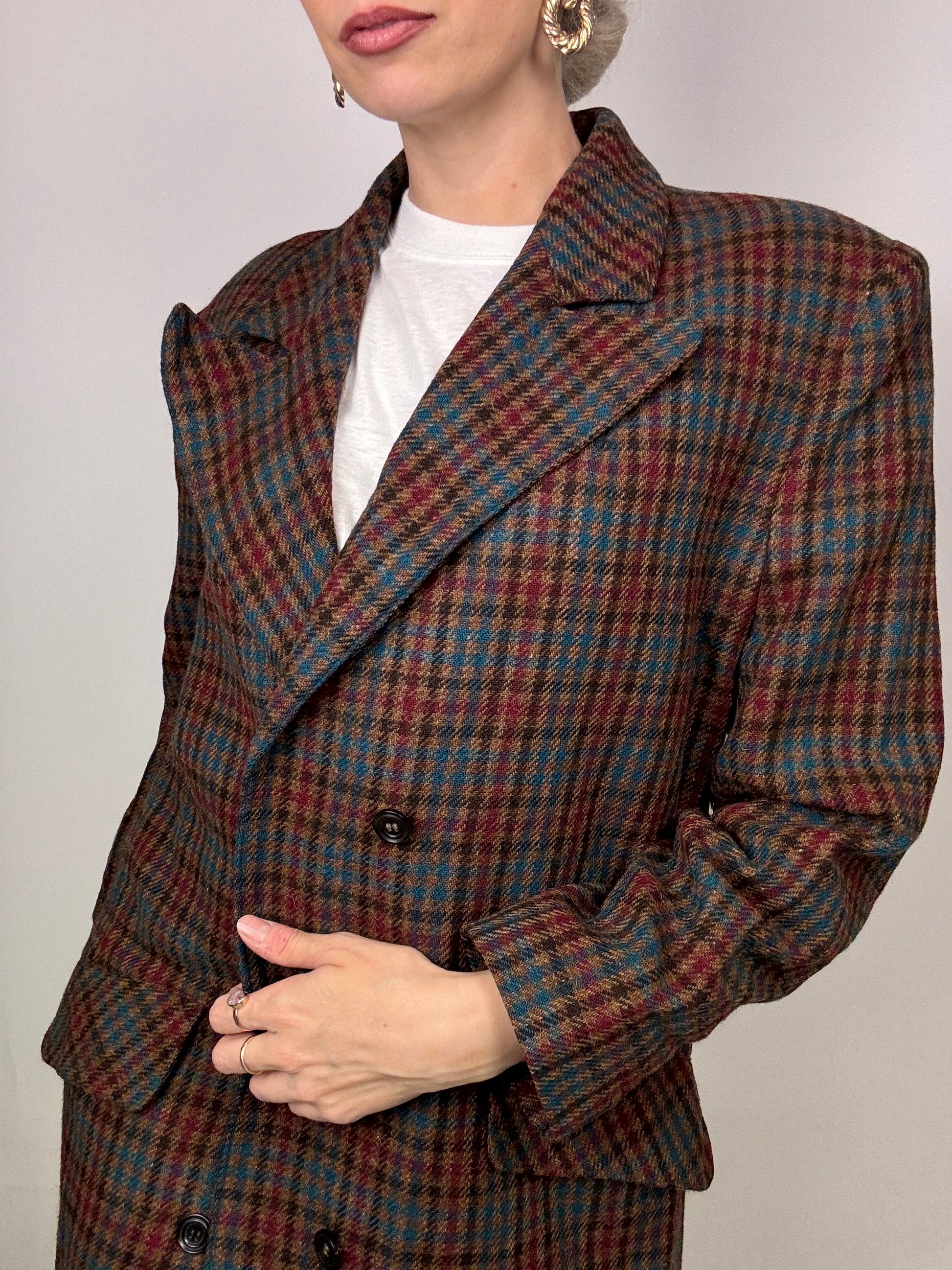 Vintage brauner Wollkaro-Langblazer