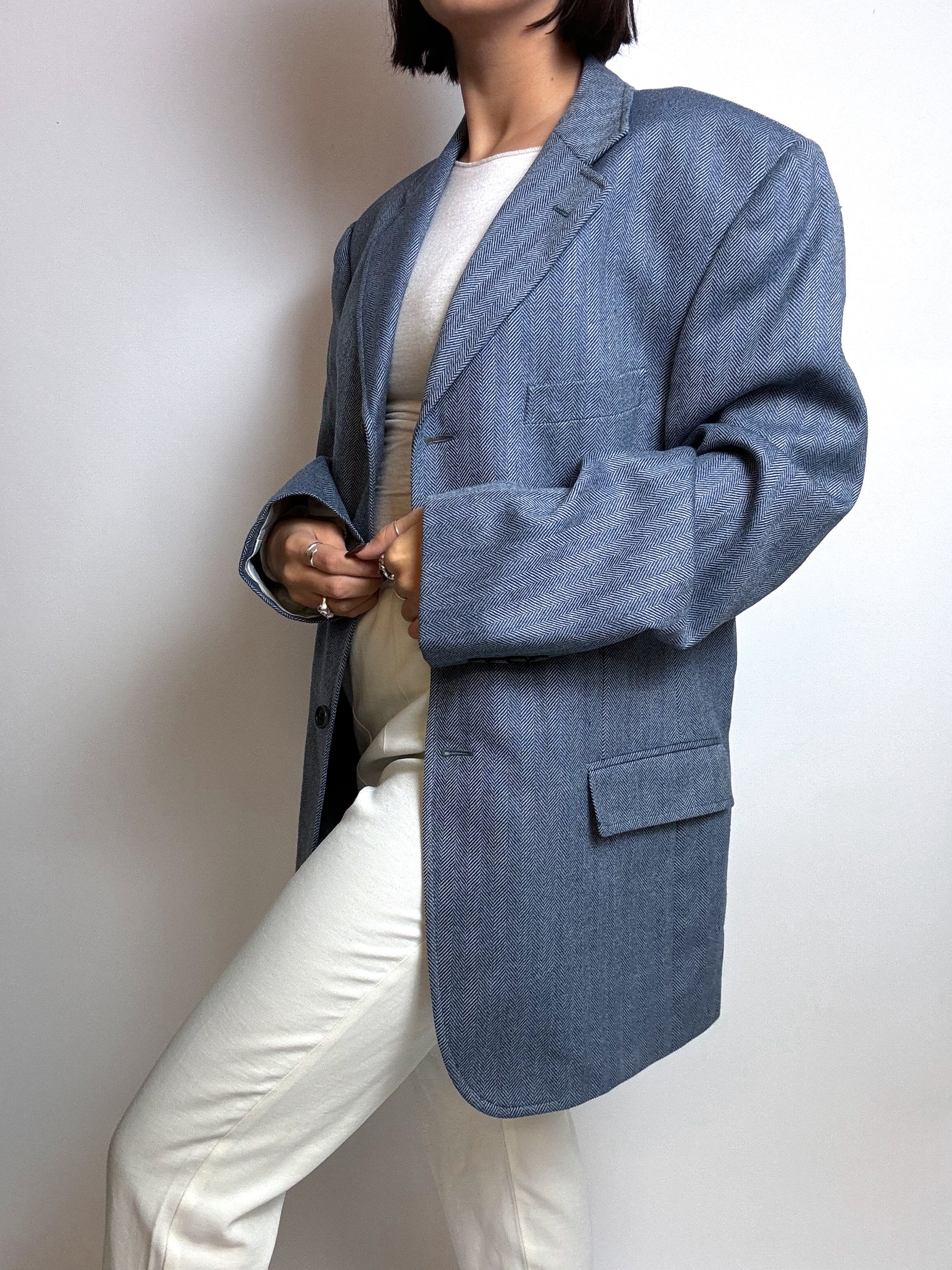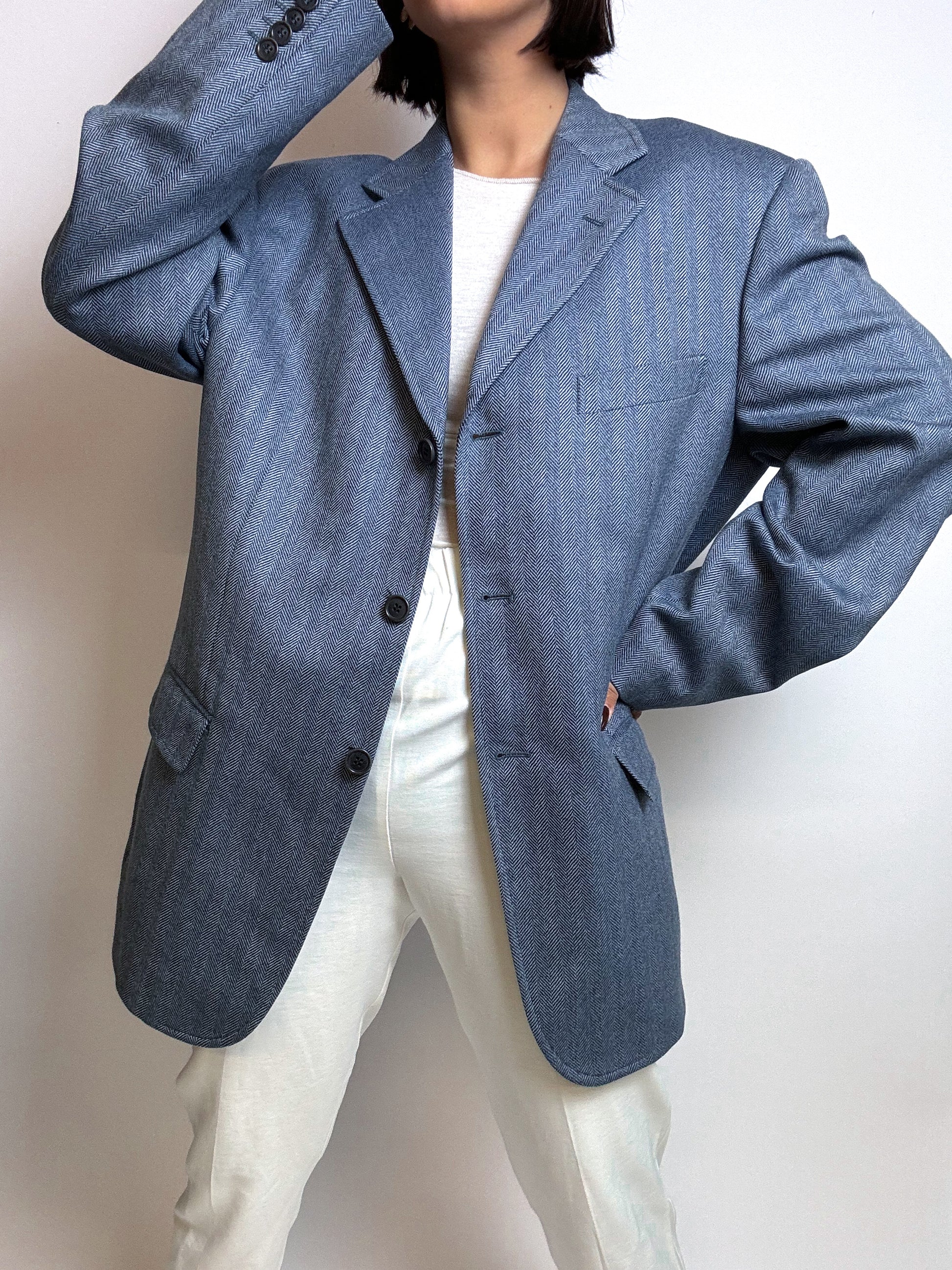 Vintage blau/grauer Fischgrätenblazer aus Wolle M/L