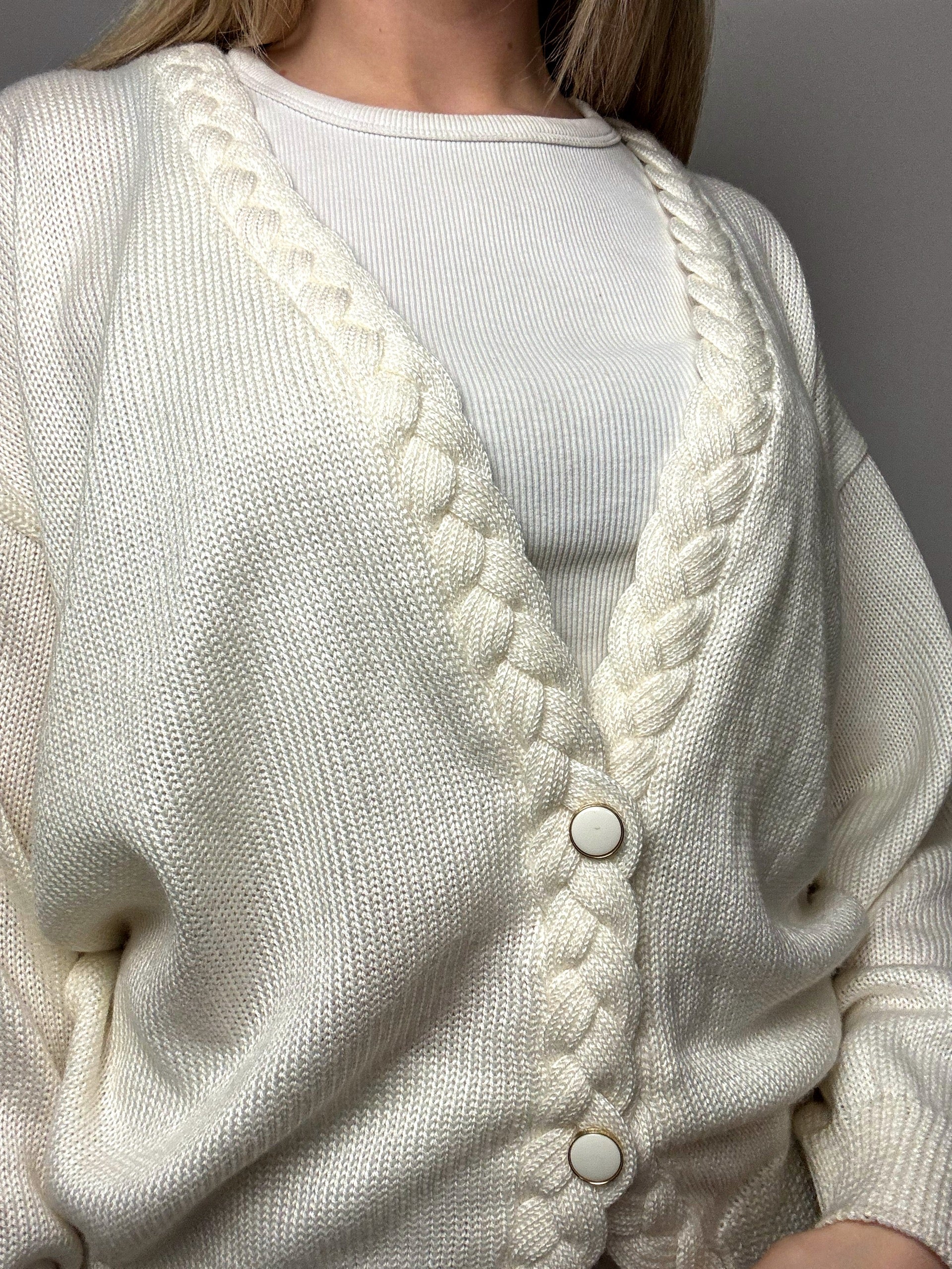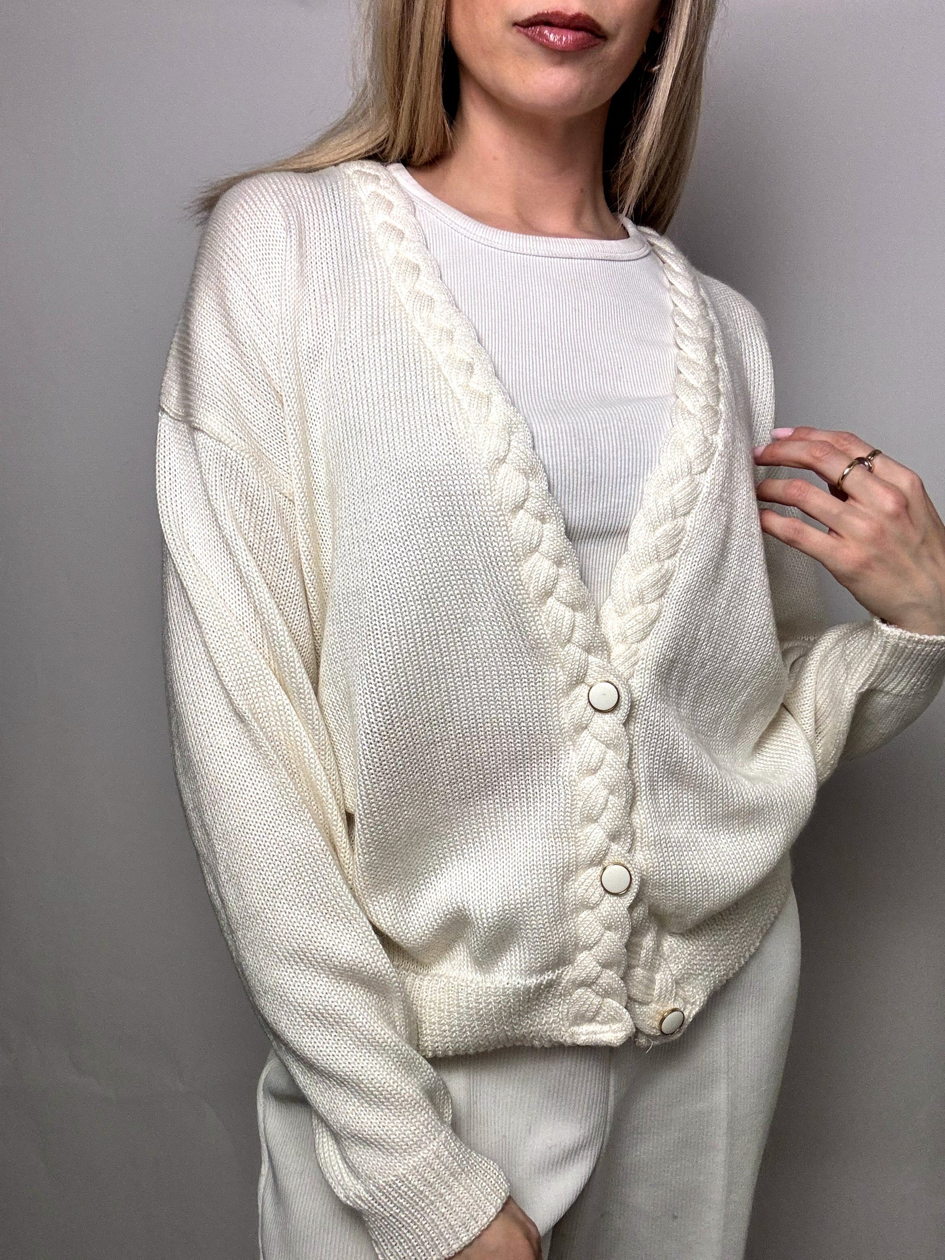 Vintage M Weißer Cardigan mit geflochtenem Kragen