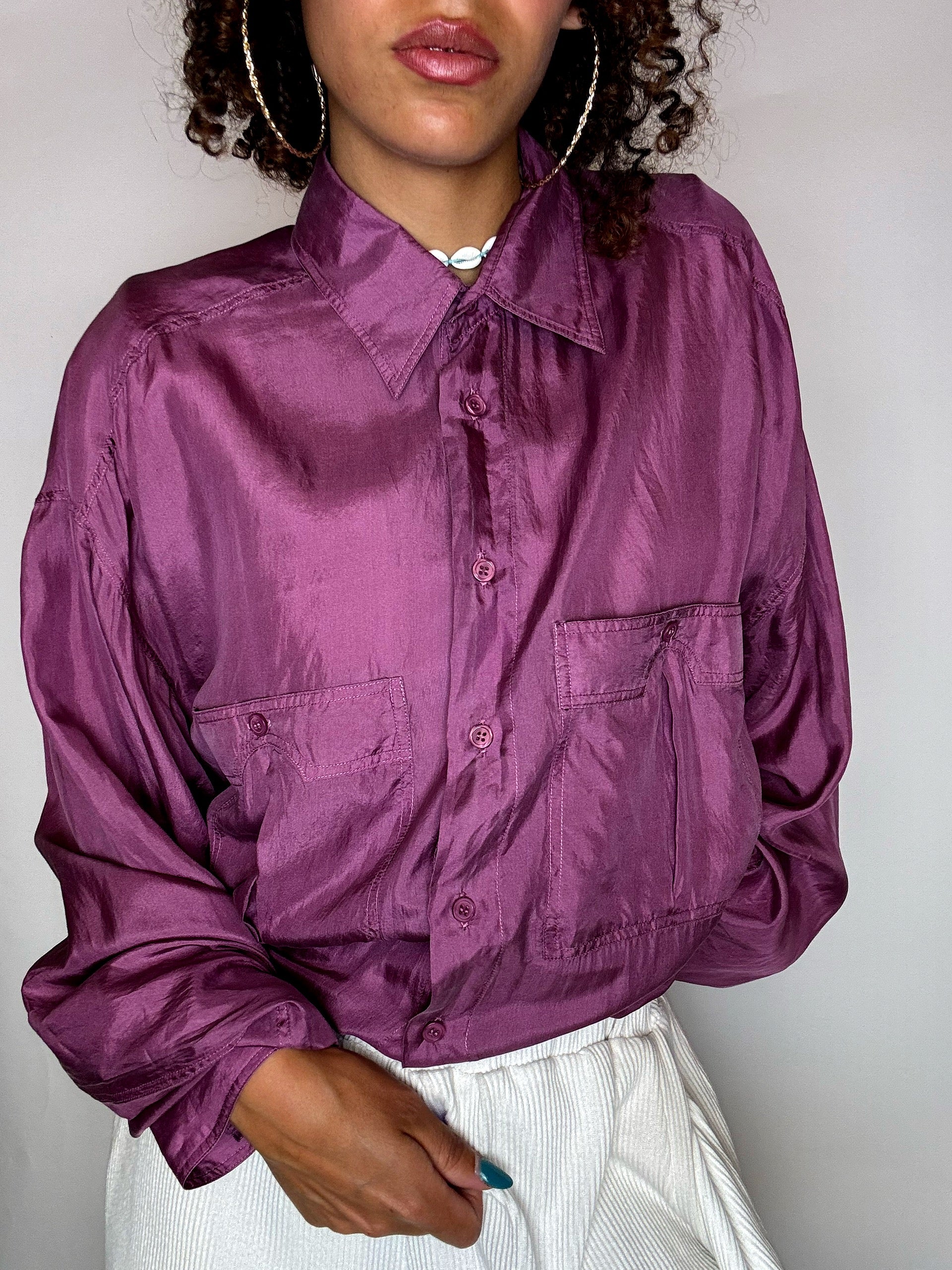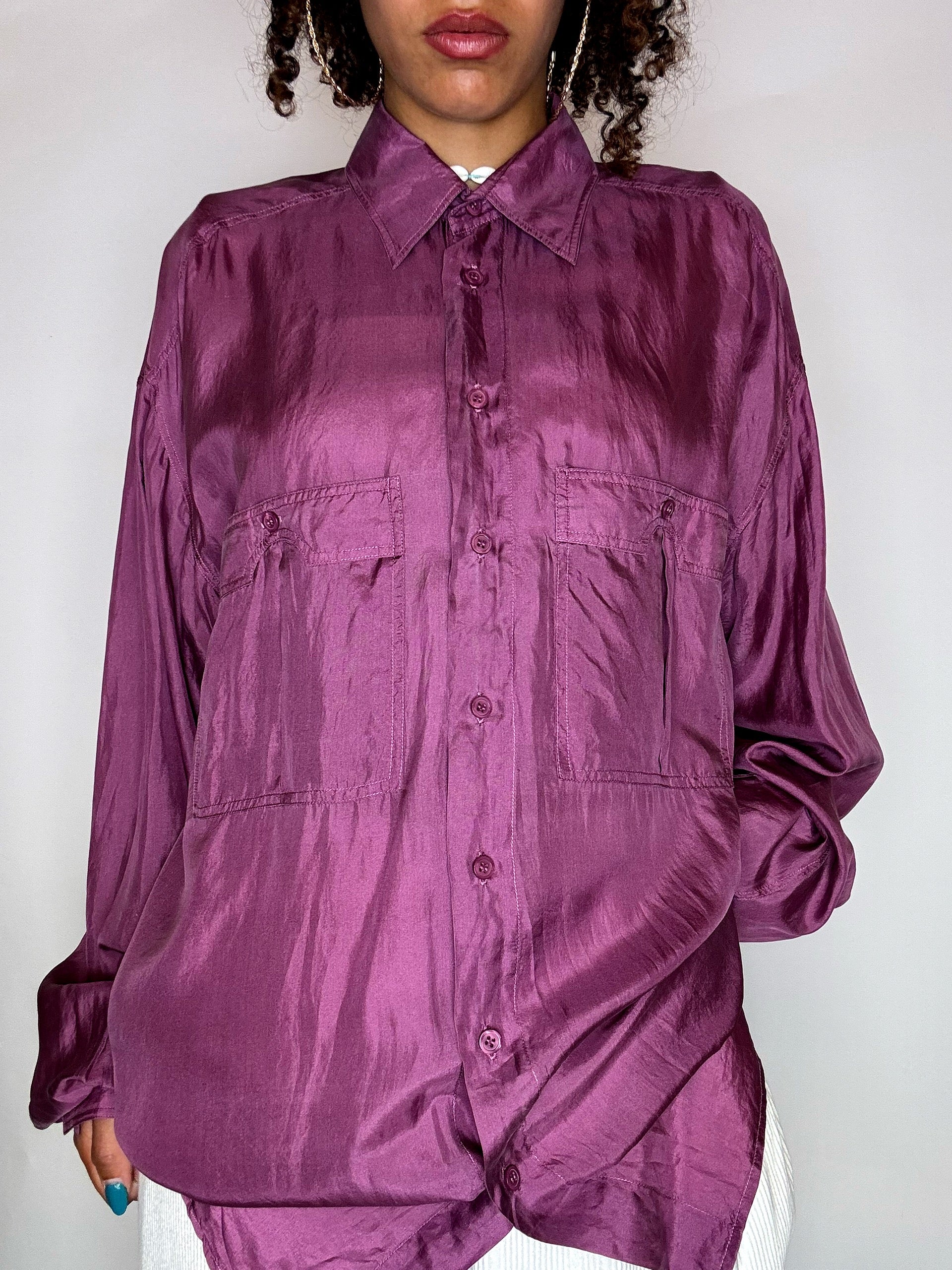 Vintage-Seidenhemd in Himbeerrot, langärmlig, Größe M/L