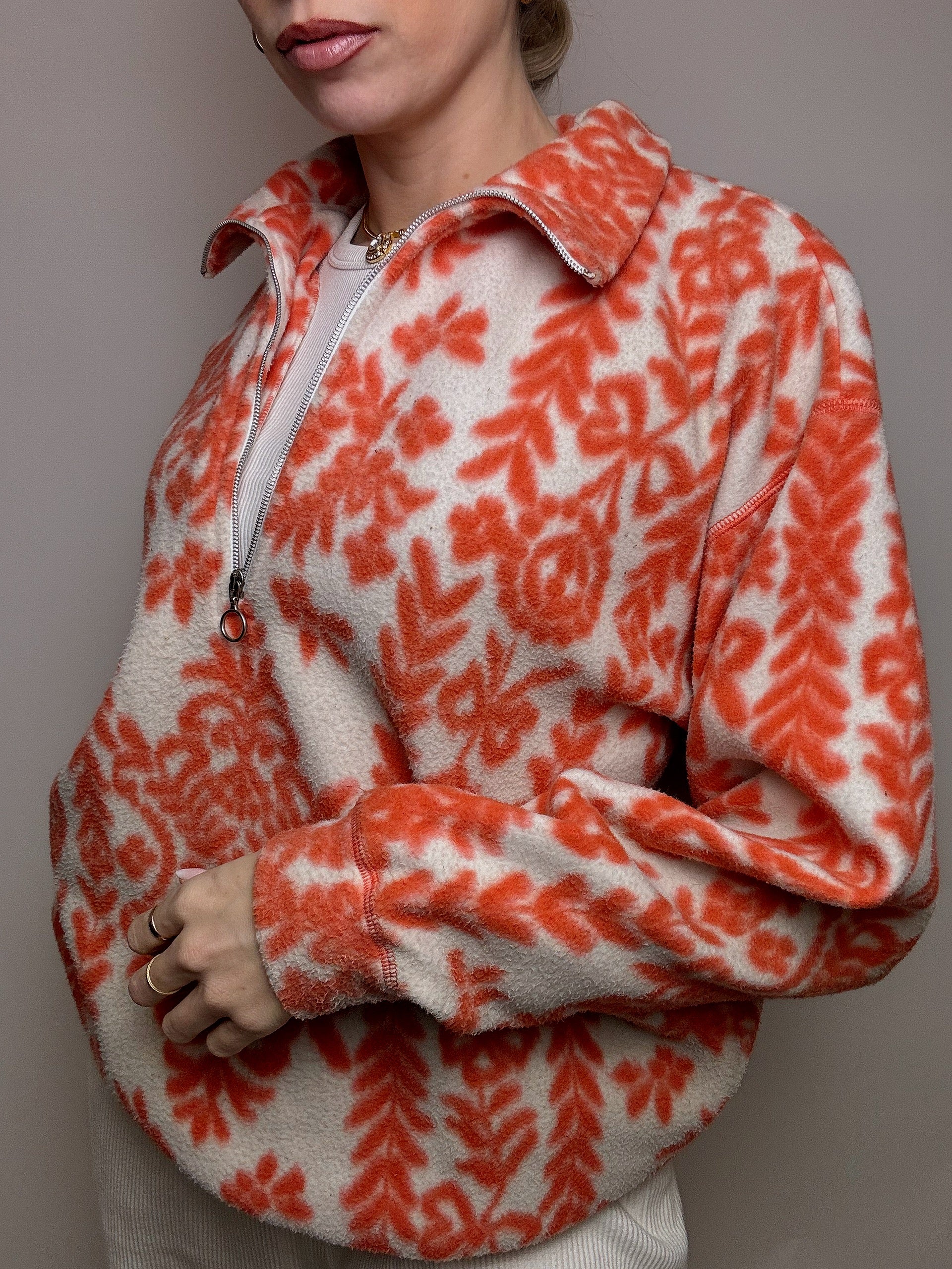 Cremefarbenes und orangefarbenes Fleece mit Grafik und Reißverschluss am Hals M Vintage