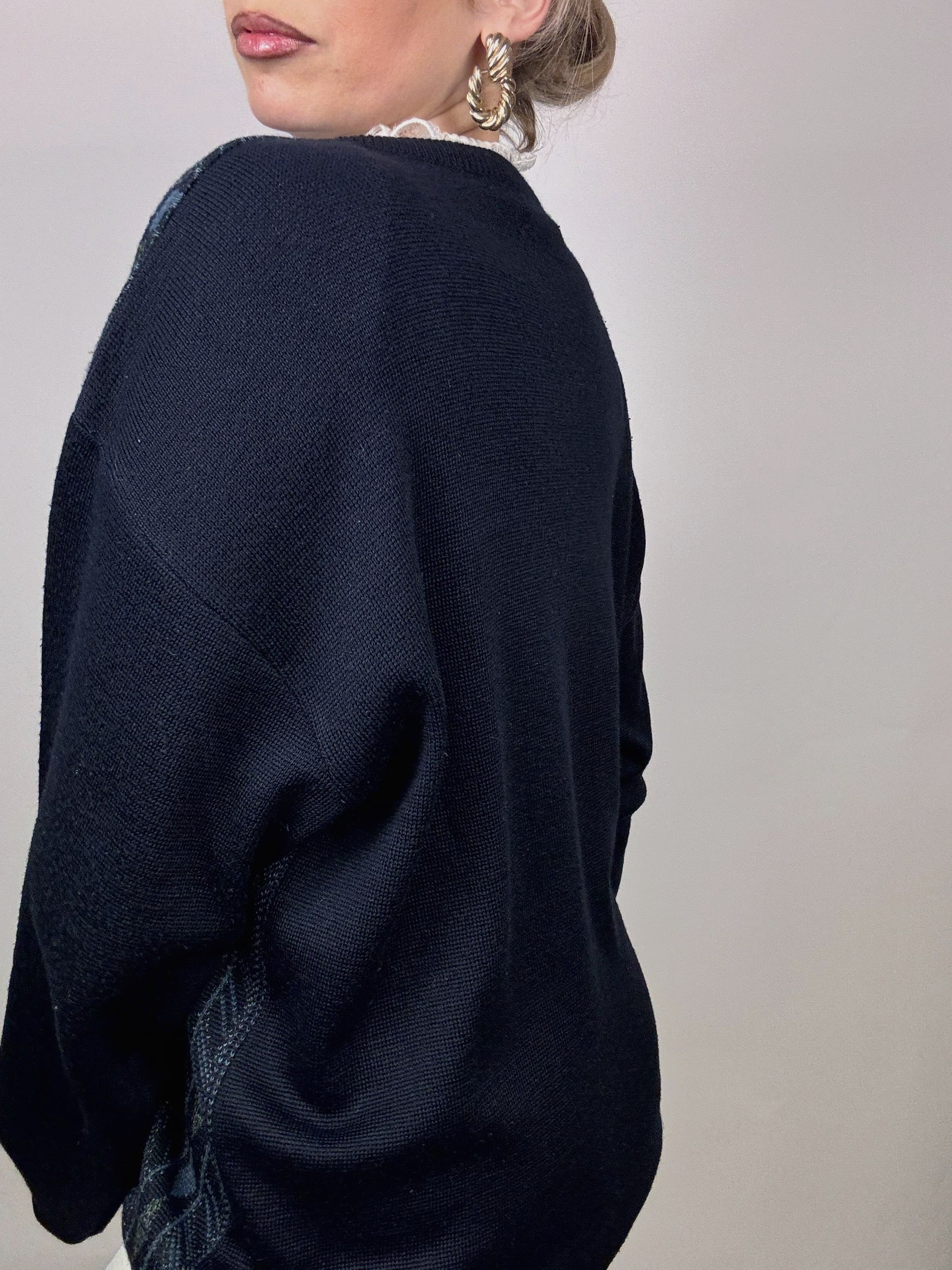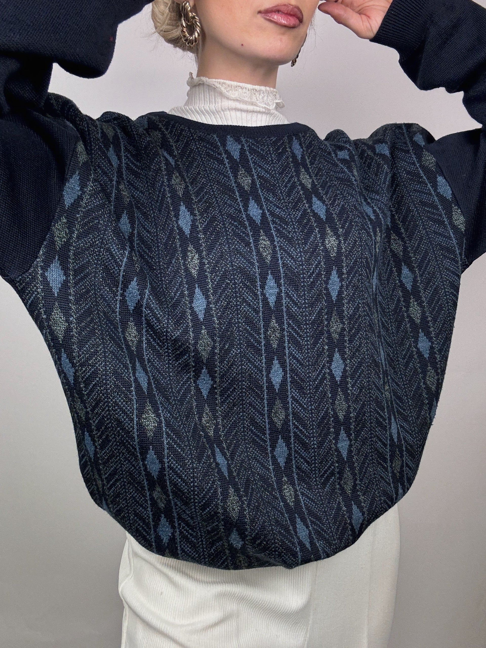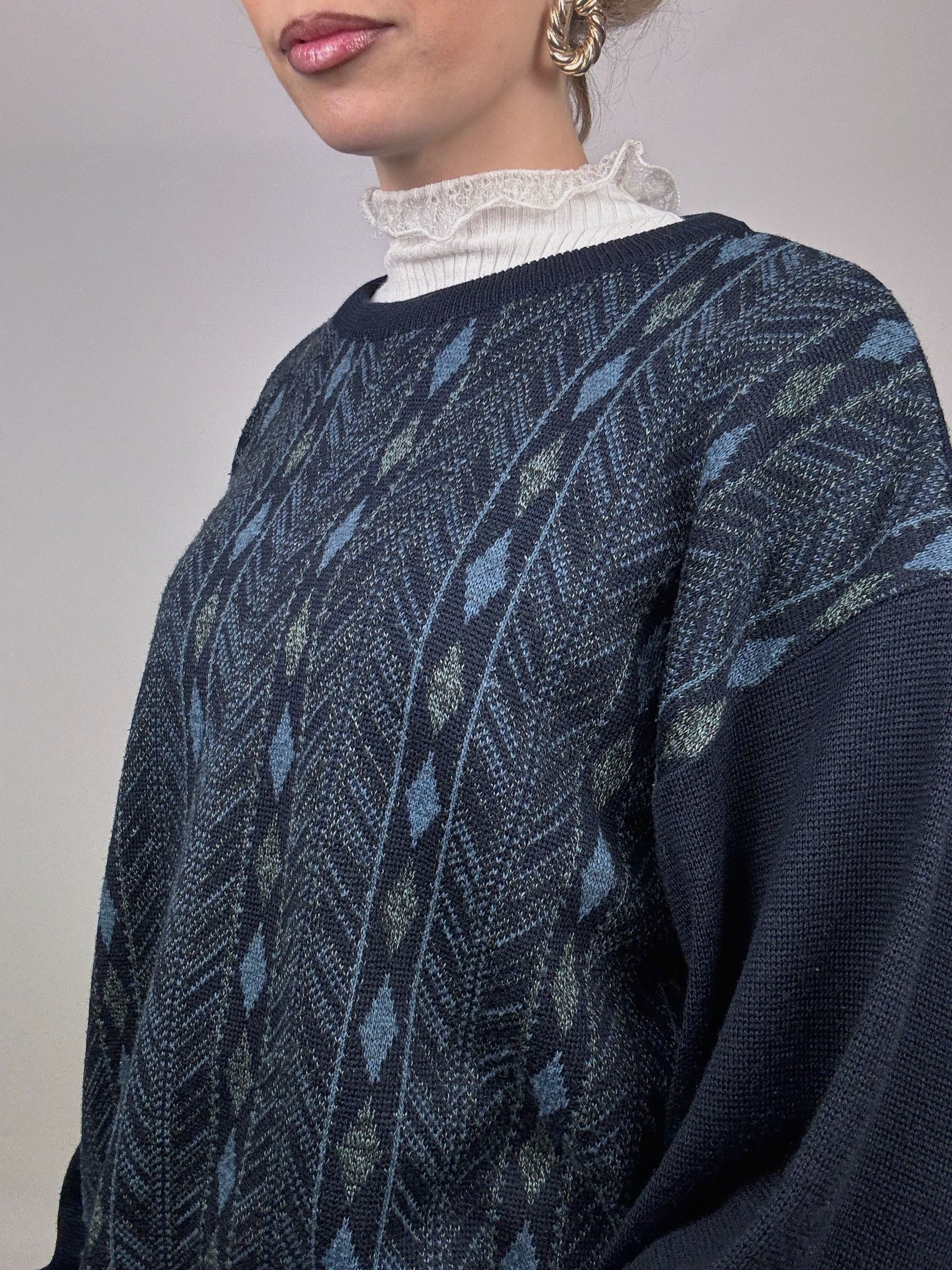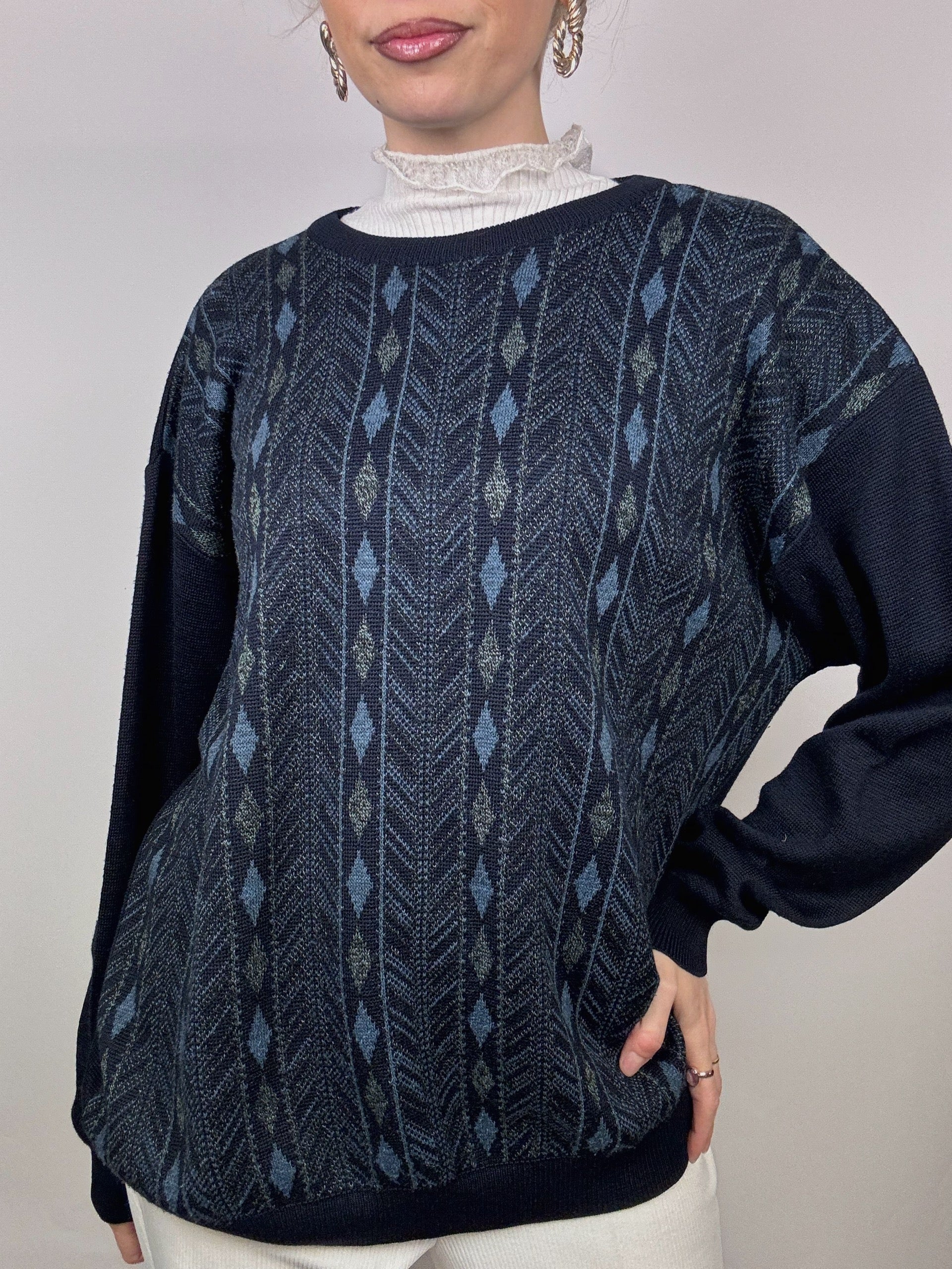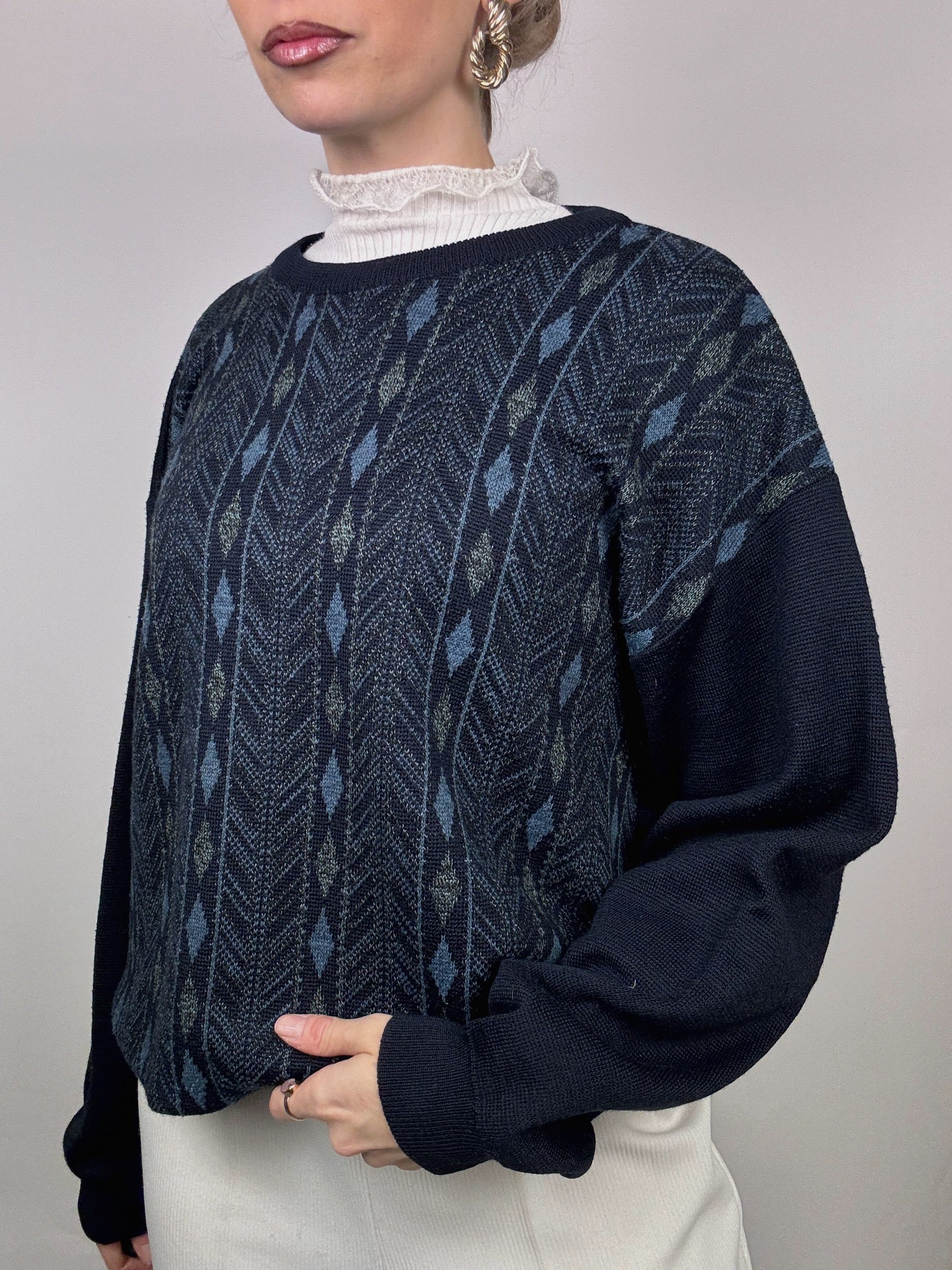 Blau gestreifter Rundhalspullover mit Vintage-Muster M/L