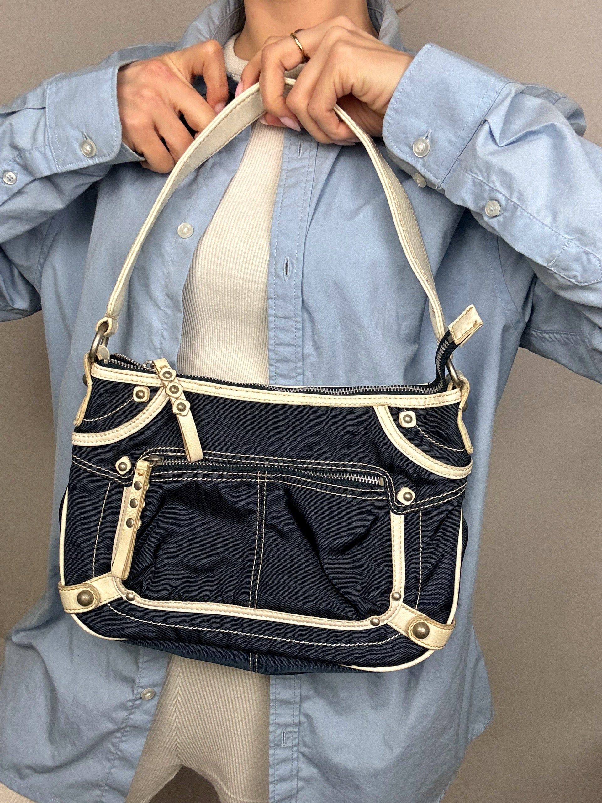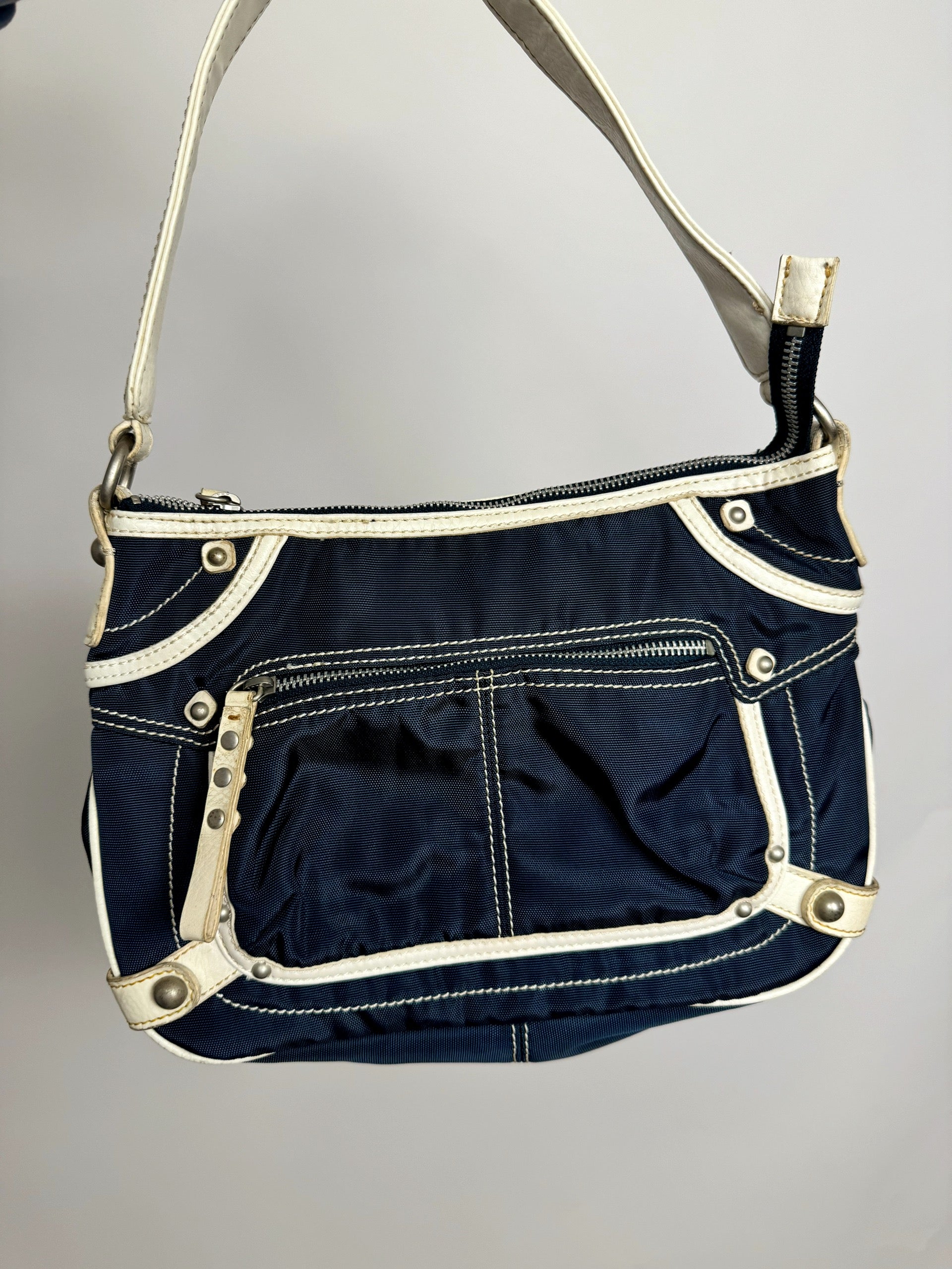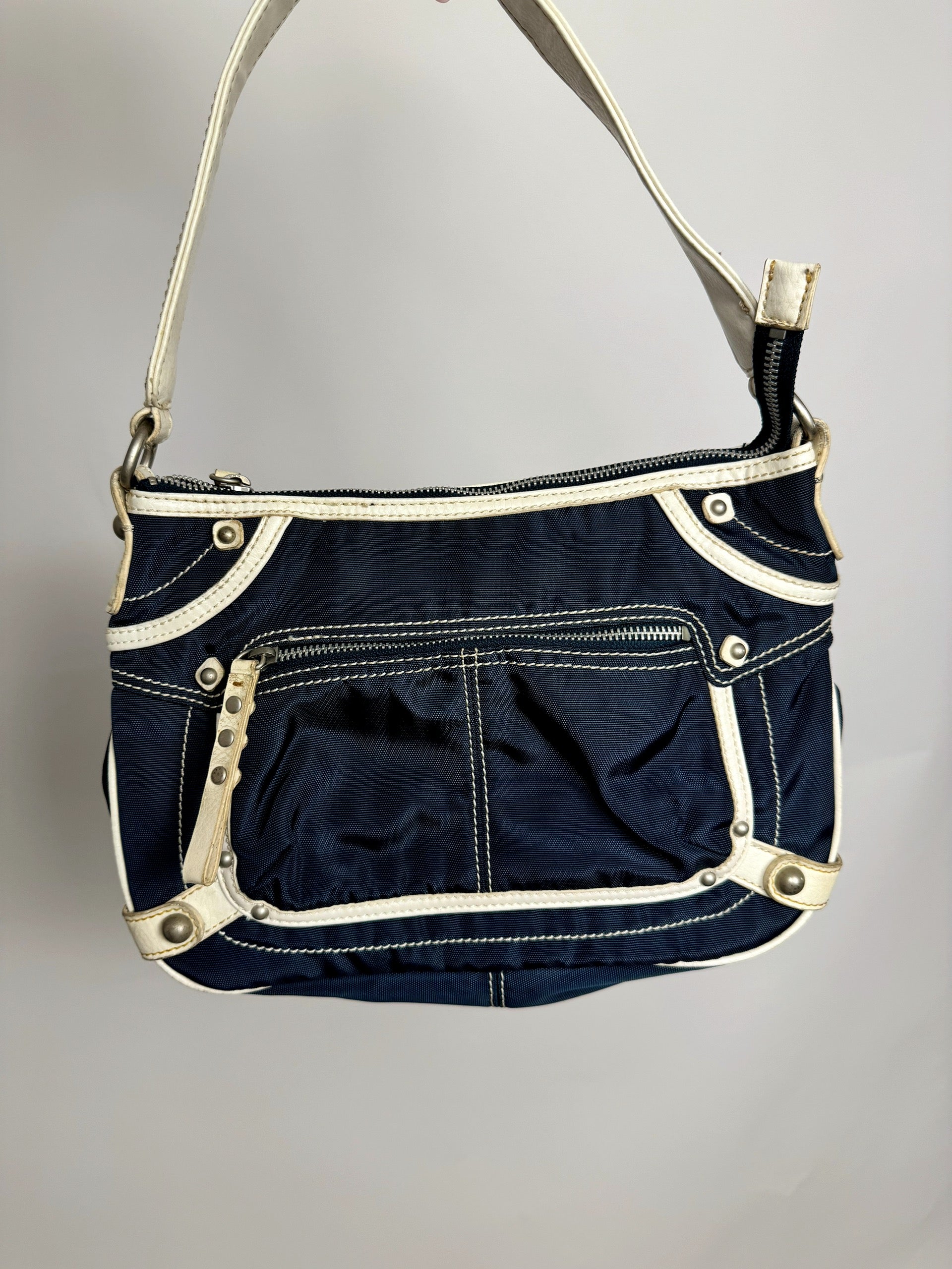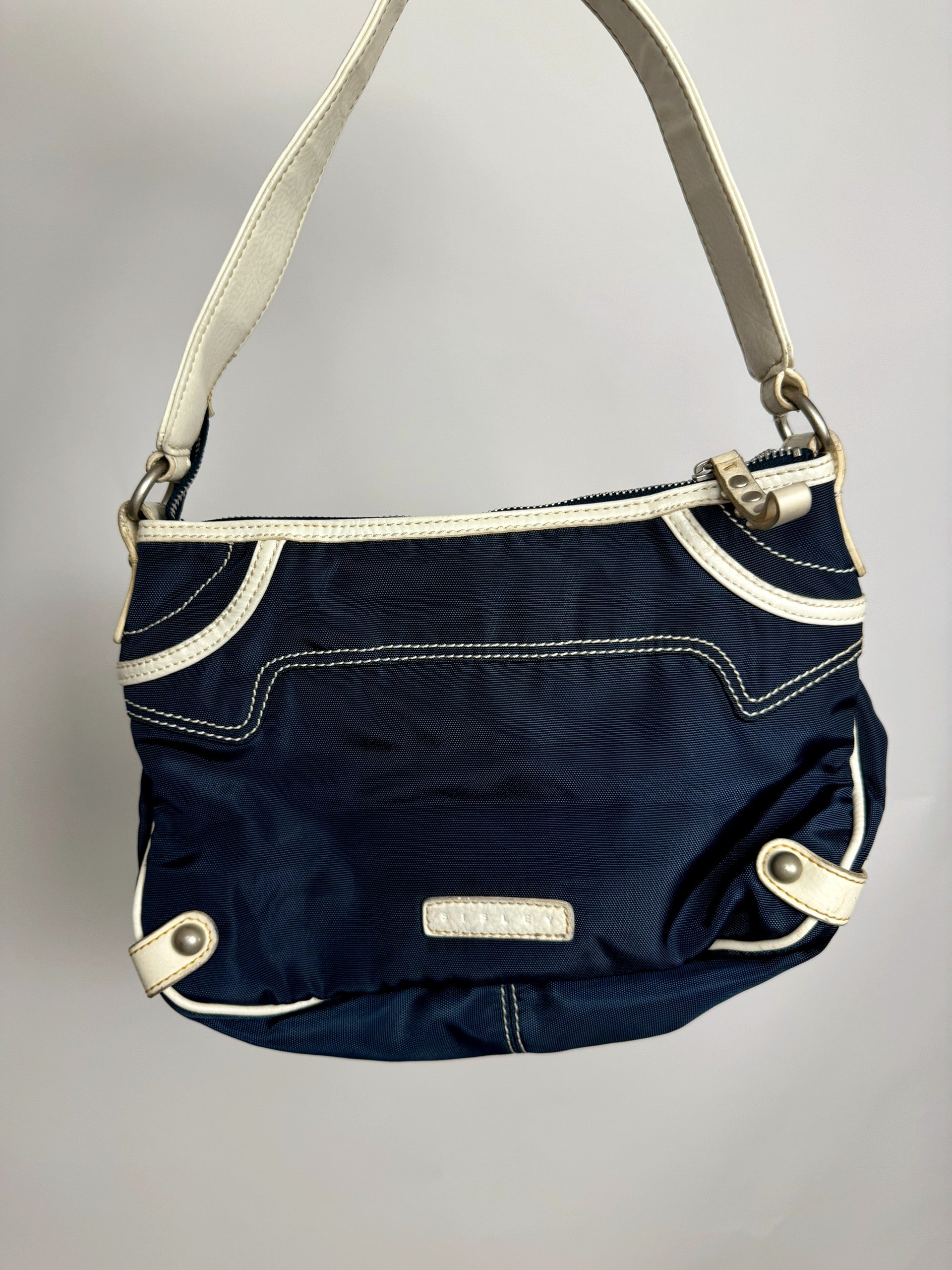 Vintage SISLEY Marineblaue Stofftasche mit cremefarbenen Details