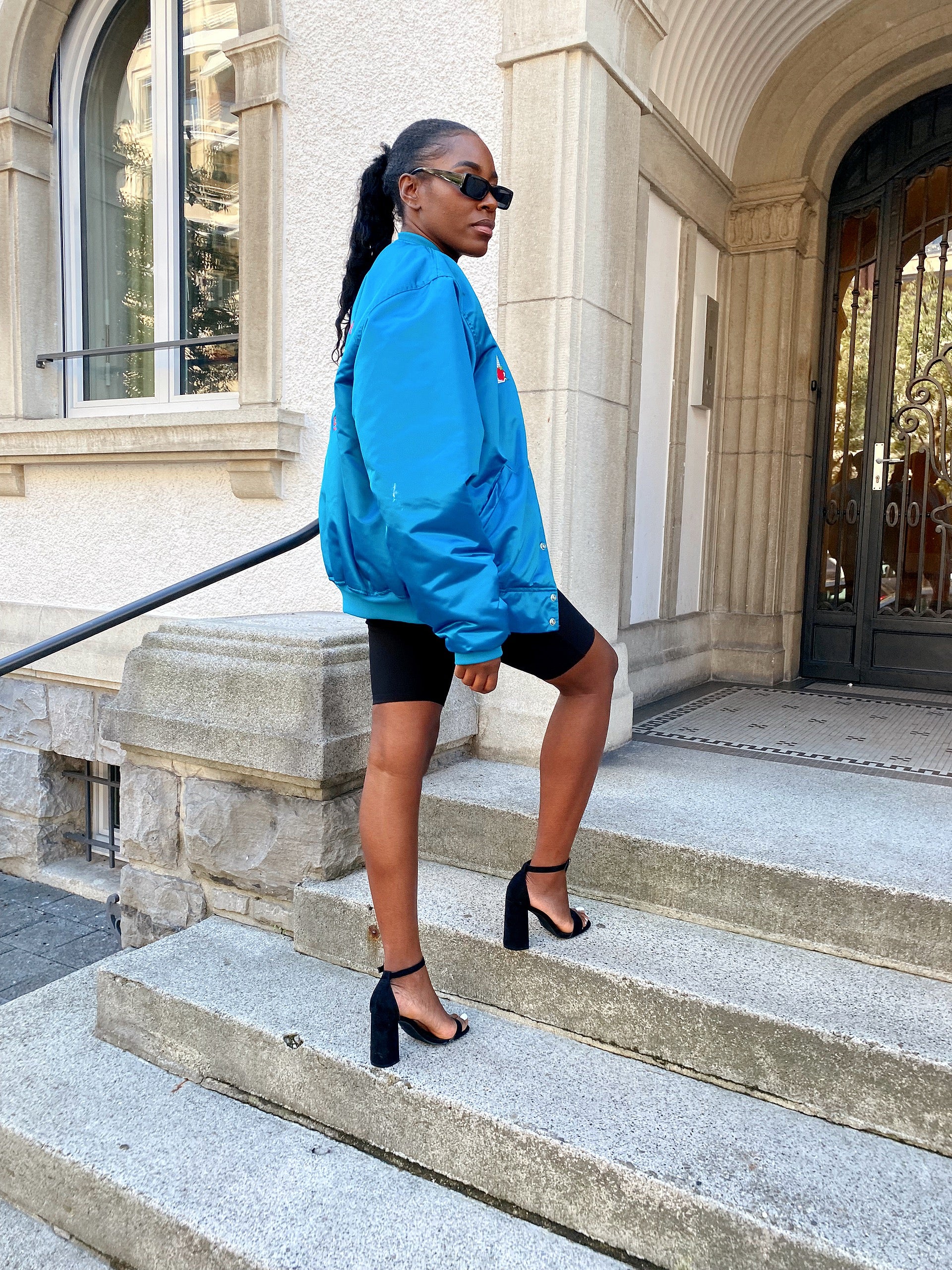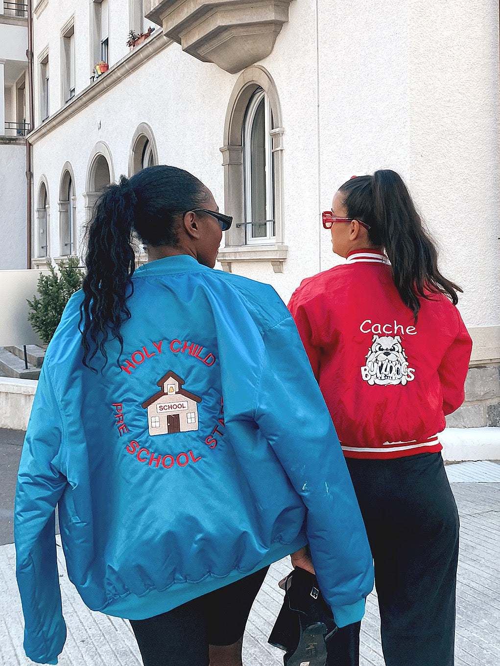 Seltene türkisfarbene Holy Child XL übergroße bestickte Bomberjacke