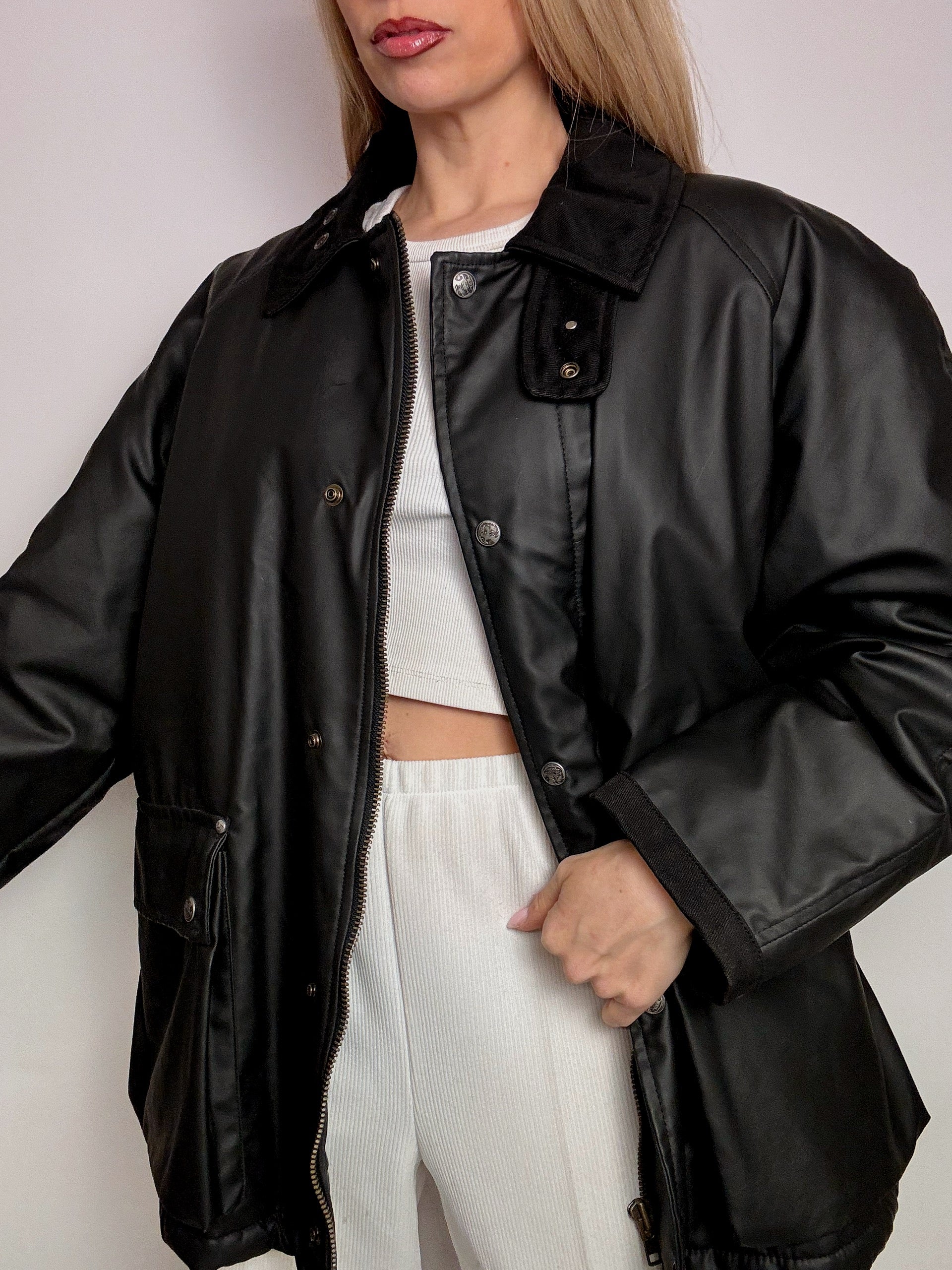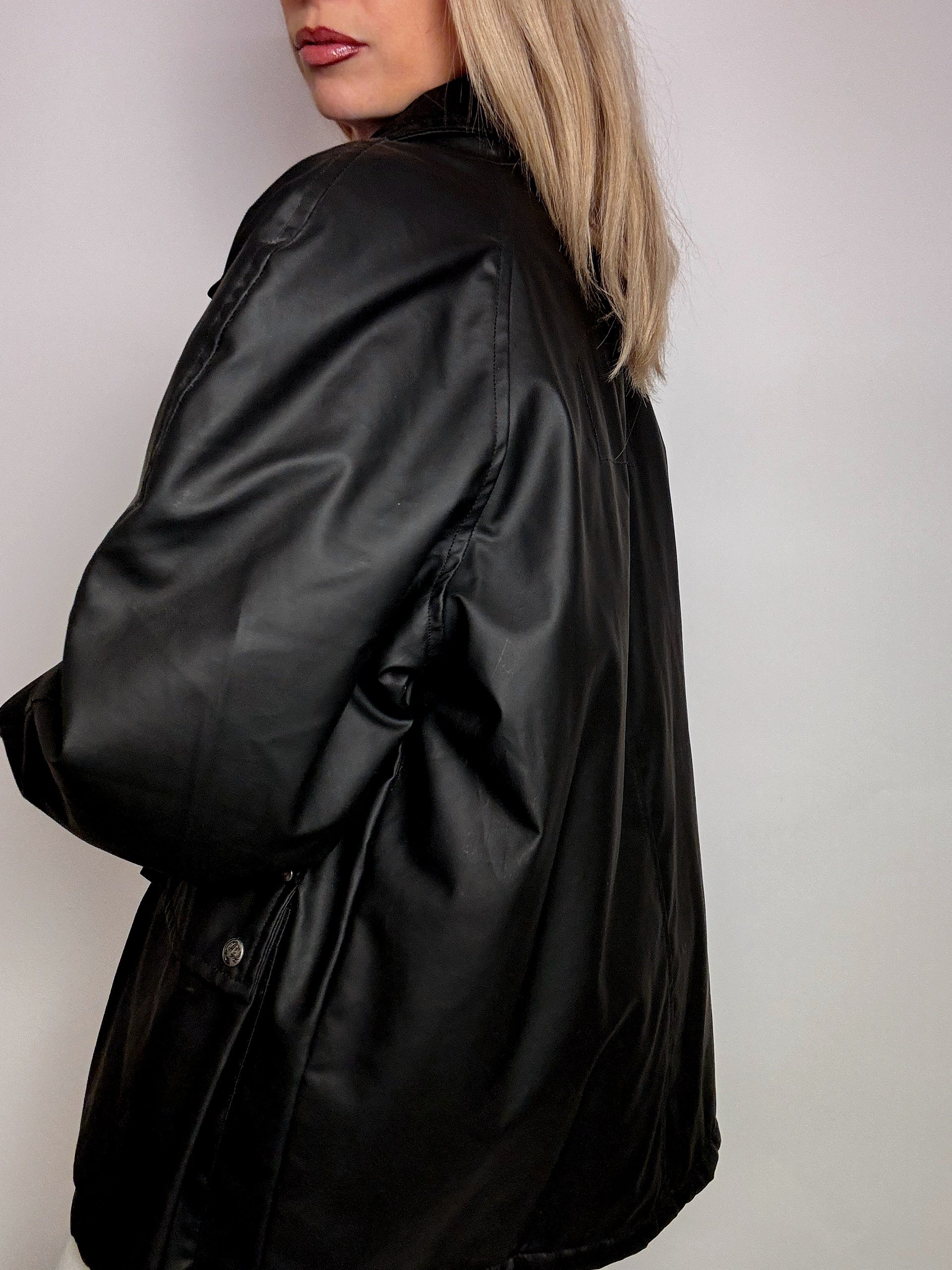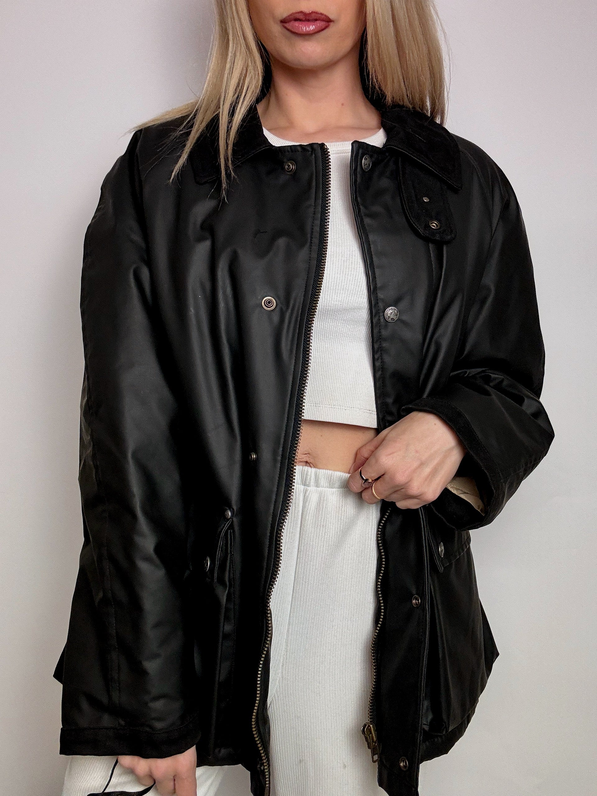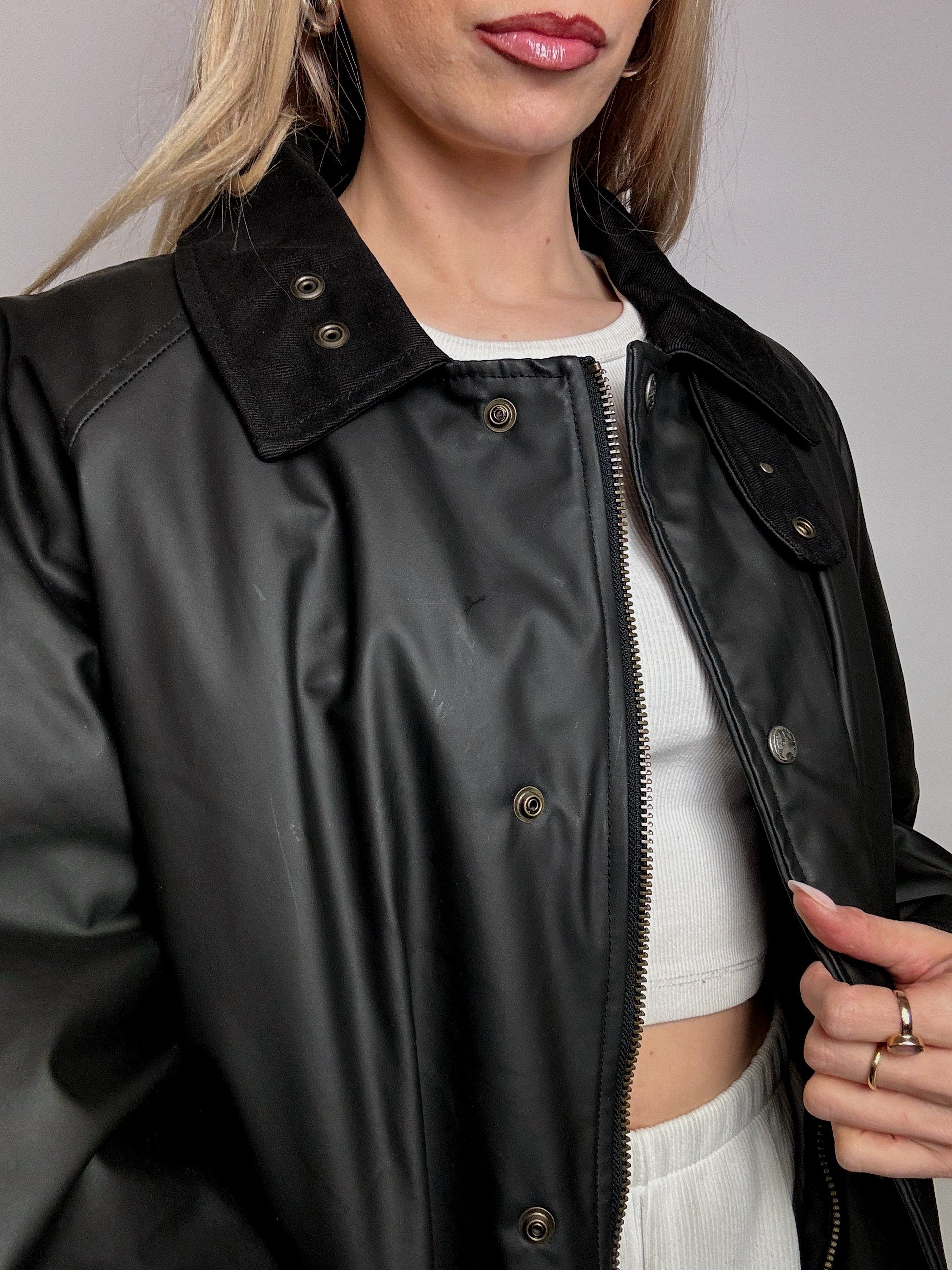 Es ist gerade geschnitten und reicht etwa bis zum Gesäß. Die gewachste Oberfläche erinnert uns an die kleinen Regenmäntel, die wir als Kinder hatten!