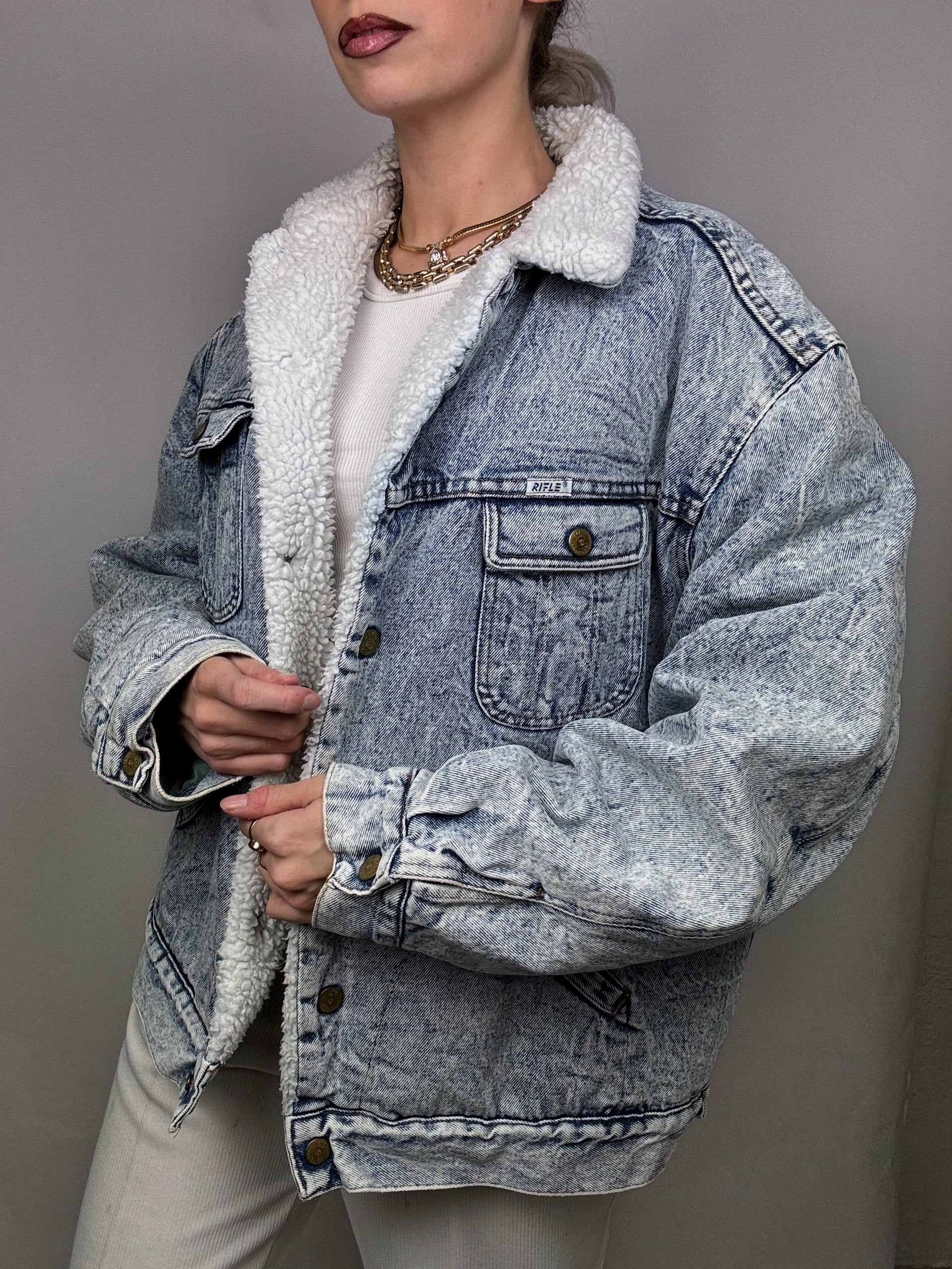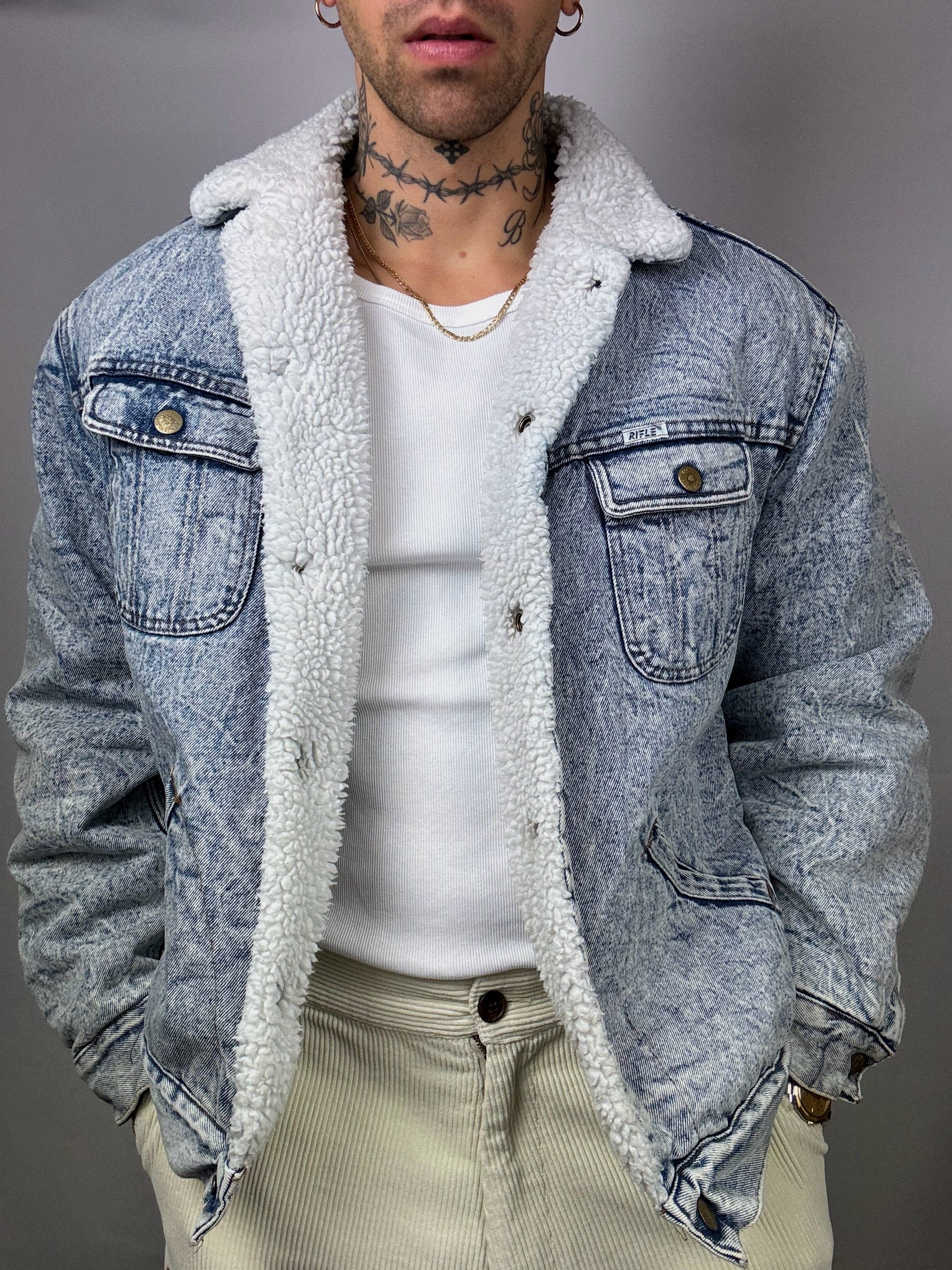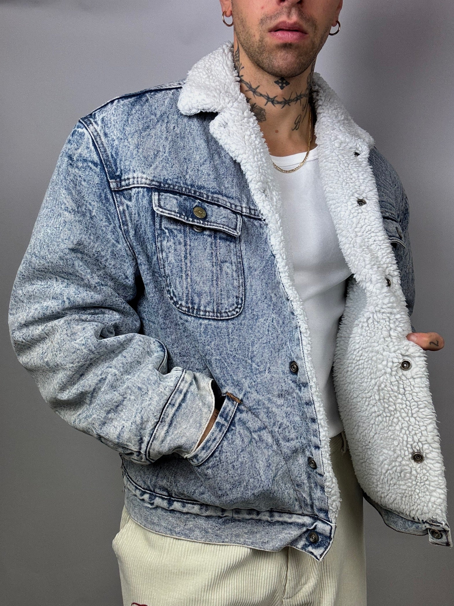 Vintage L/XL gewaschene Lammfell-Jeansjacke