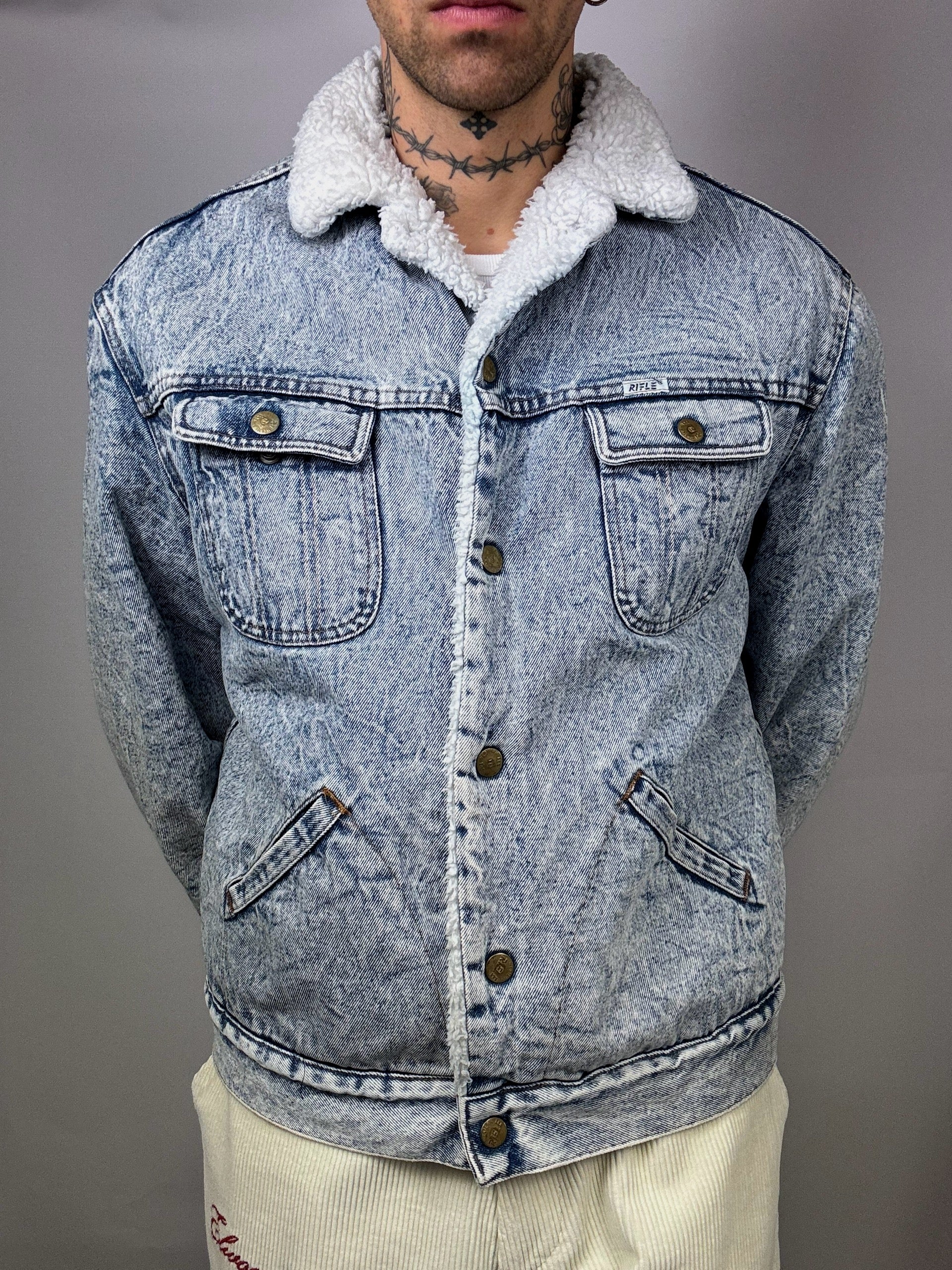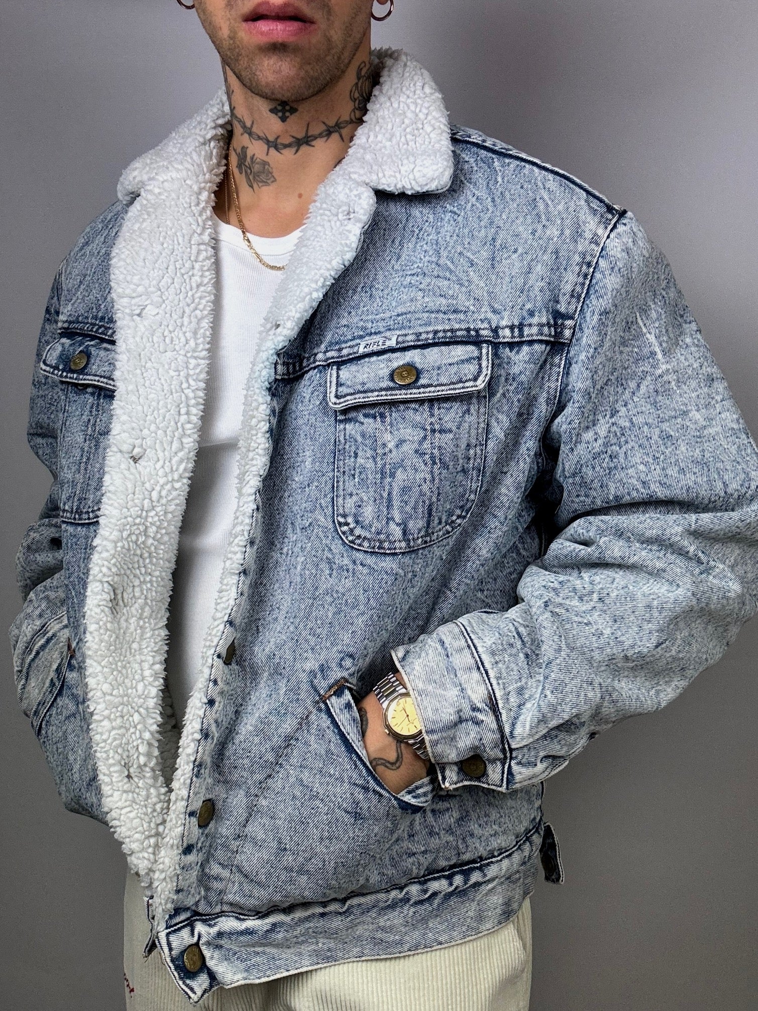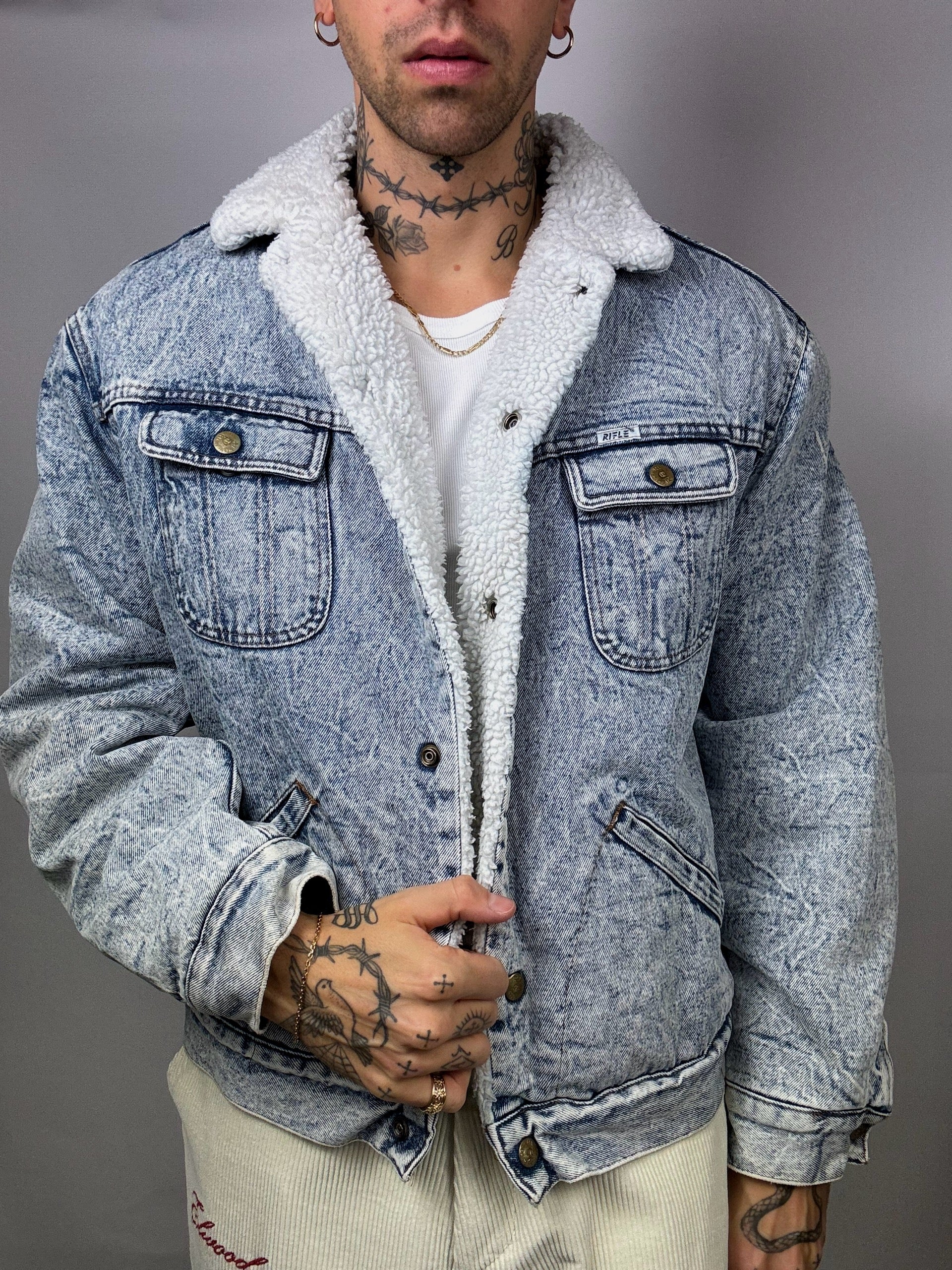 Vintage L/XL gewaschene Lammfell-Jeansjacke