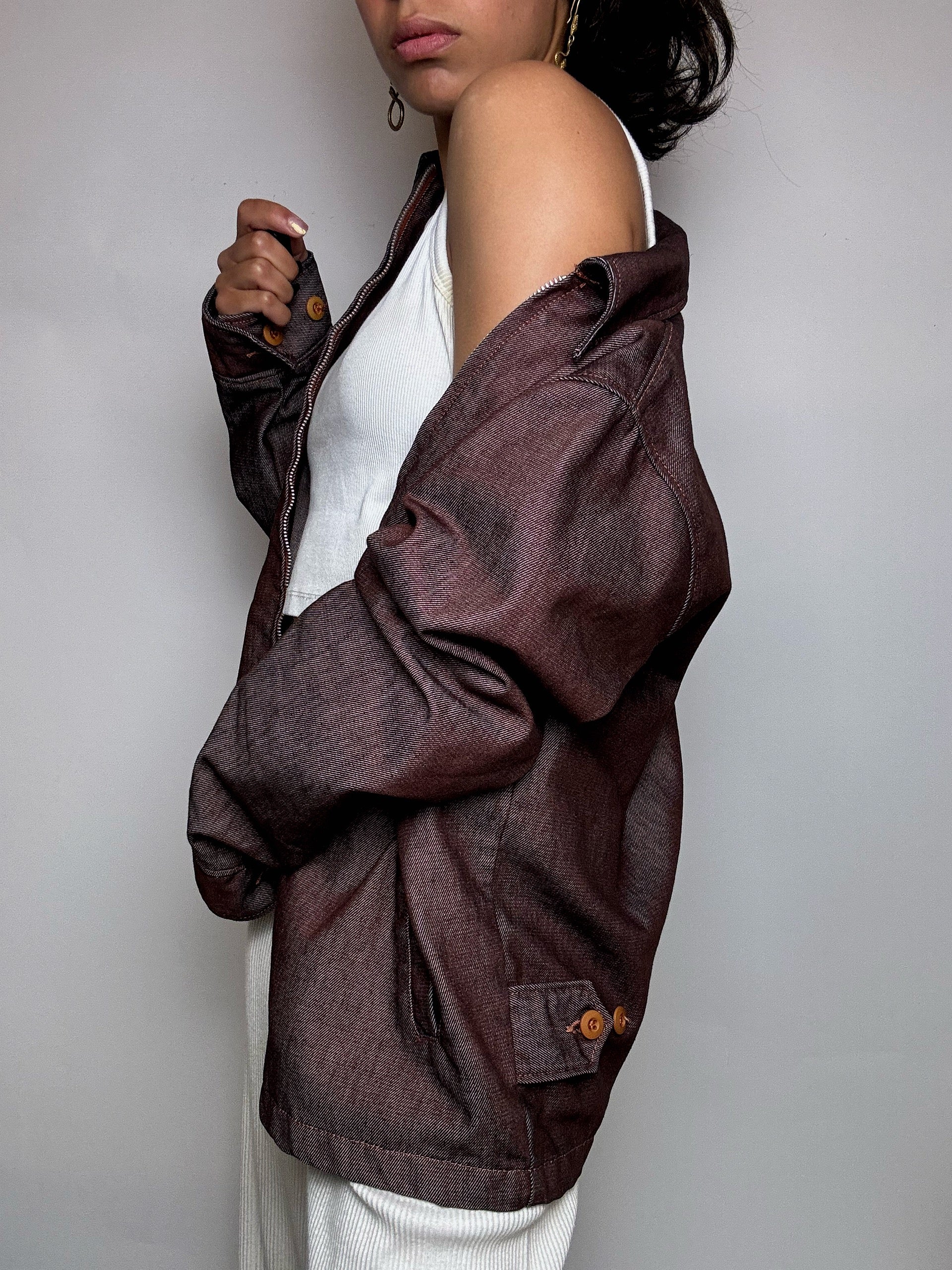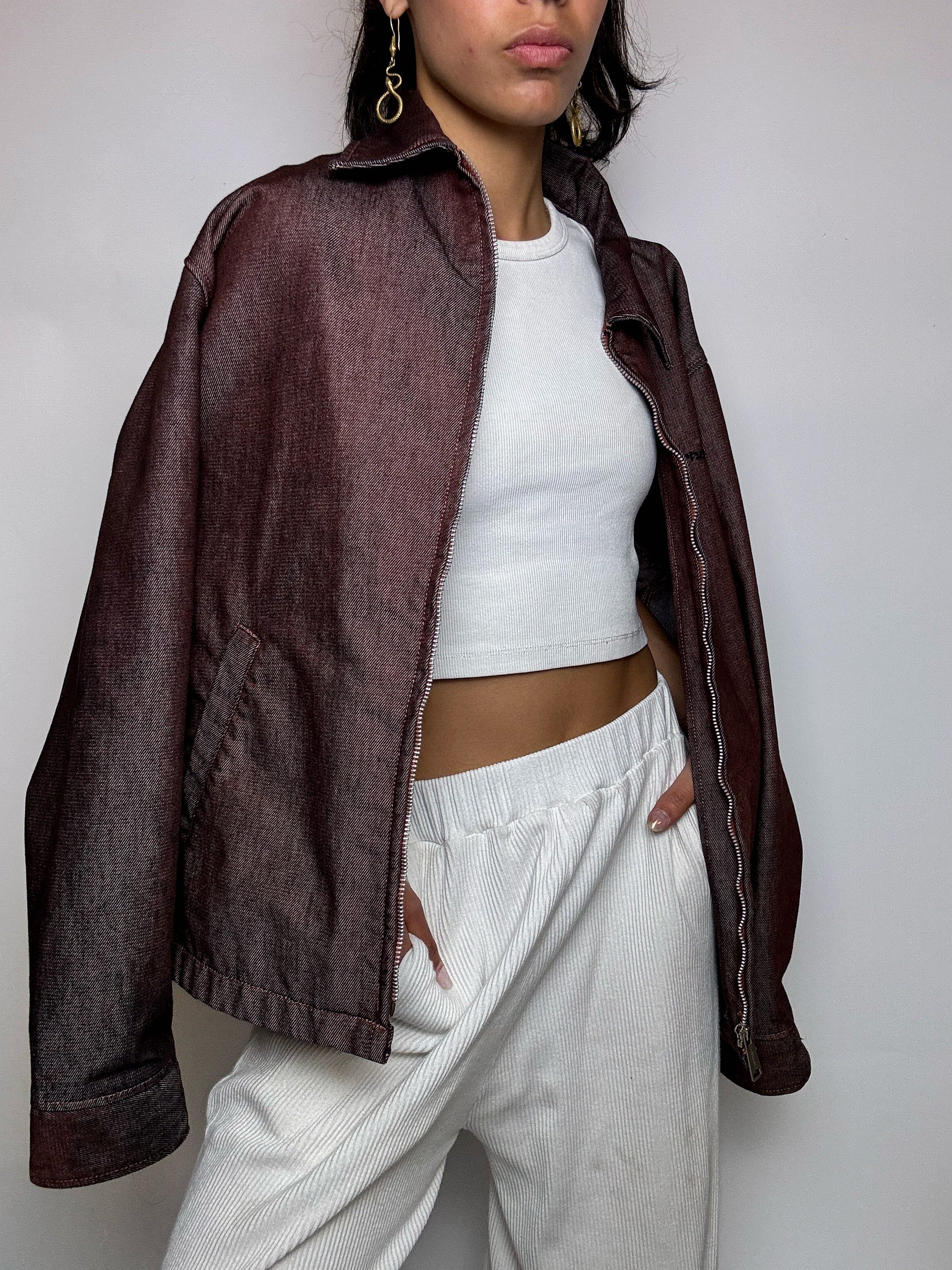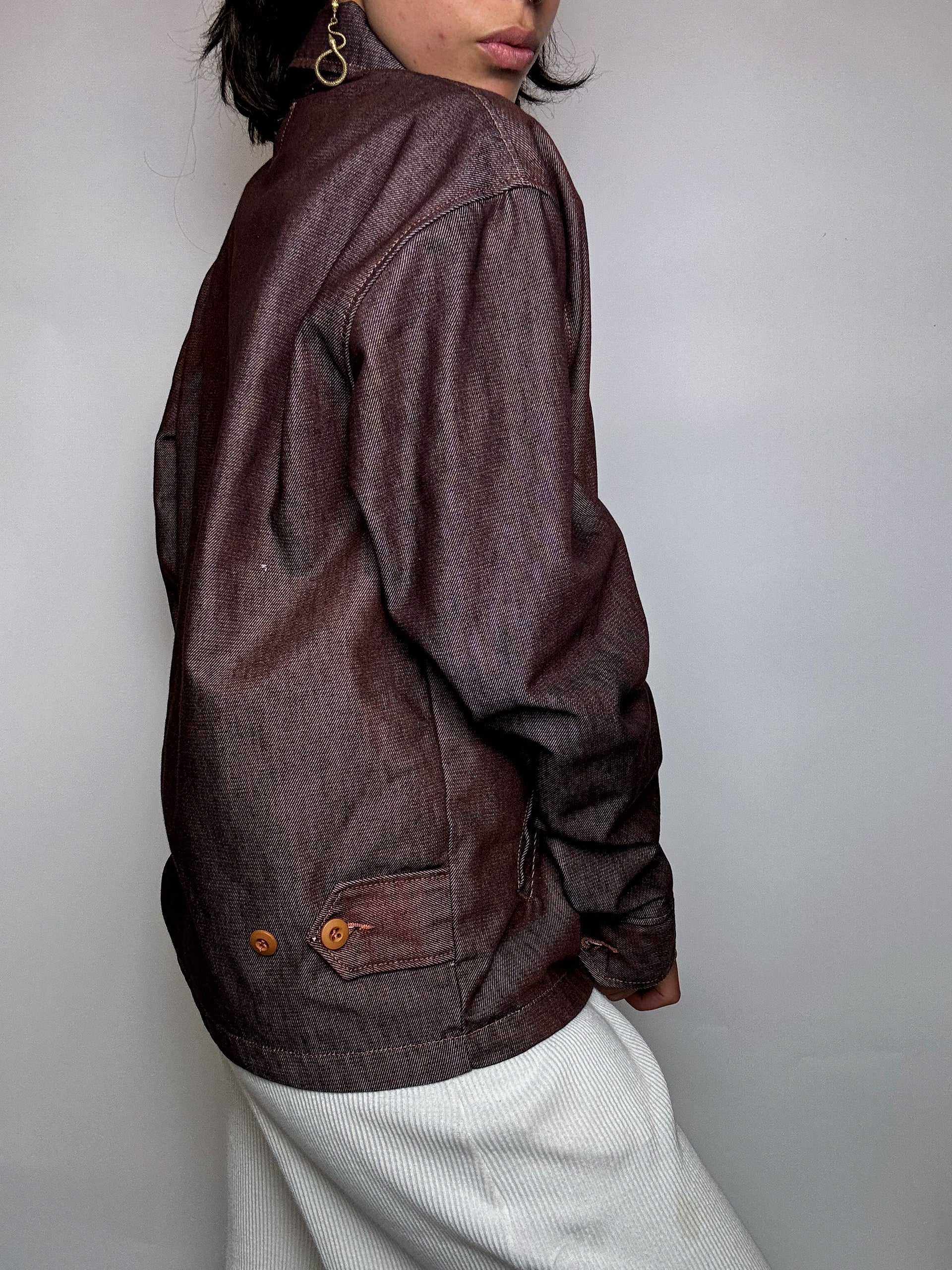 Son tissu est rigide ( comme du denim ) et elle est chinée bordeaux.
