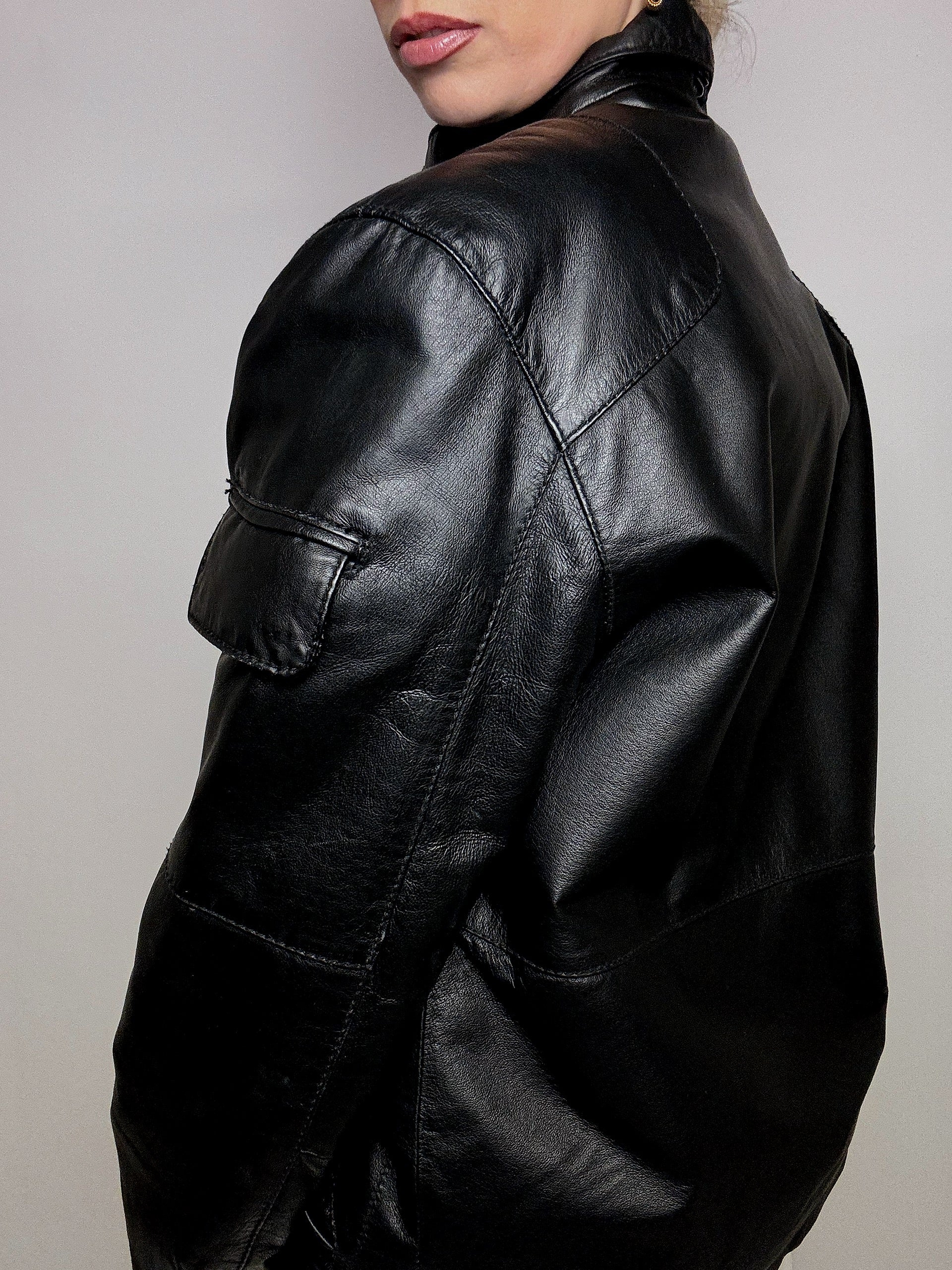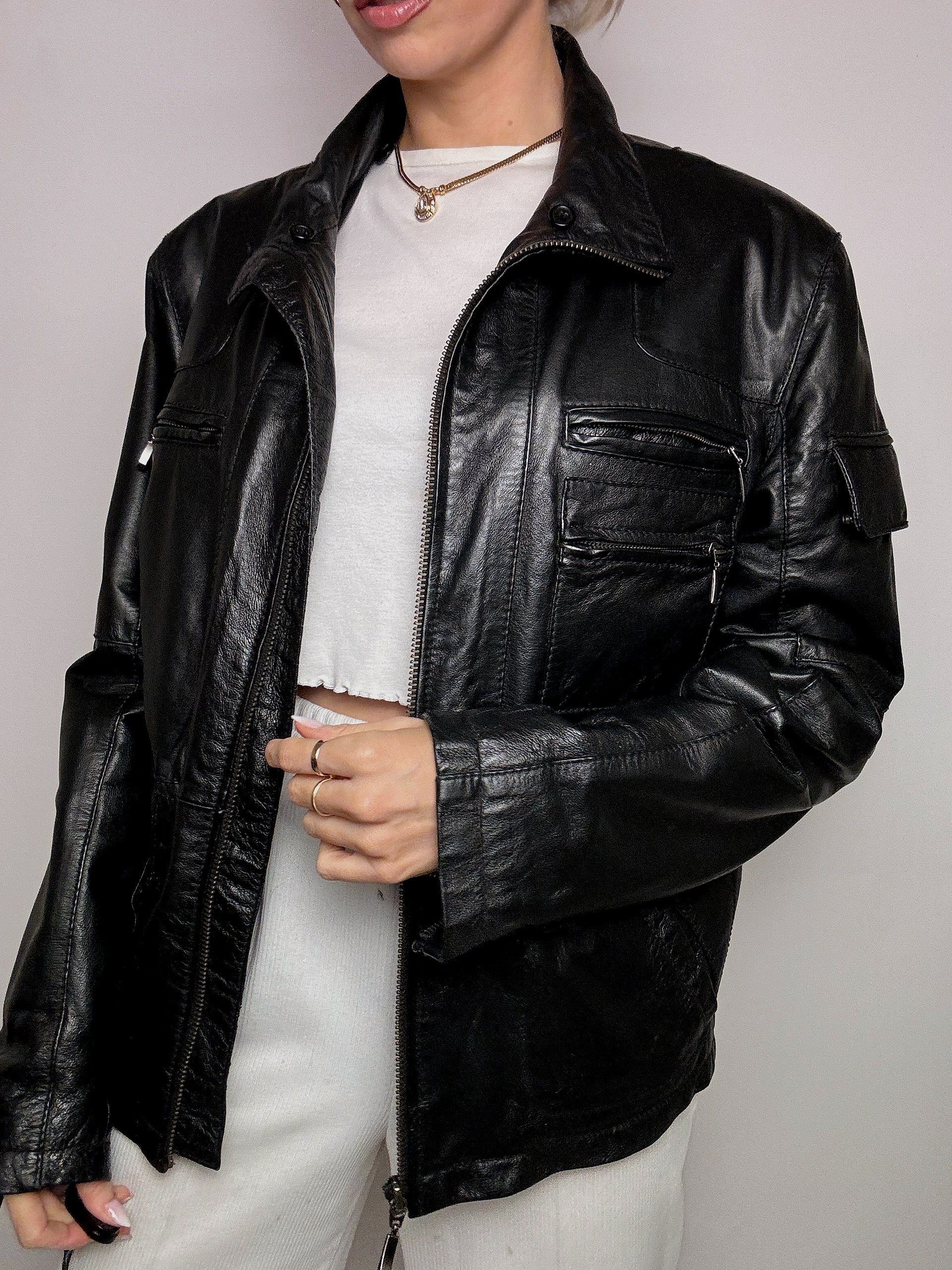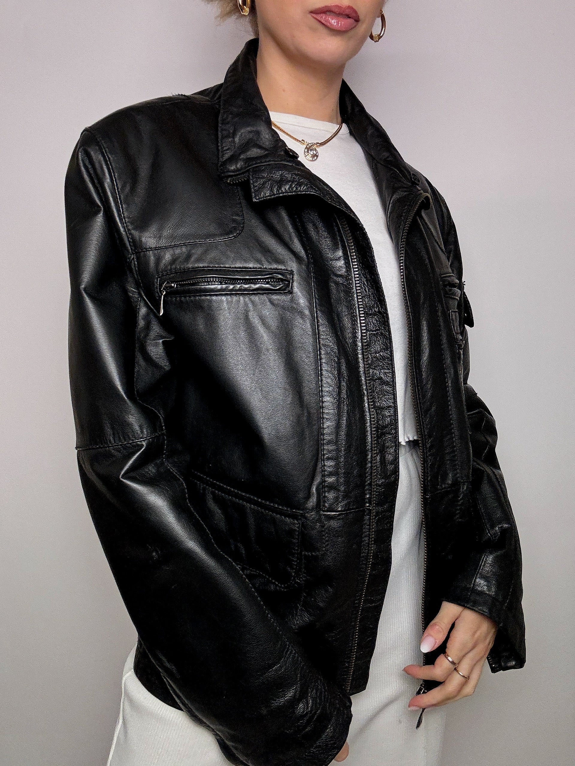 Klassischer gerader Schnitt aus glänzendem Leder, es hat diese leicht androgyne Seite, die wir lieben!