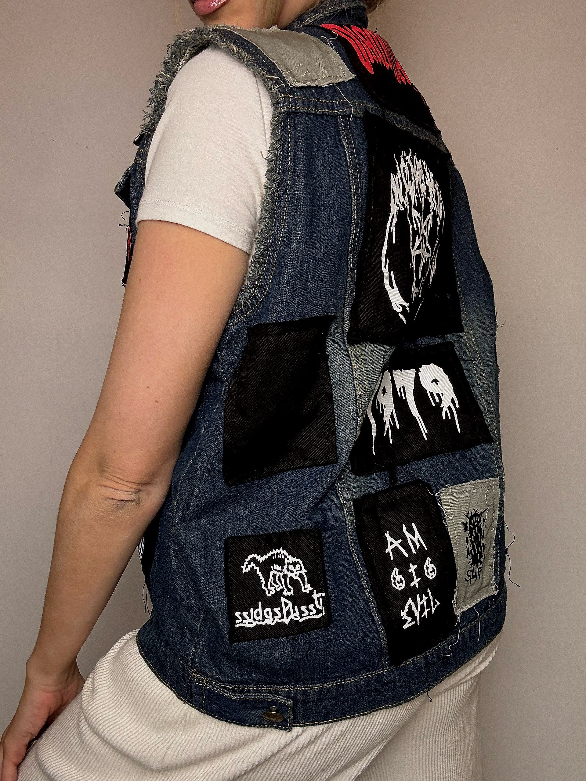 Elle a plusieurs patchs de différents groupes de metal sur toute la piece et le dos