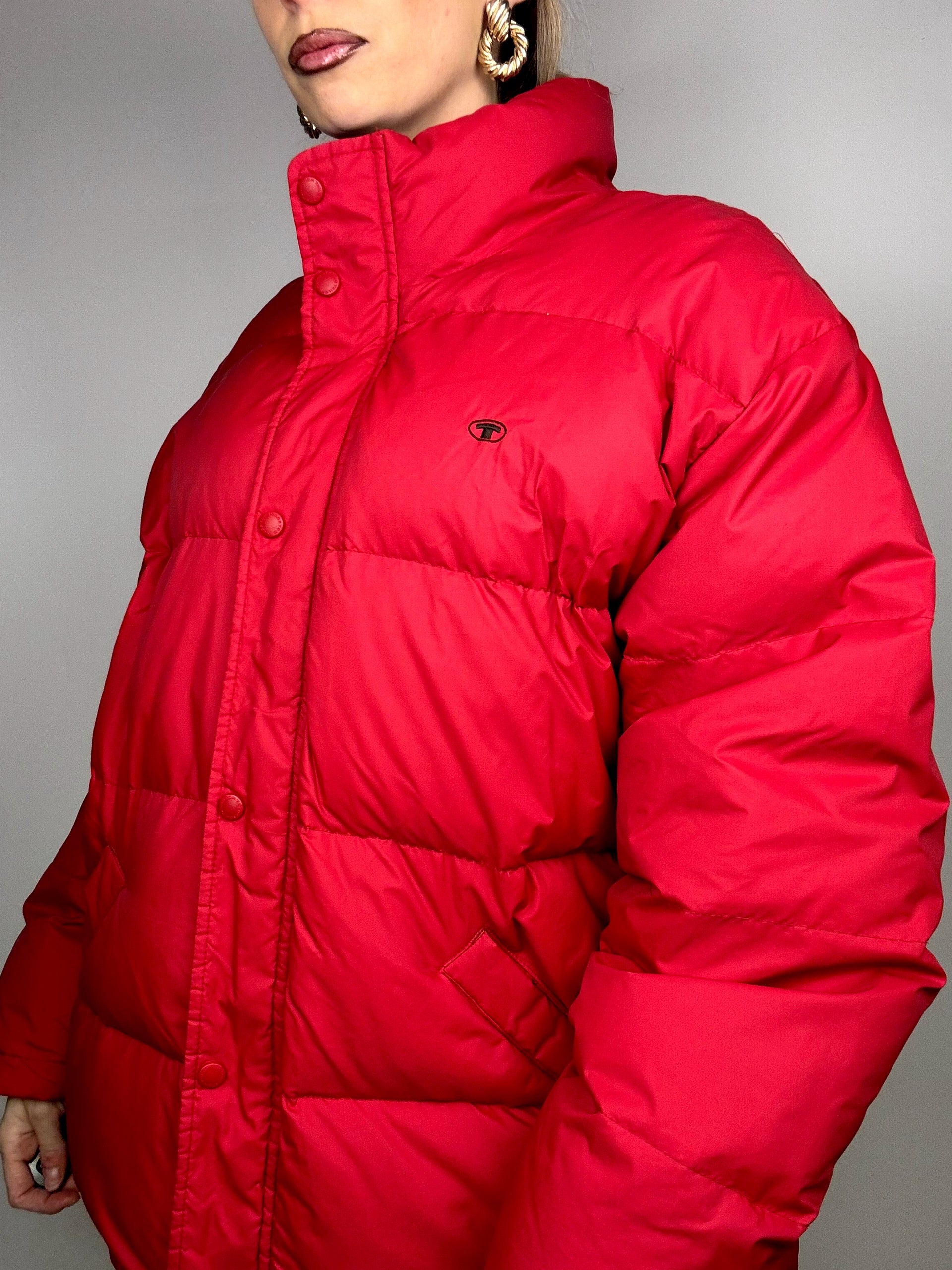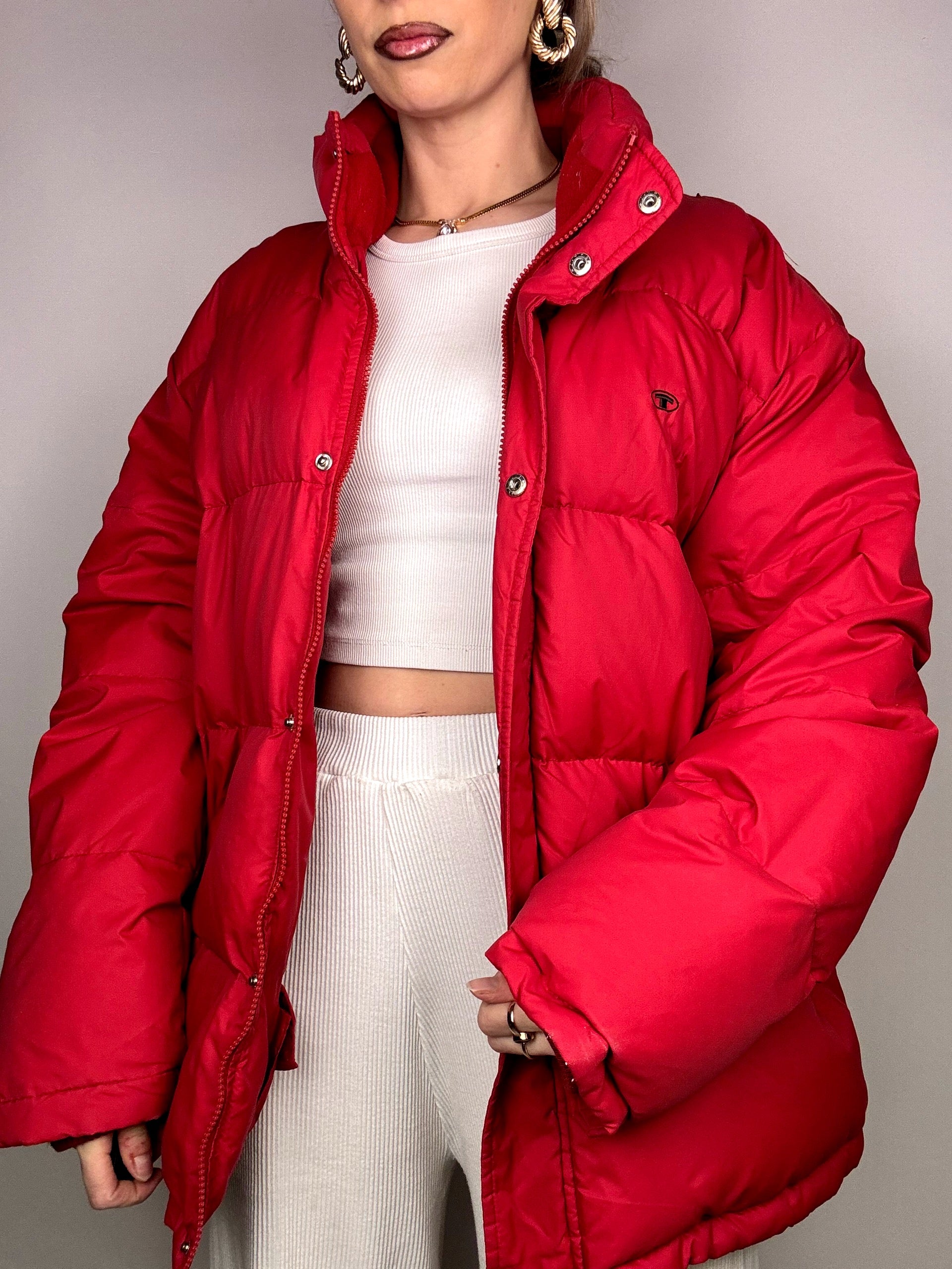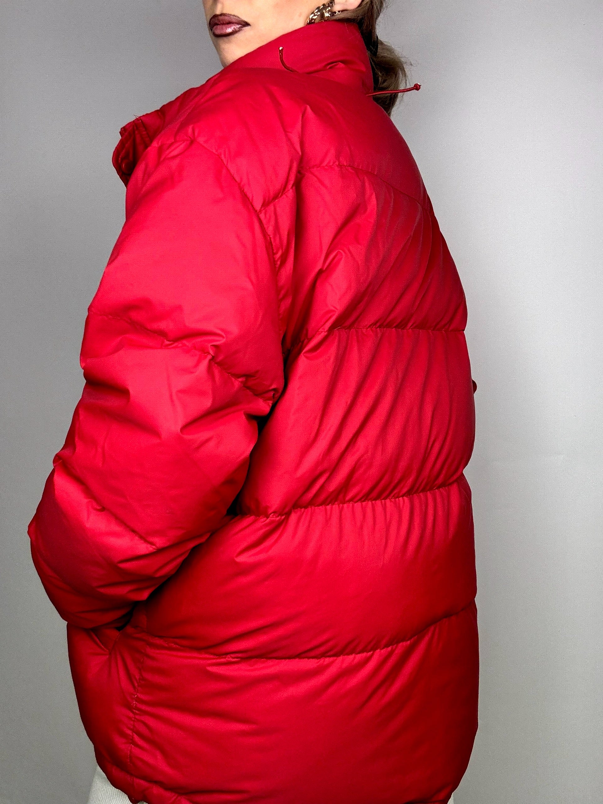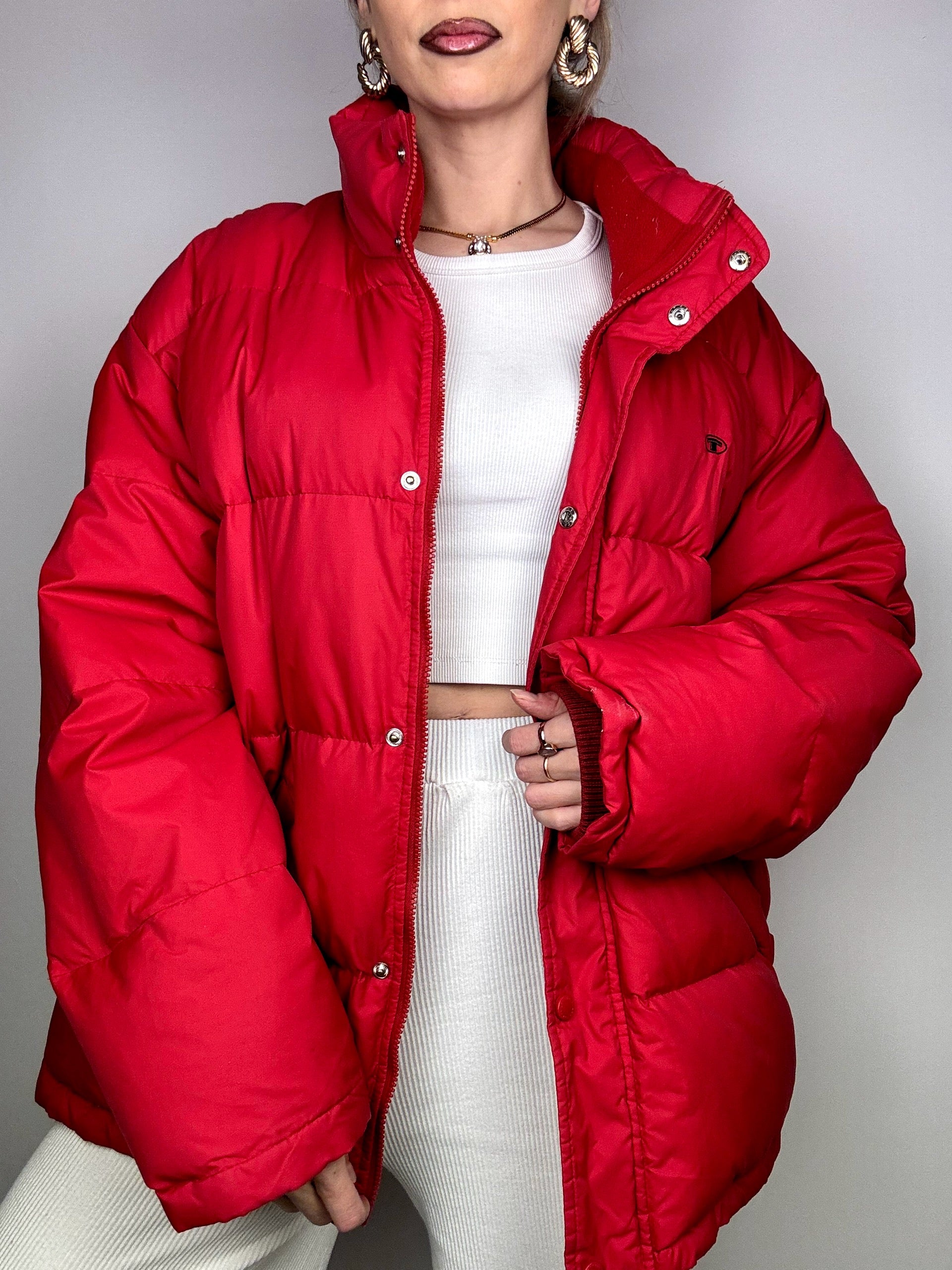 A very puffy down jacket, truly on trend this winter. It's rather simple, with a straight cut, drawstrings at the bottom, and a black chest logo.