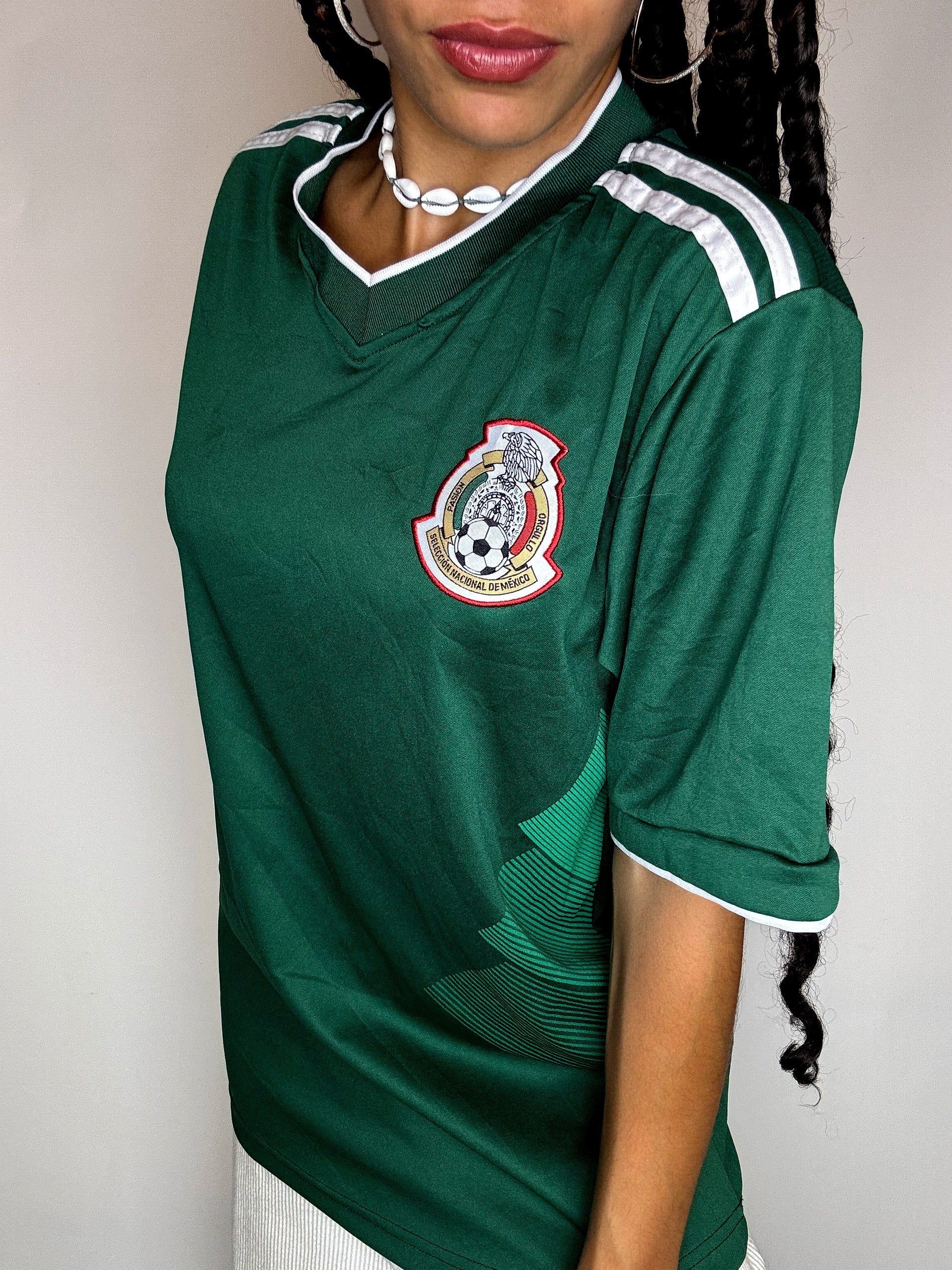 Maillot vert bouteille à manches courtes avec détails blancs, arborant fièrement l’écusson de l’équipe nationale du Mexique. Design classique des modèles portés dans les années 90, avant l’arrivée des sponsors modernes.