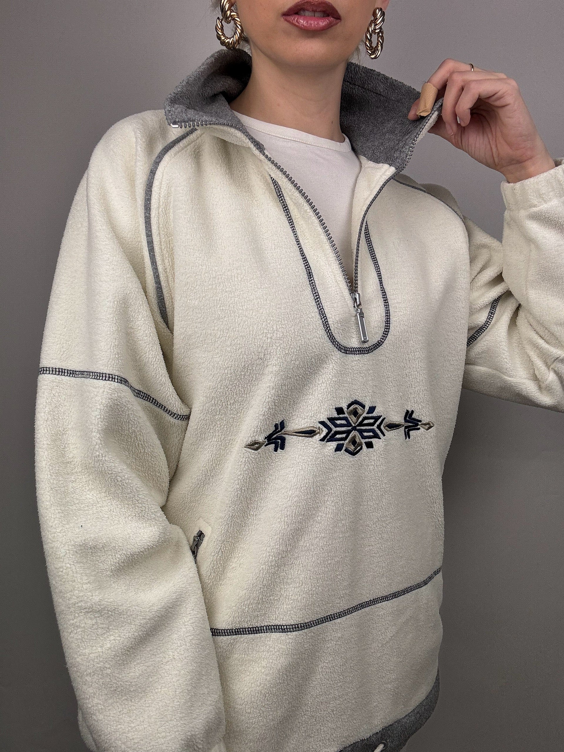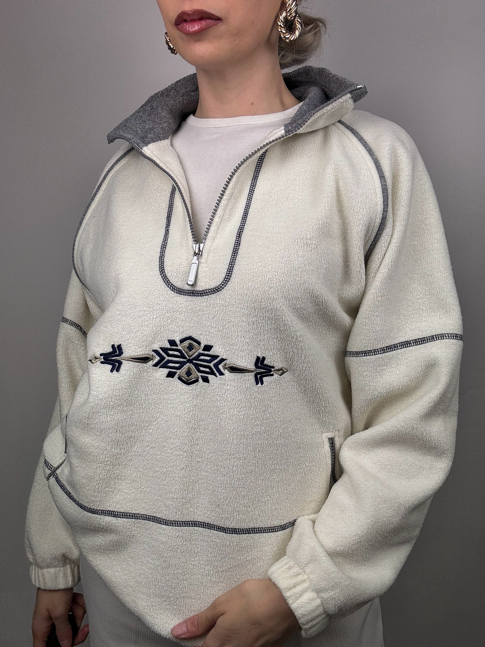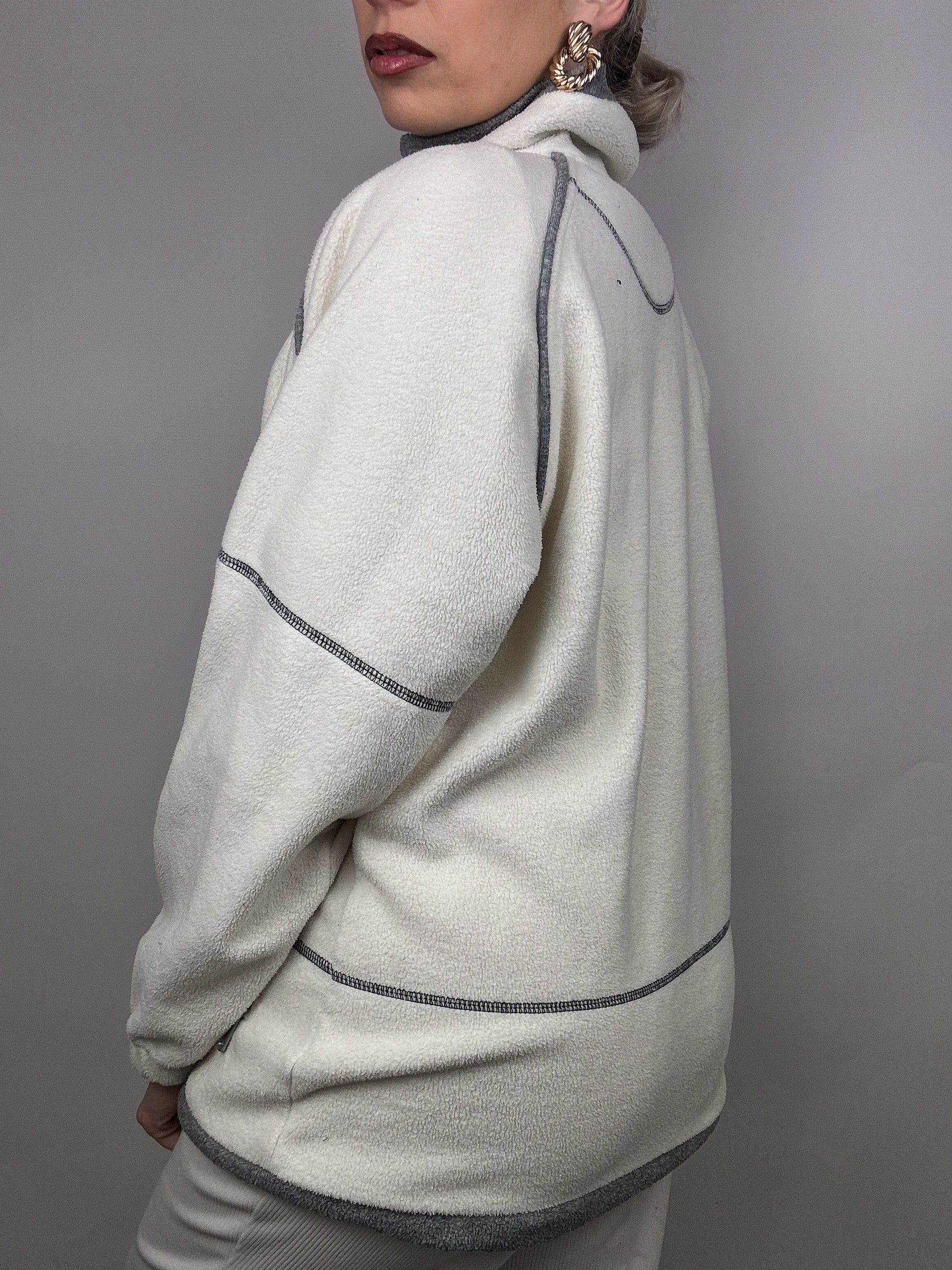 Cream and gray details on the inside of the collar and on the bottom of the piece