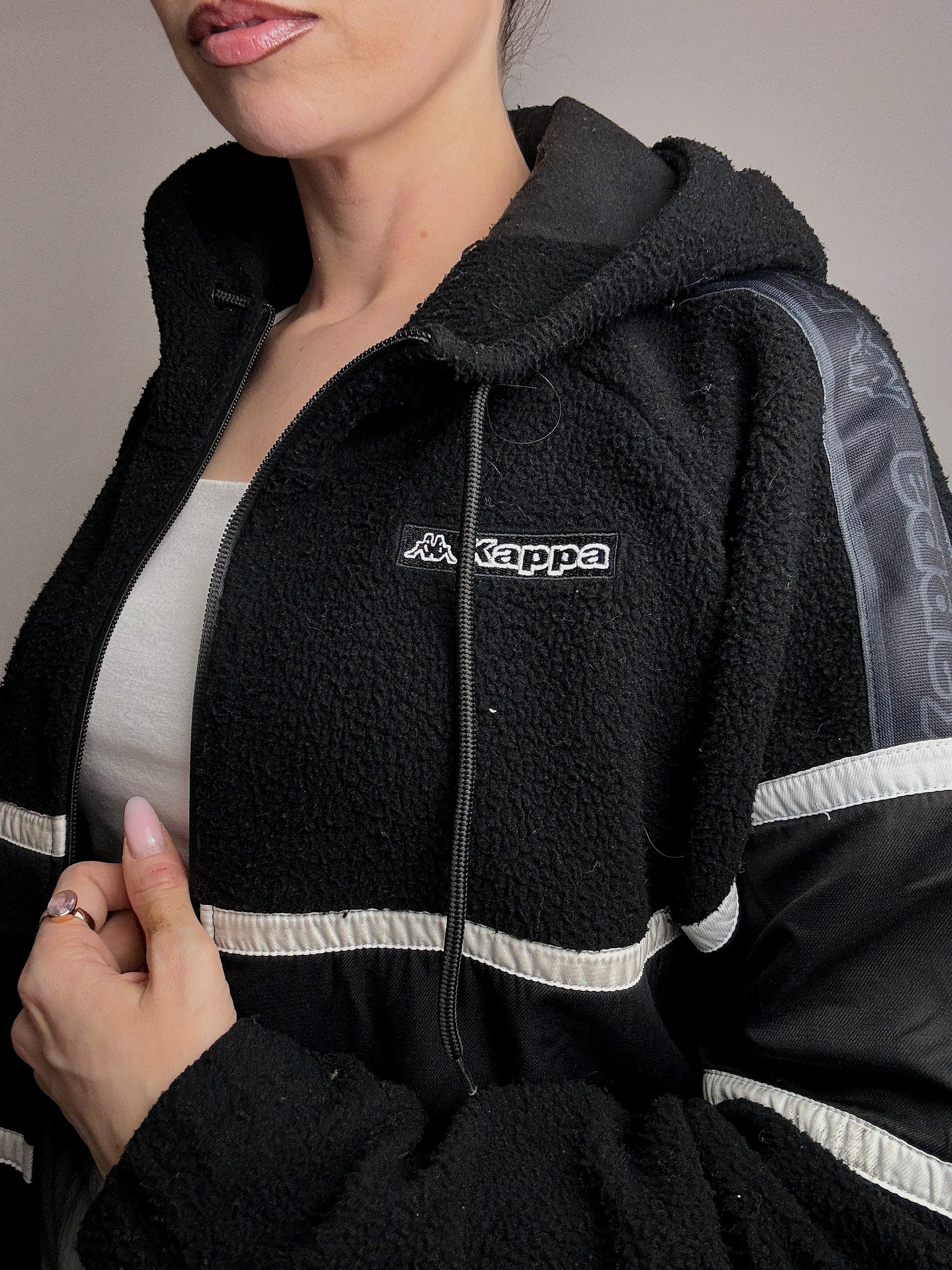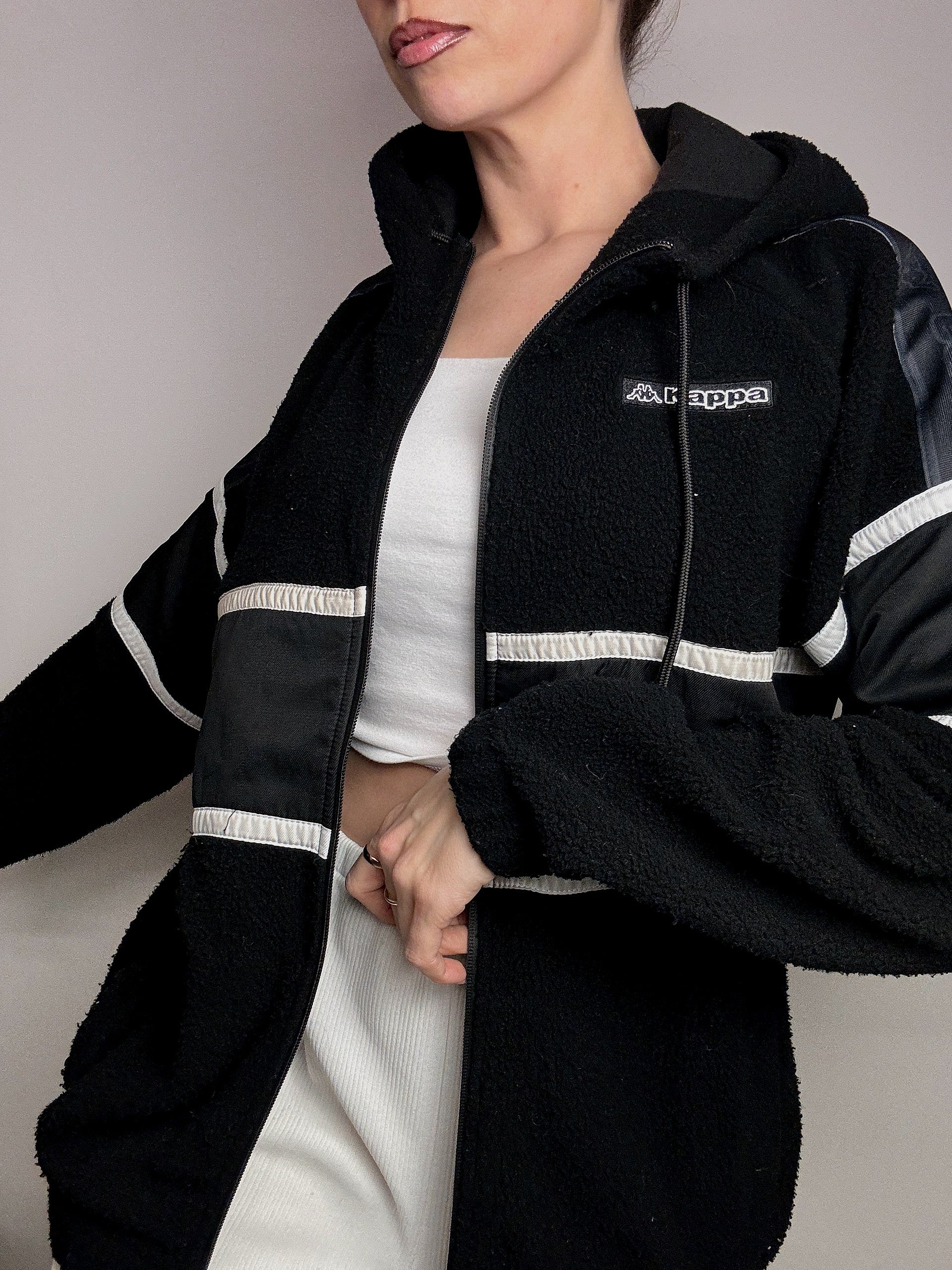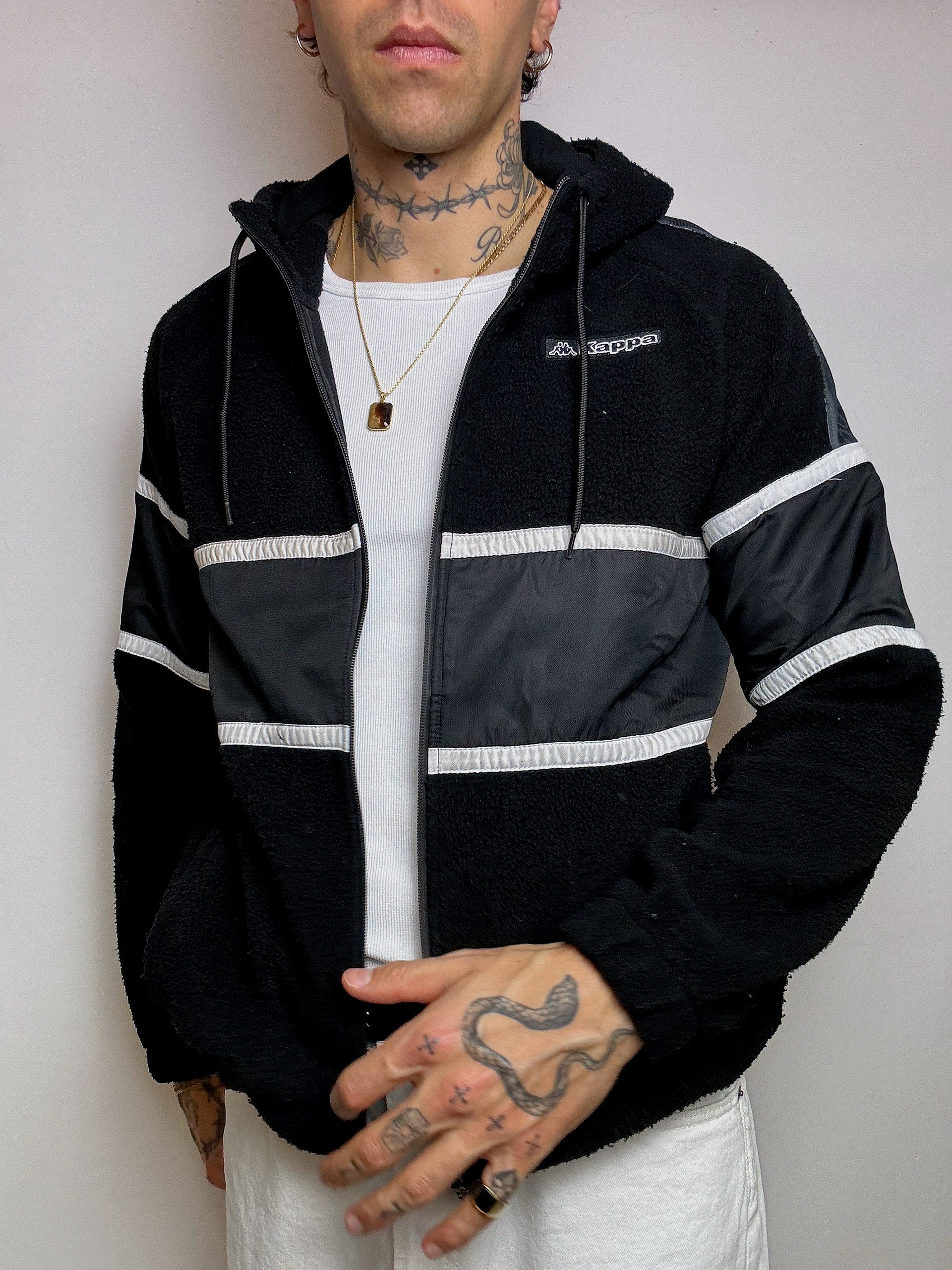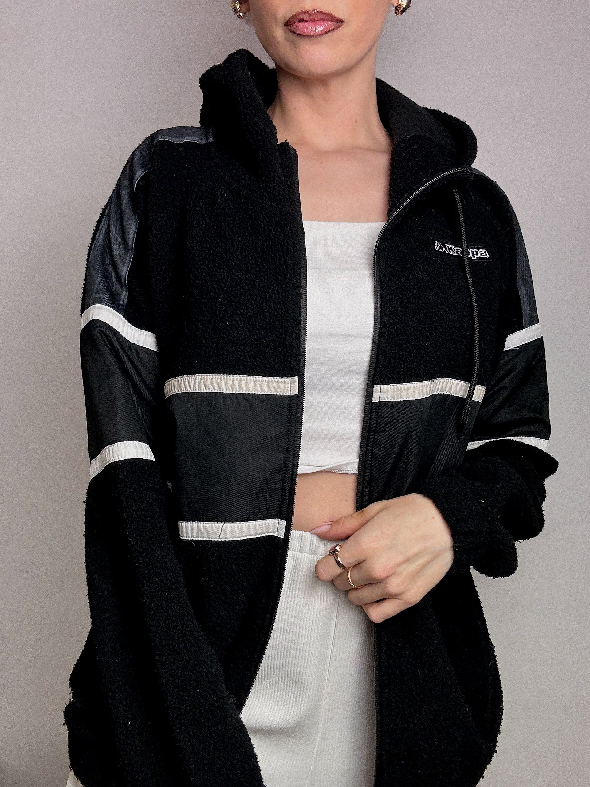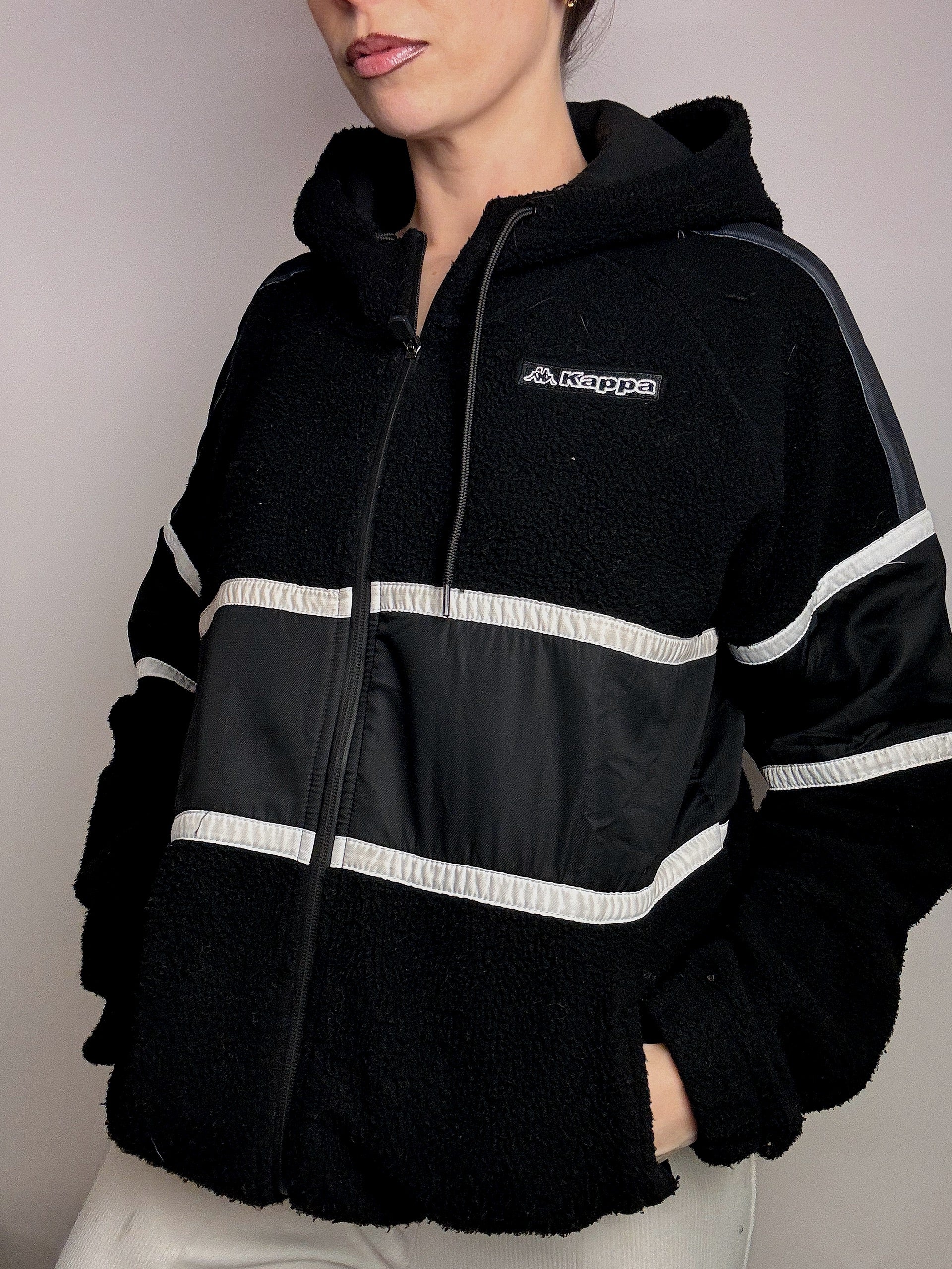 It's black and has a hood; it's definitely the piece that will help you get through the bitter winter cold or accompany you on the slopes!