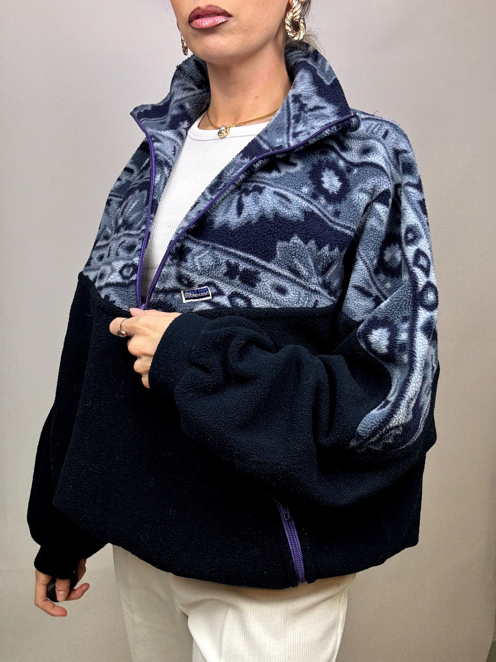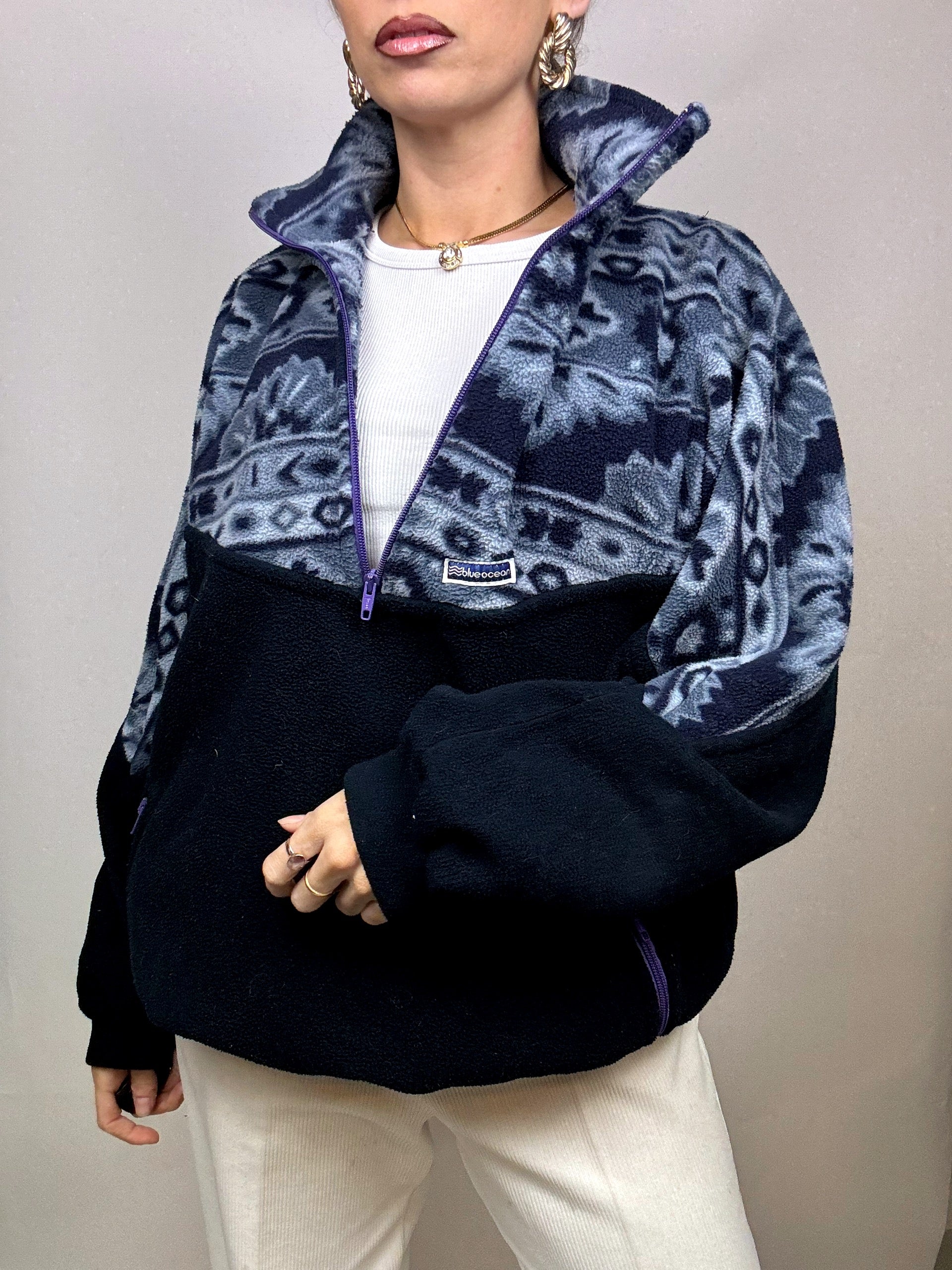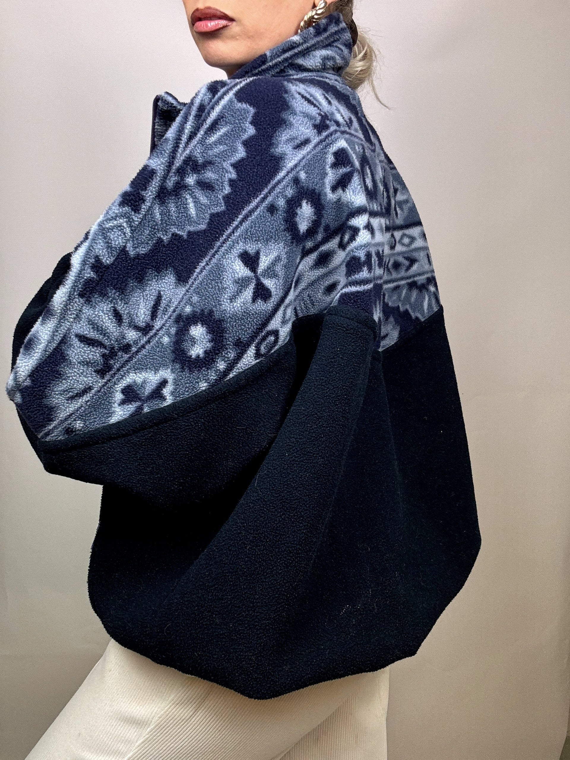 Navy blue with a graphic block print on the top, it has ultra practical zipped pockets!