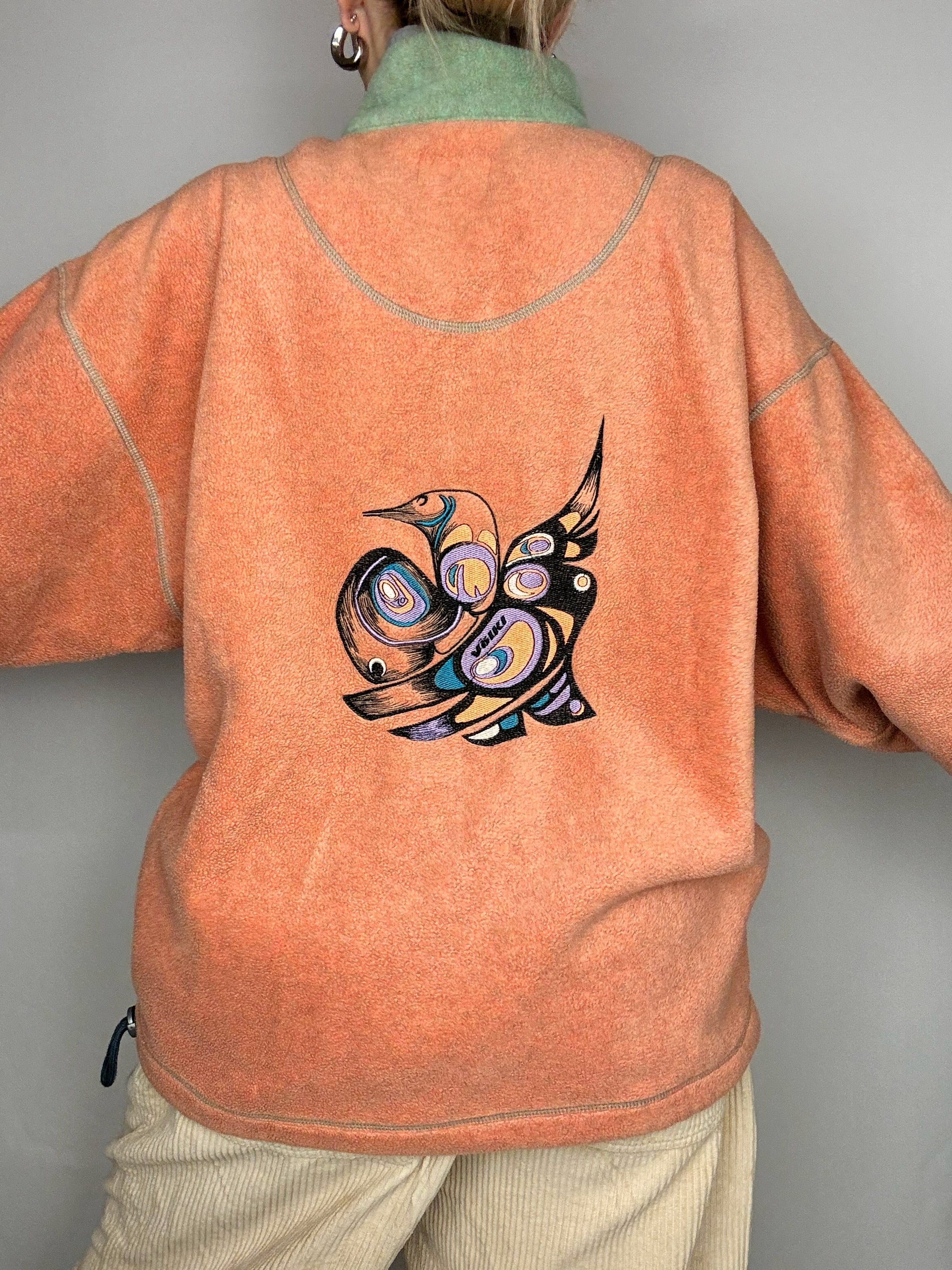 Embroidery on the front and a beautiful graphic peacock on the back!