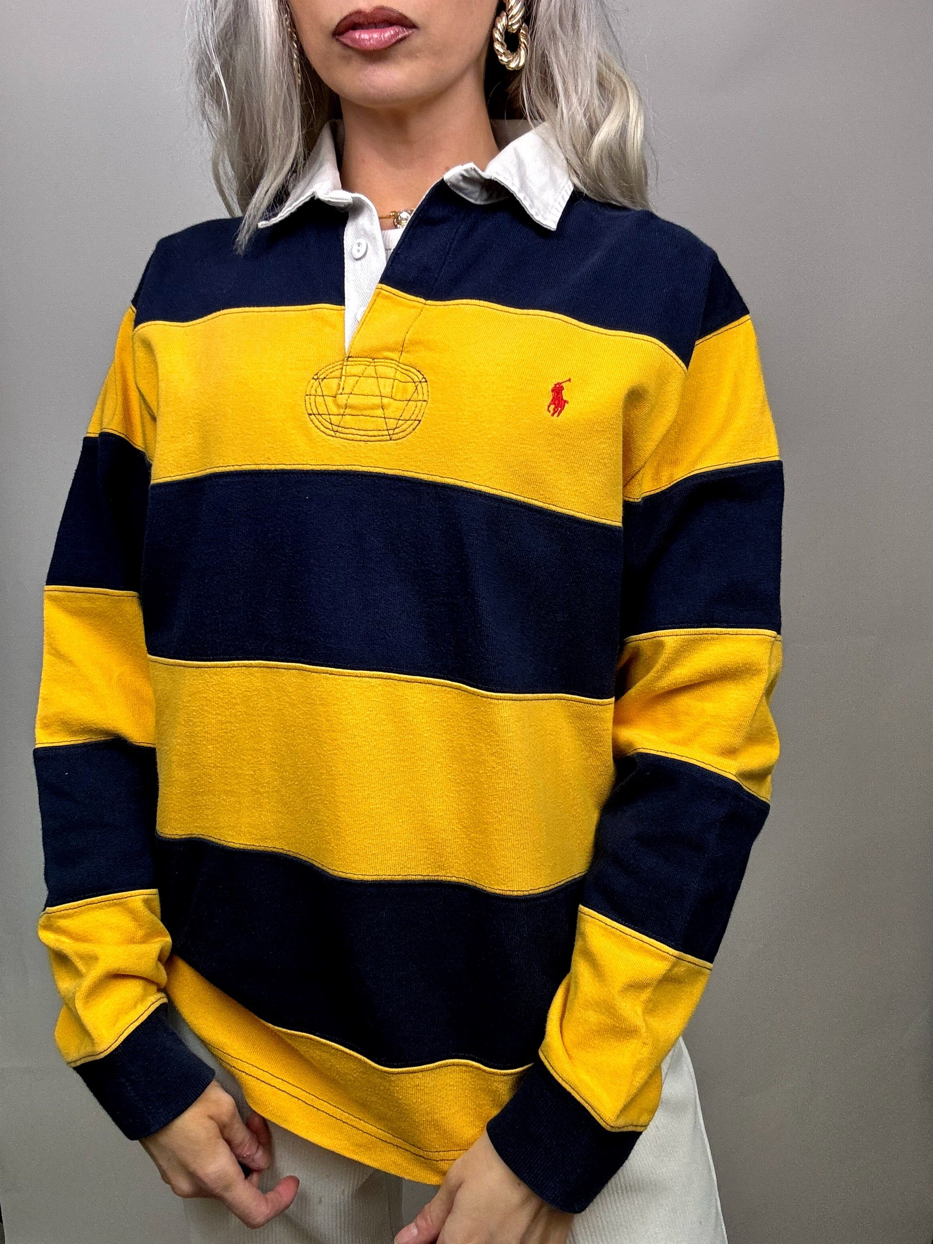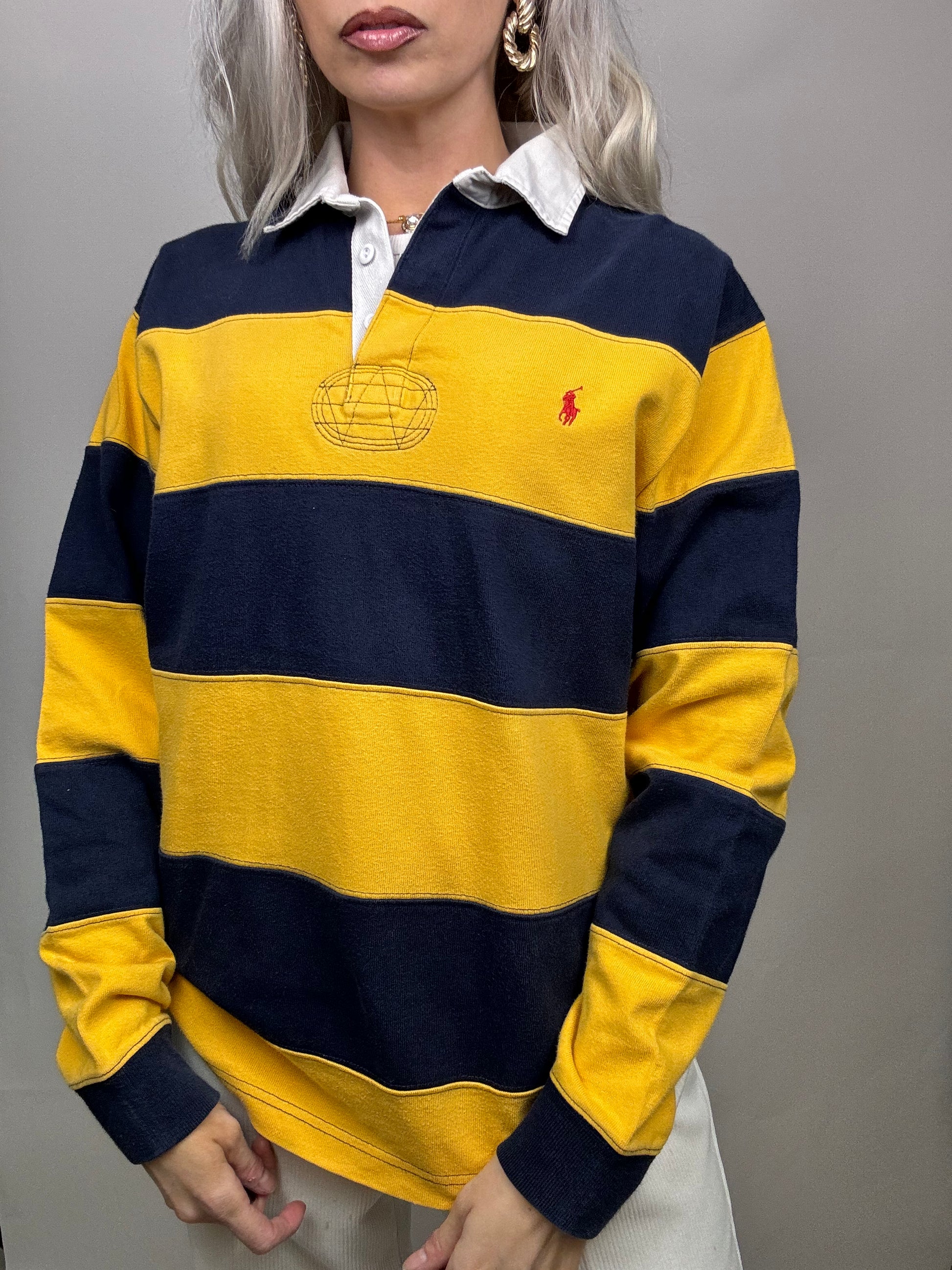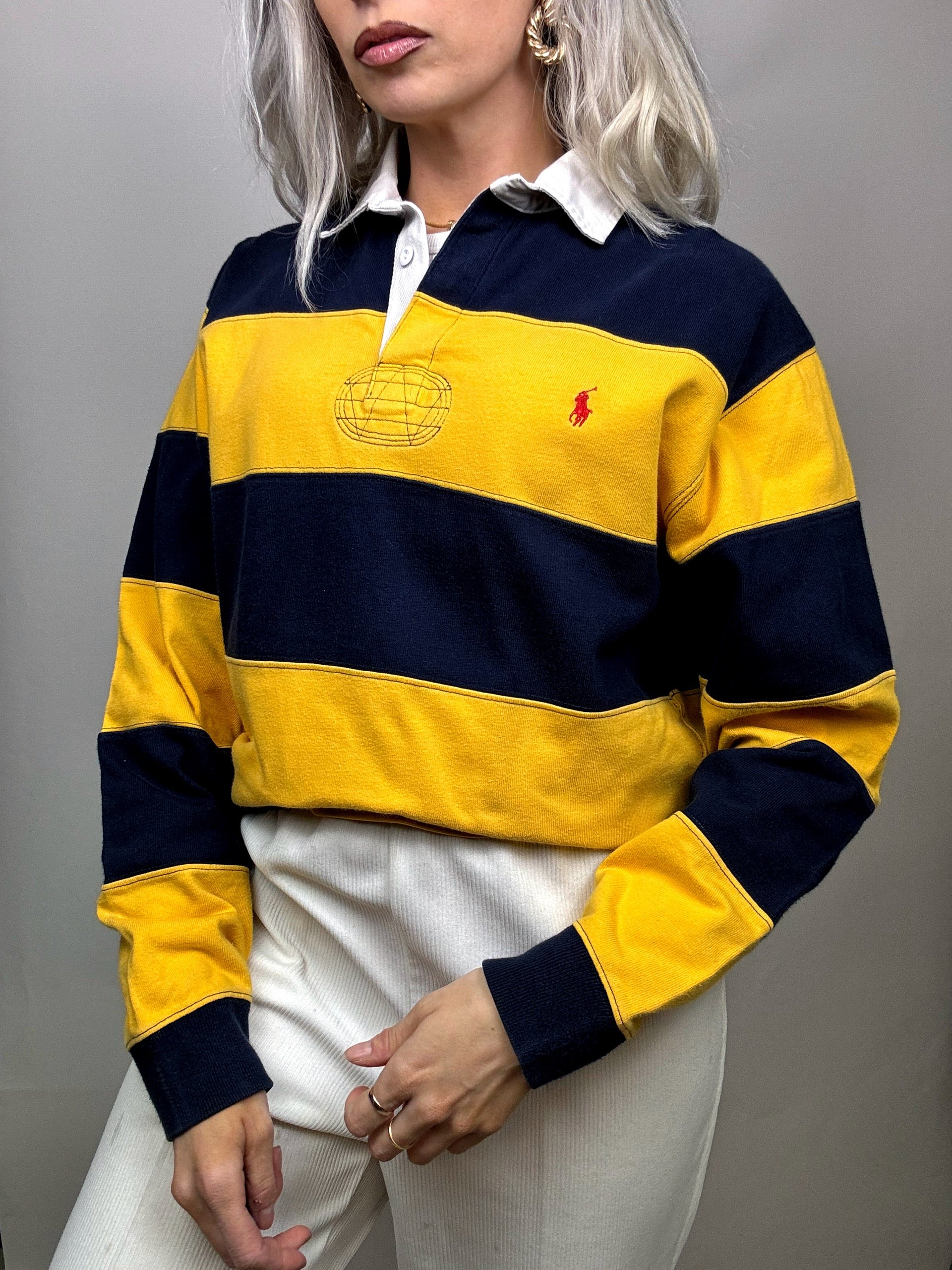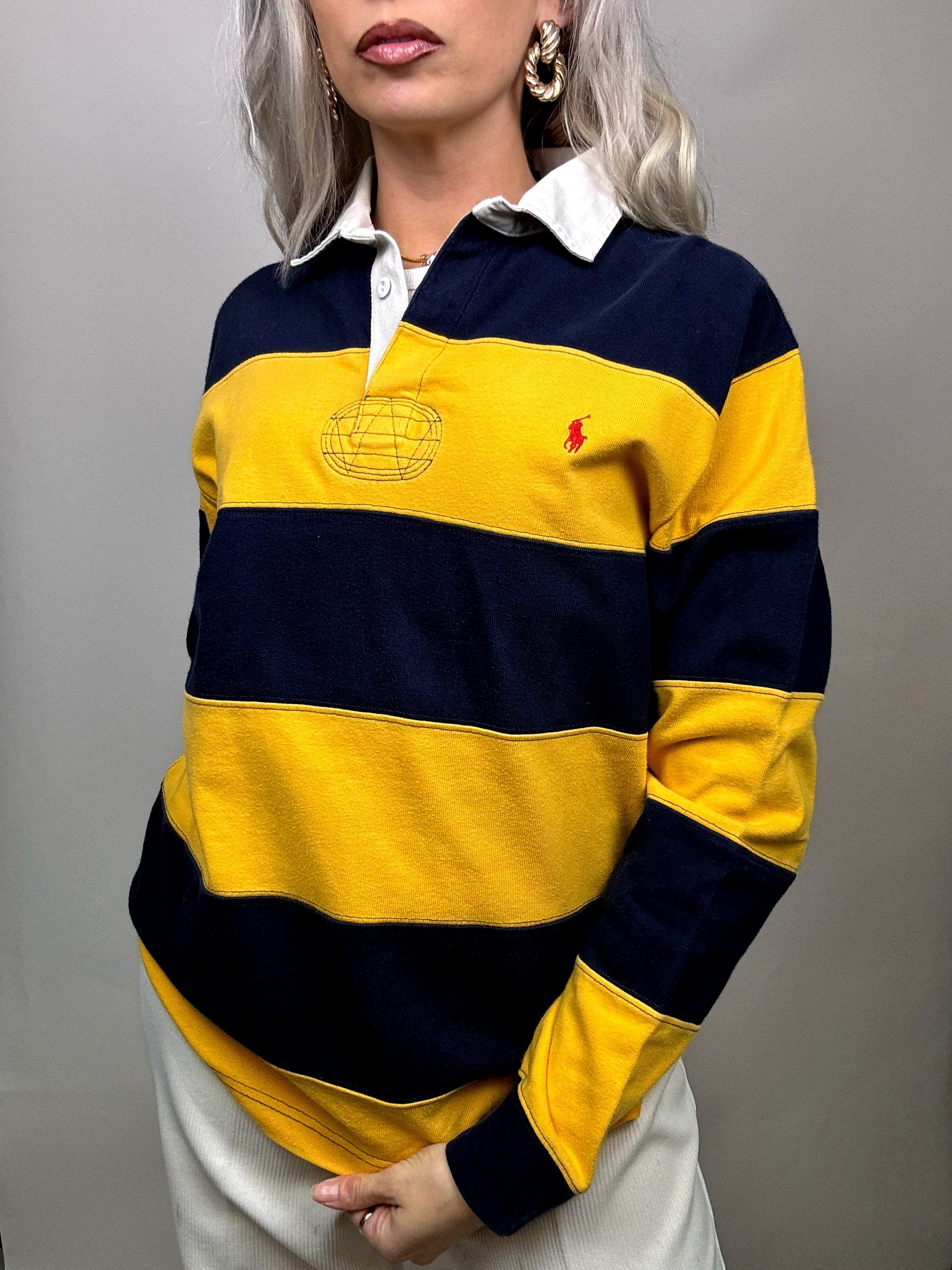 Vintage Ralph Lauren Yellow and Navy Long Sleeve Polo Shirt M