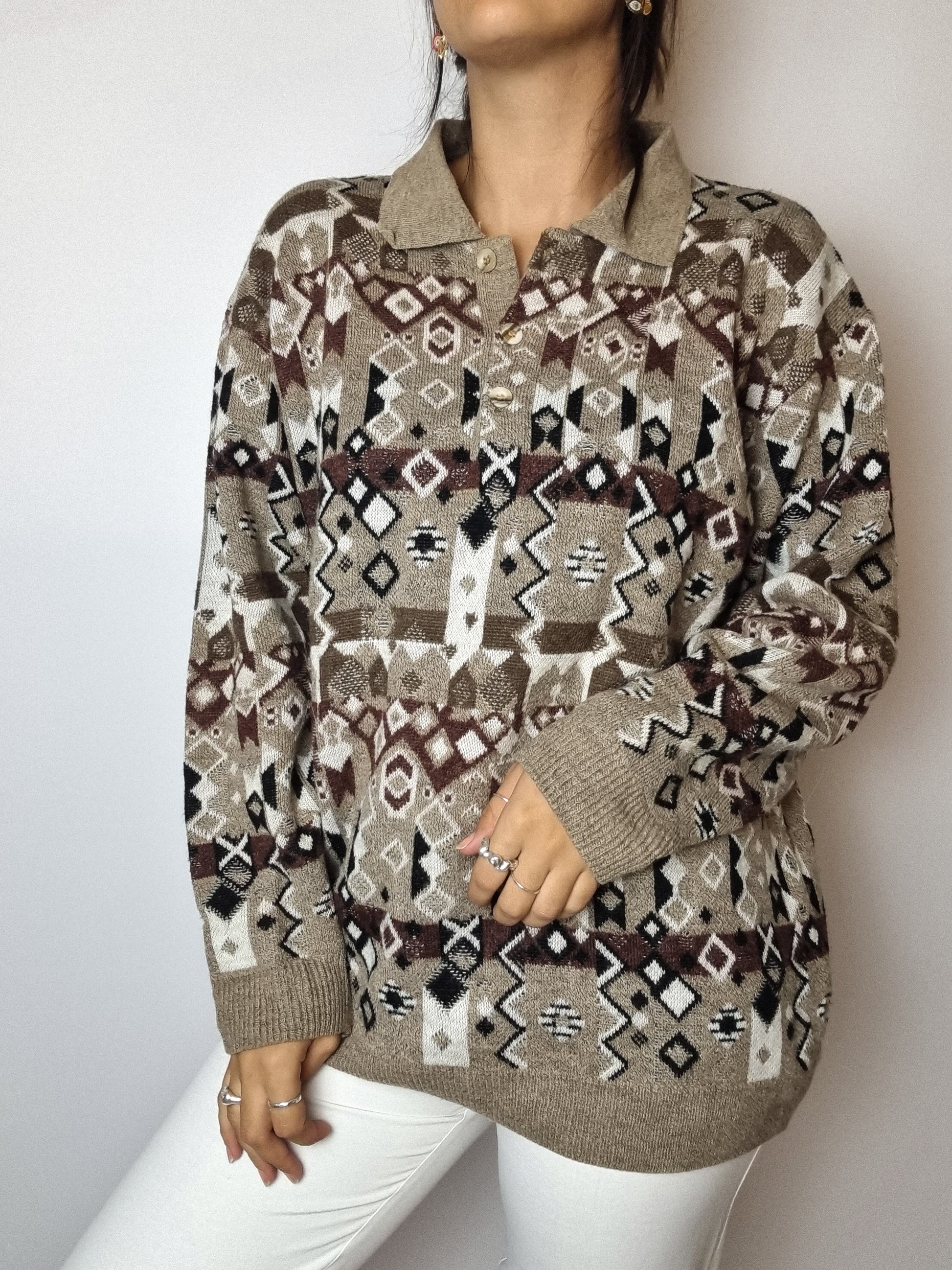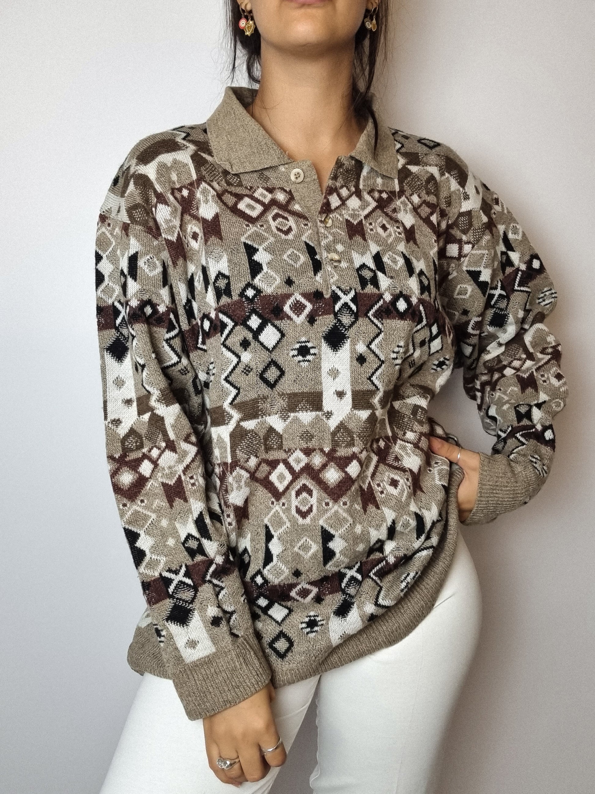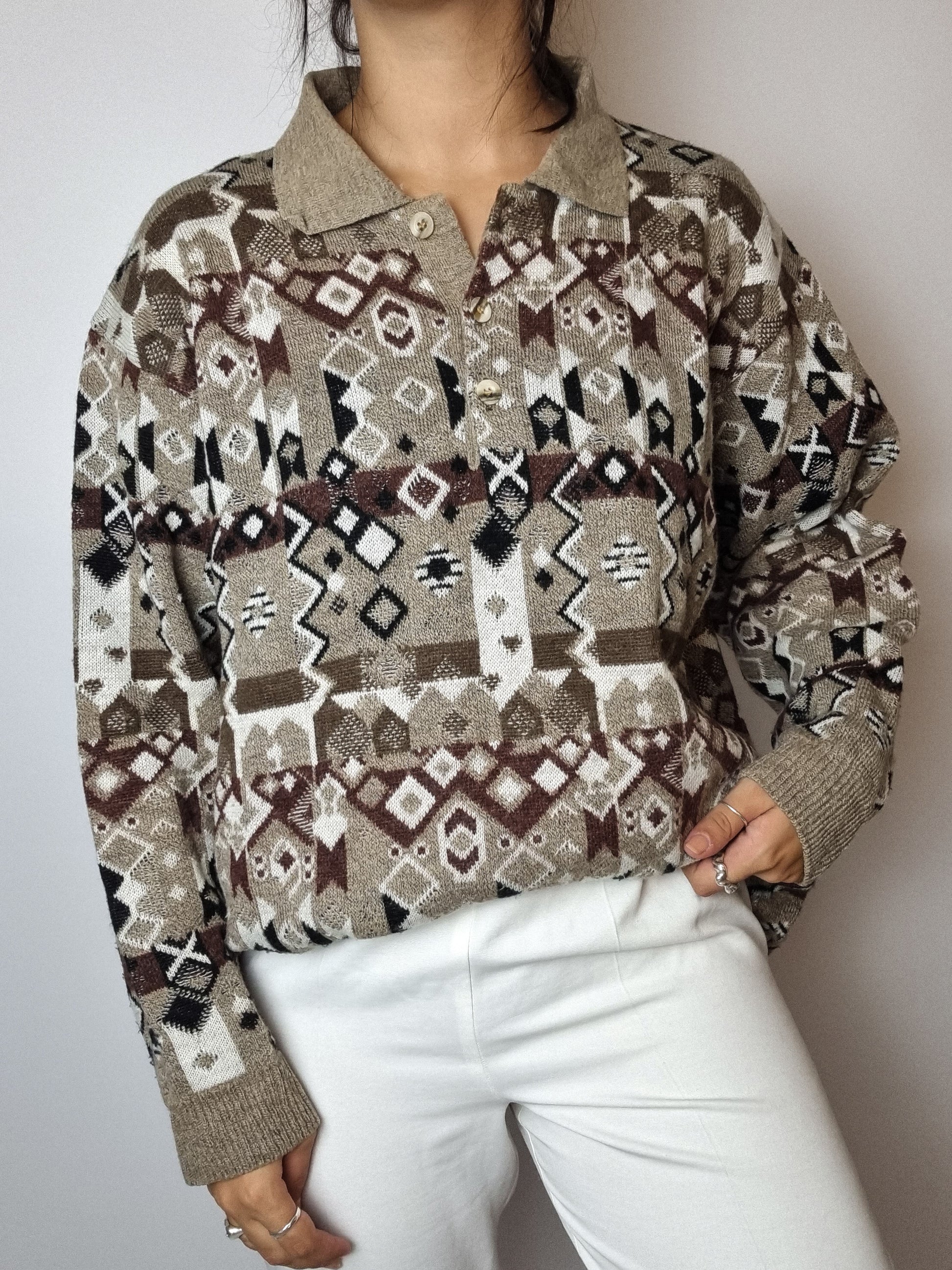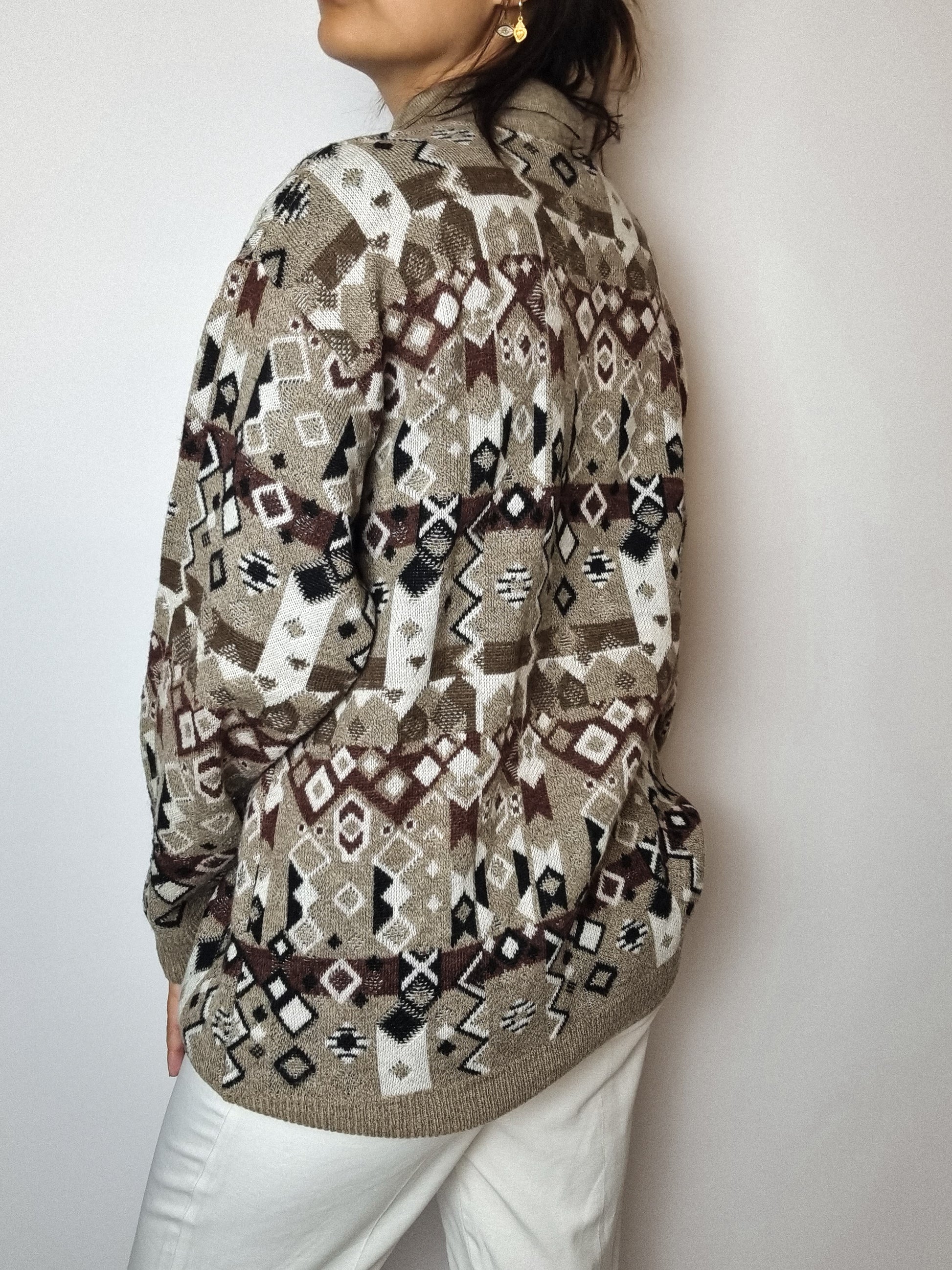Beige wool sweater with vintage patterns M