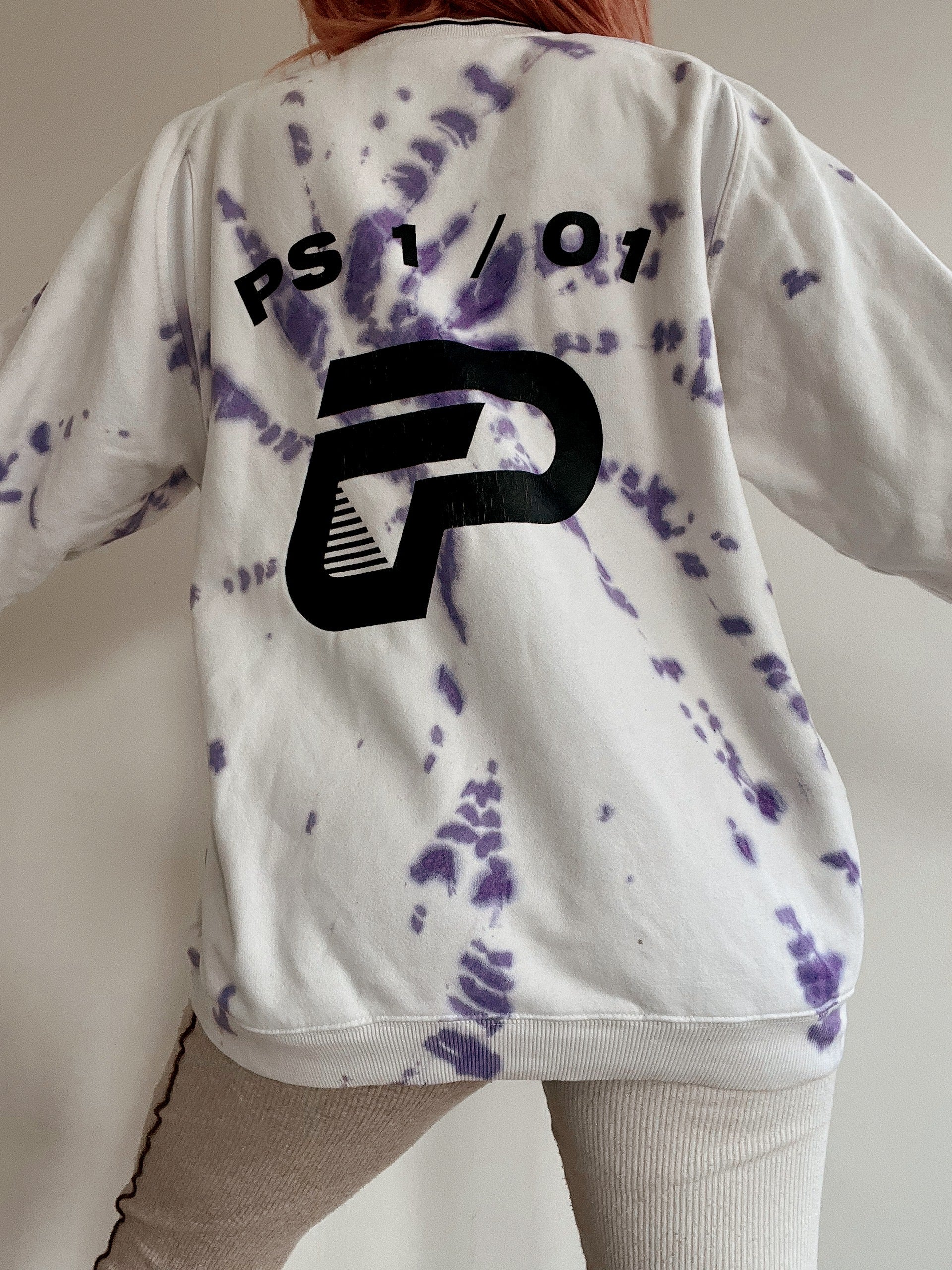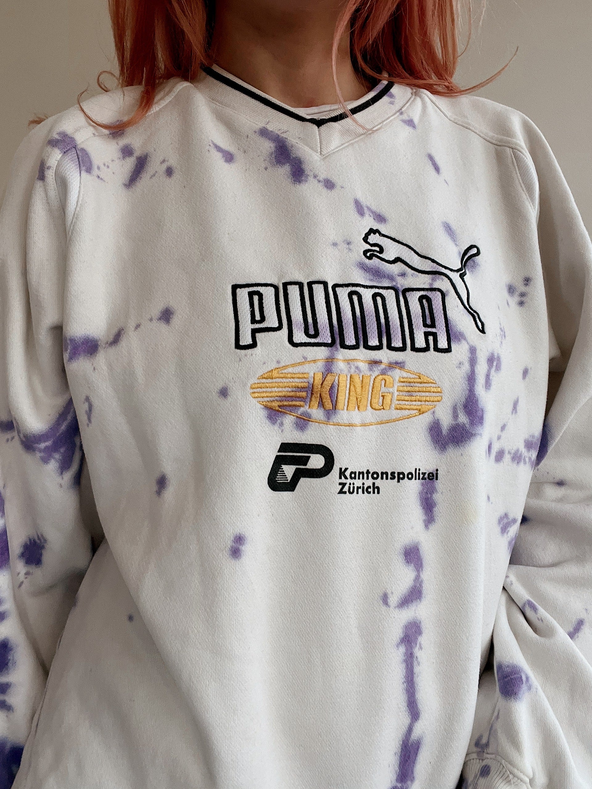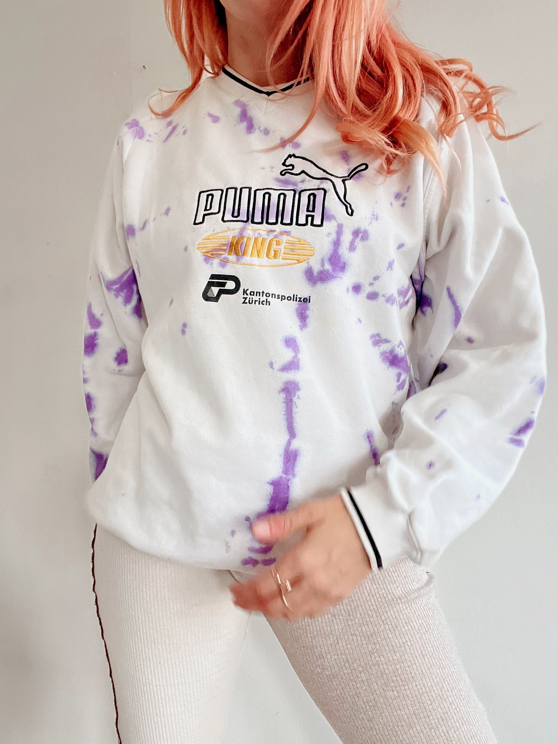 Good condition, but the item may contain small stains because all tie and dye products have been upcycled to camouflage a small stain so as not to throw away the outfit.