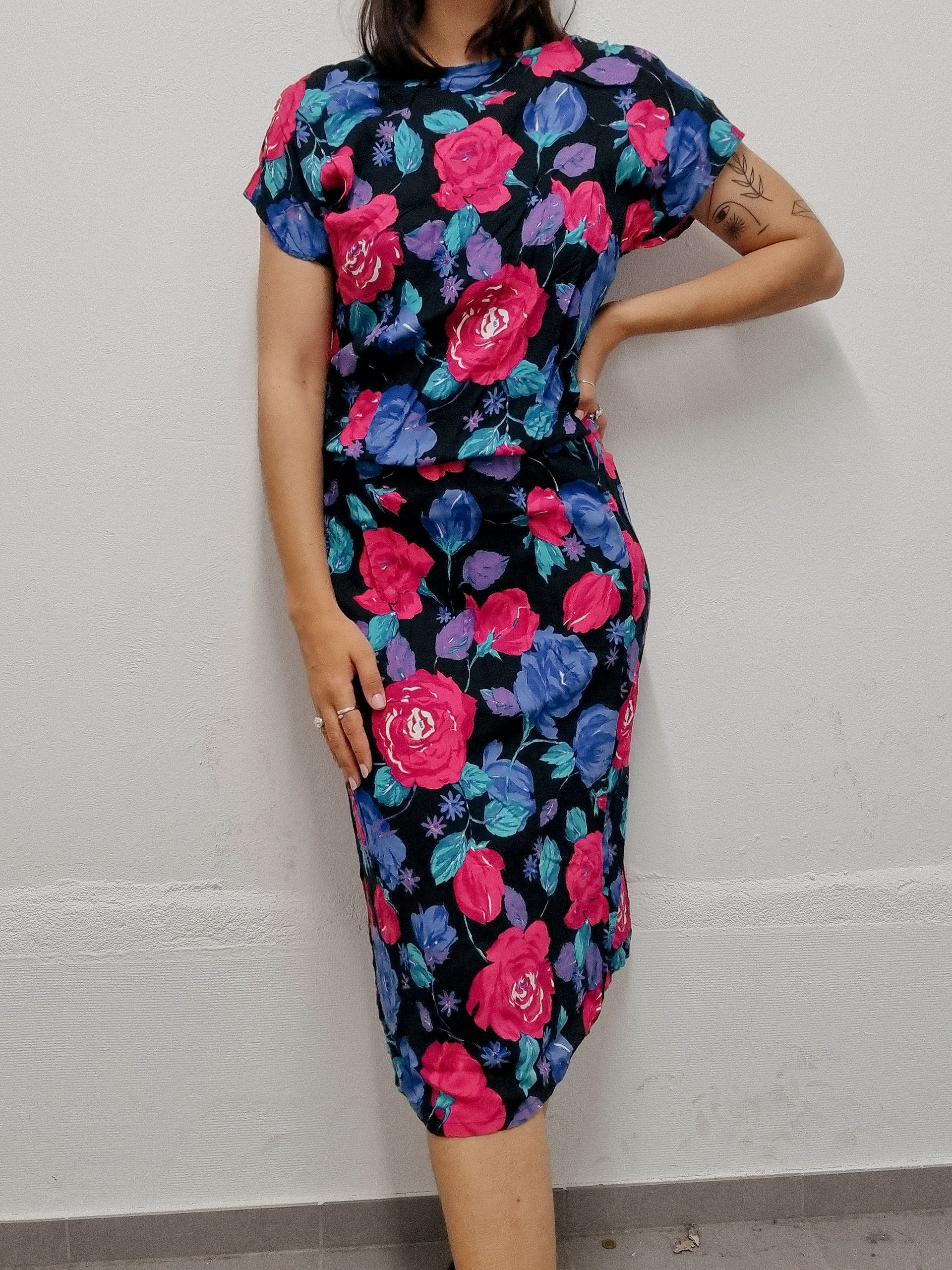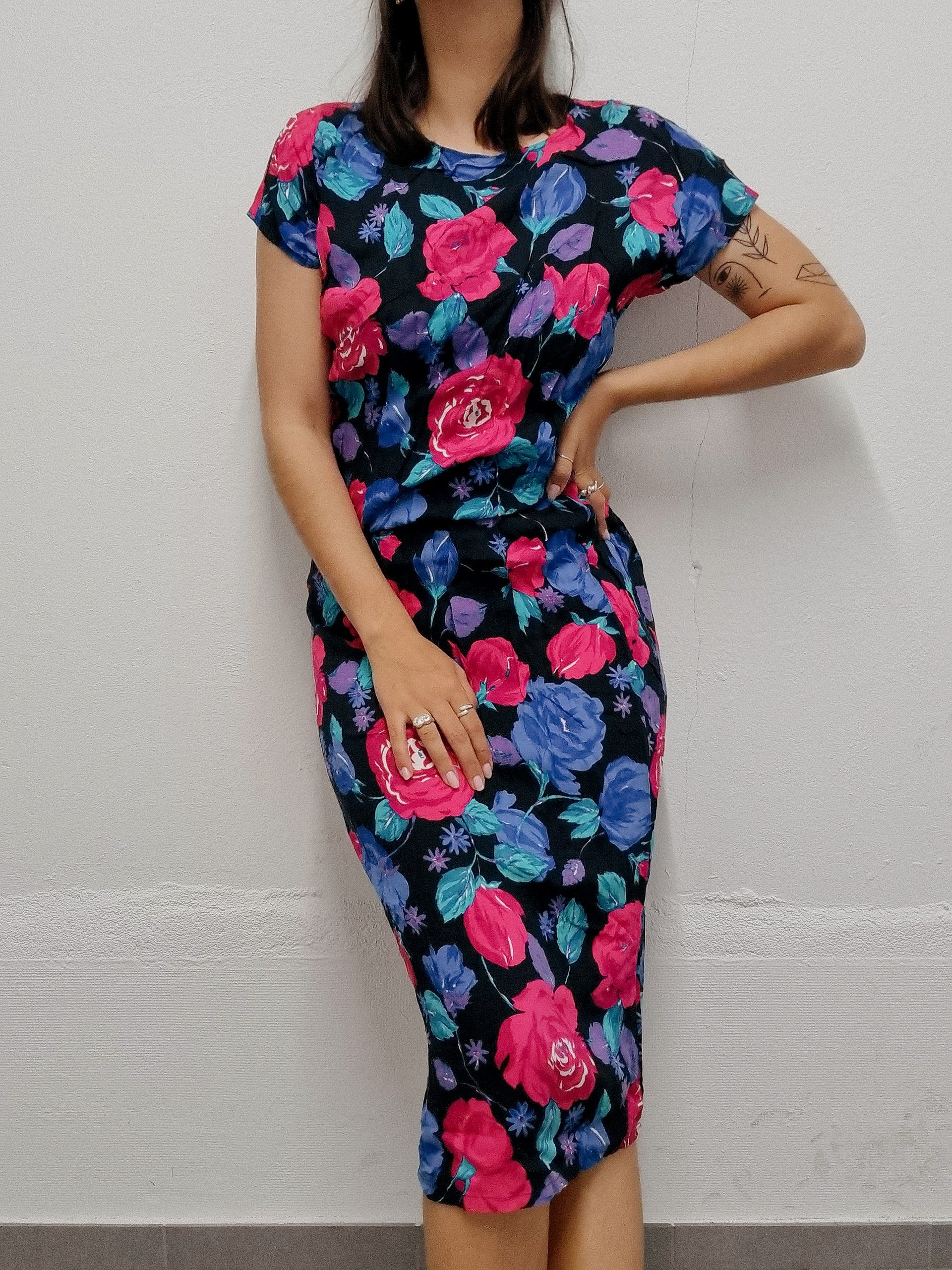 Vintage black and pink floral dress S/M