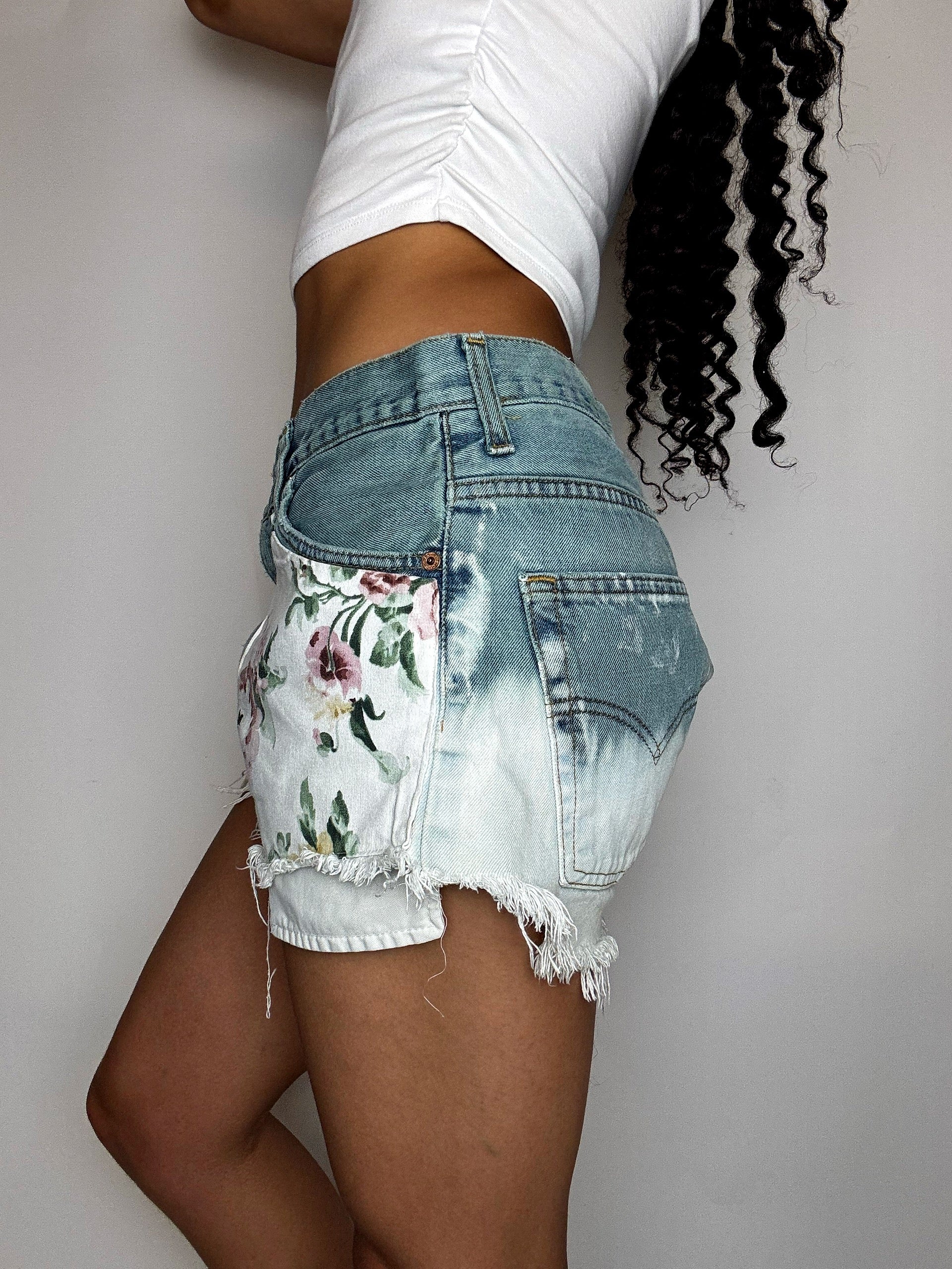 Un short magnifique, de base LEVIS auquel on a rajouté un magnifique tissu fleuri vintage, le delavage du short est aussi super bien réussi !