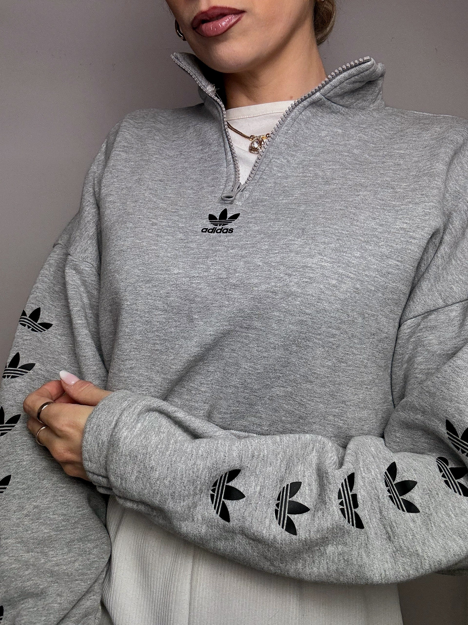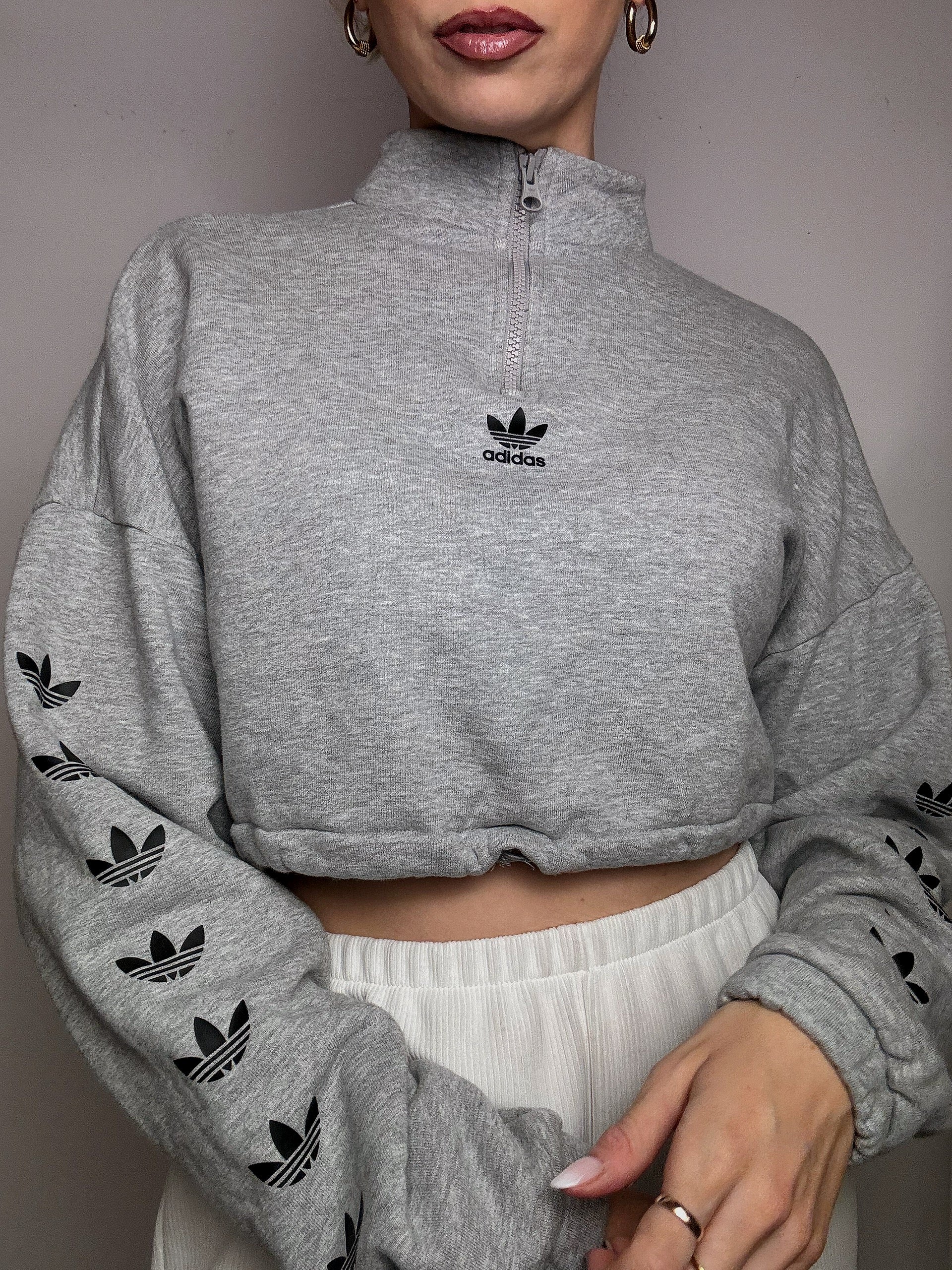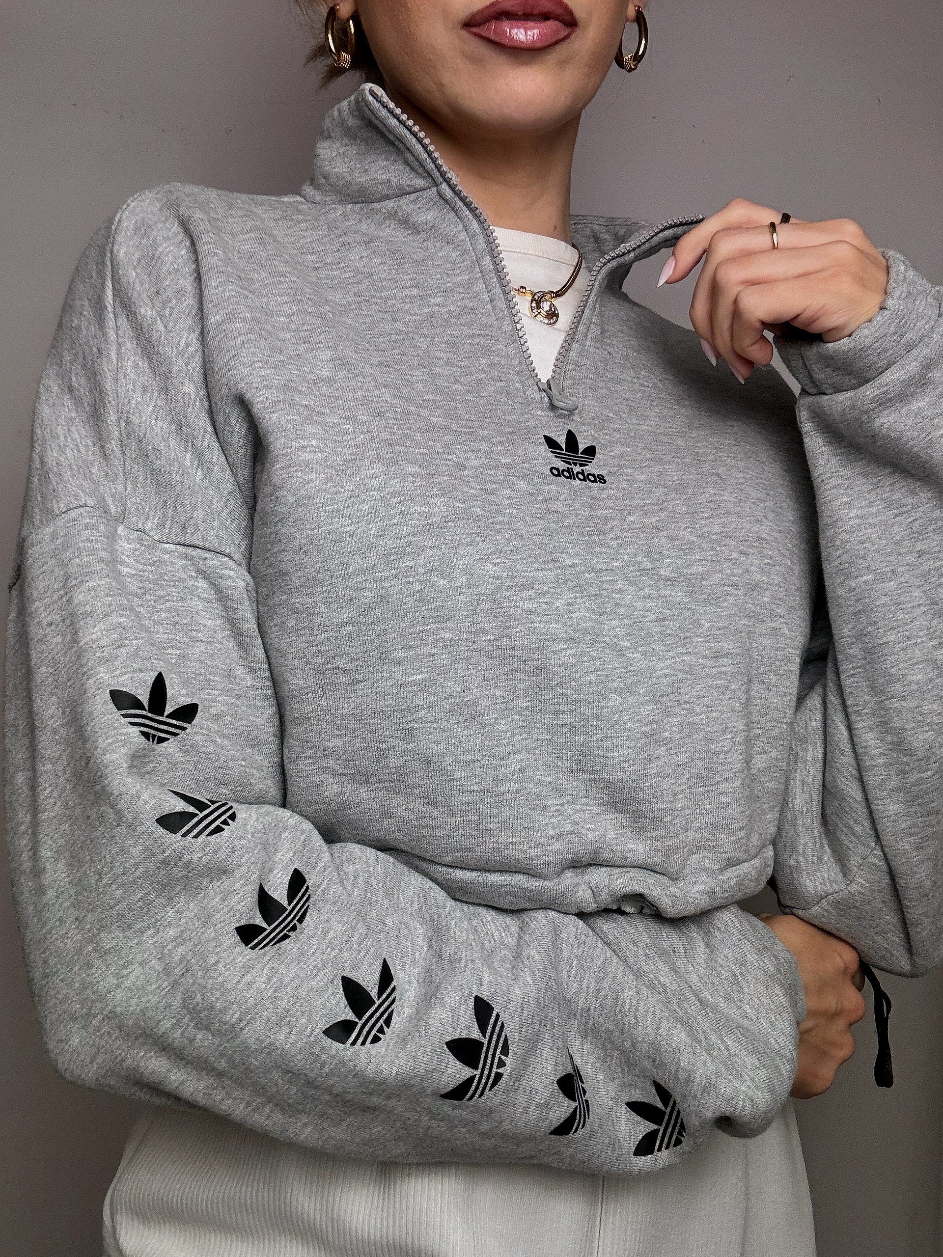 Very simple, it will go really well with high-waisted pants or a t-shirt underneath. The heather gray goes everywhere and the trefoil on the sleeves: it's a change from the stripes and at the same time super recognizable!