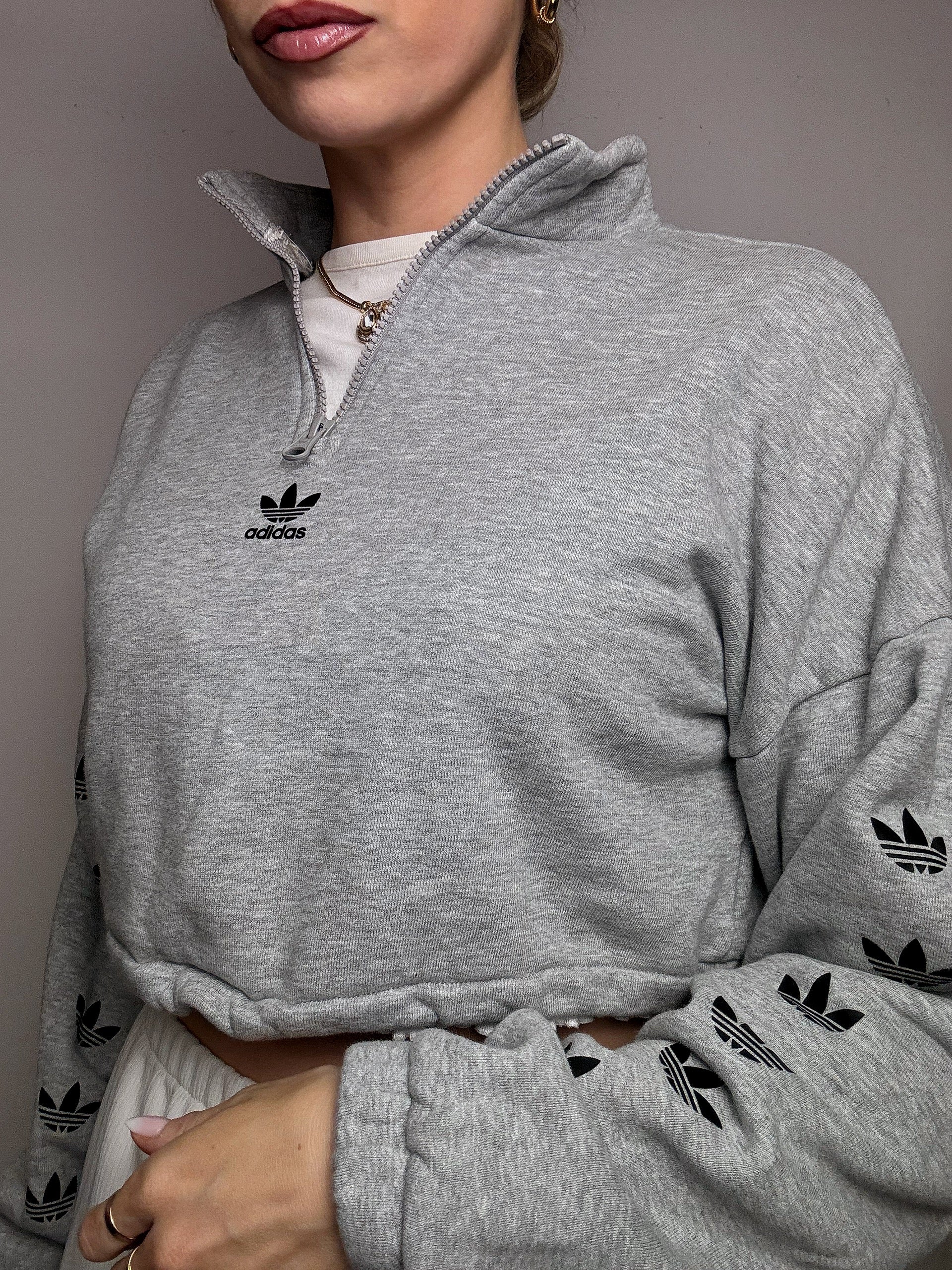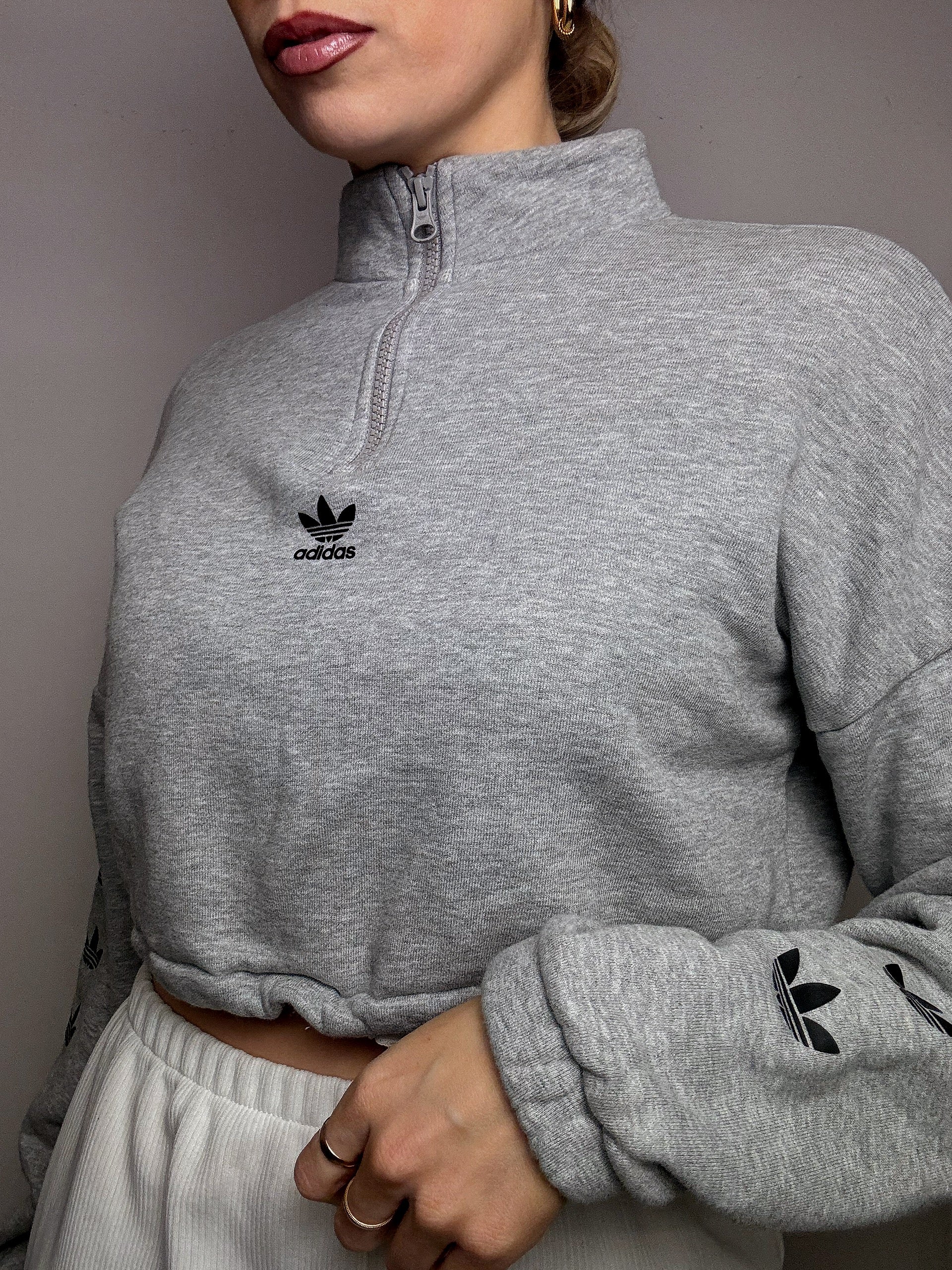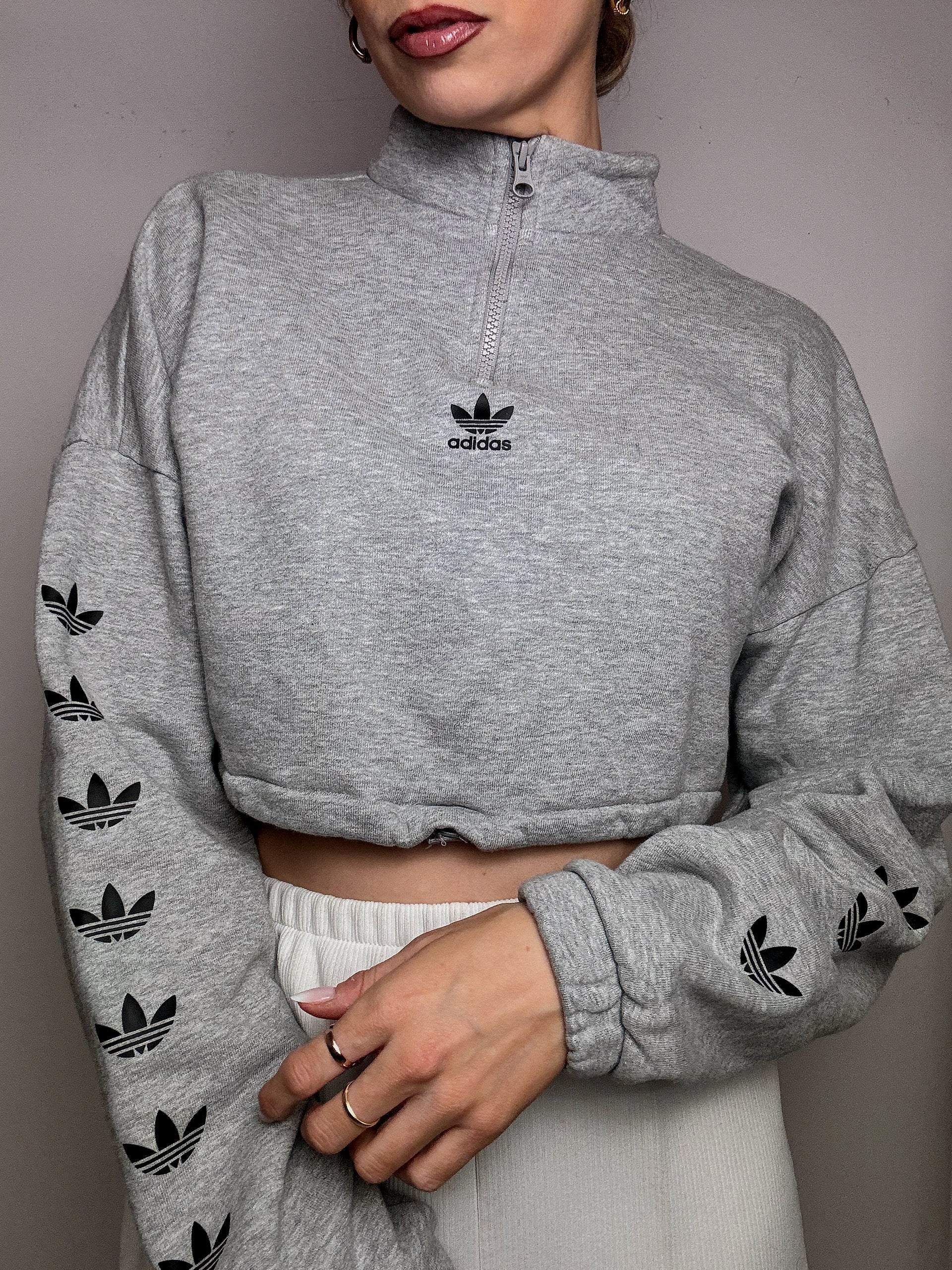 Very simple, it will go really well with high-waisted pants or a t-shirt underneath. The heather gray goes everywhere and the trefoil on the sleeves: it's a change from the stripes and at the same time super recognizable!