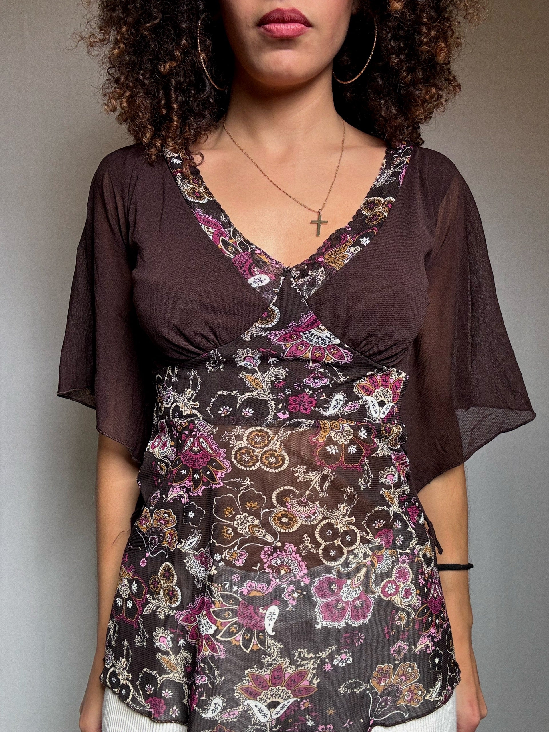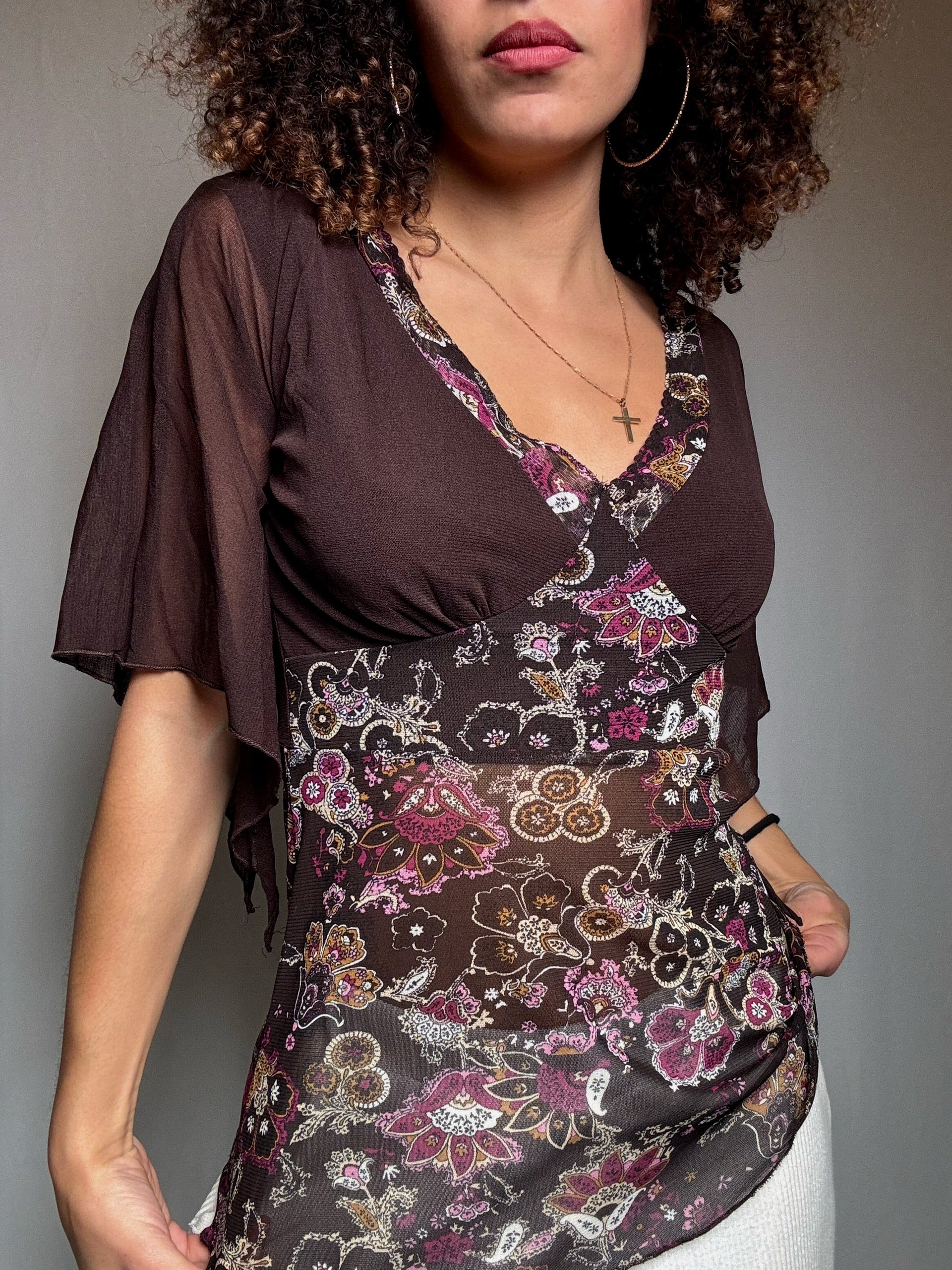 Top en mesh brun et imprimé M/L vintage
