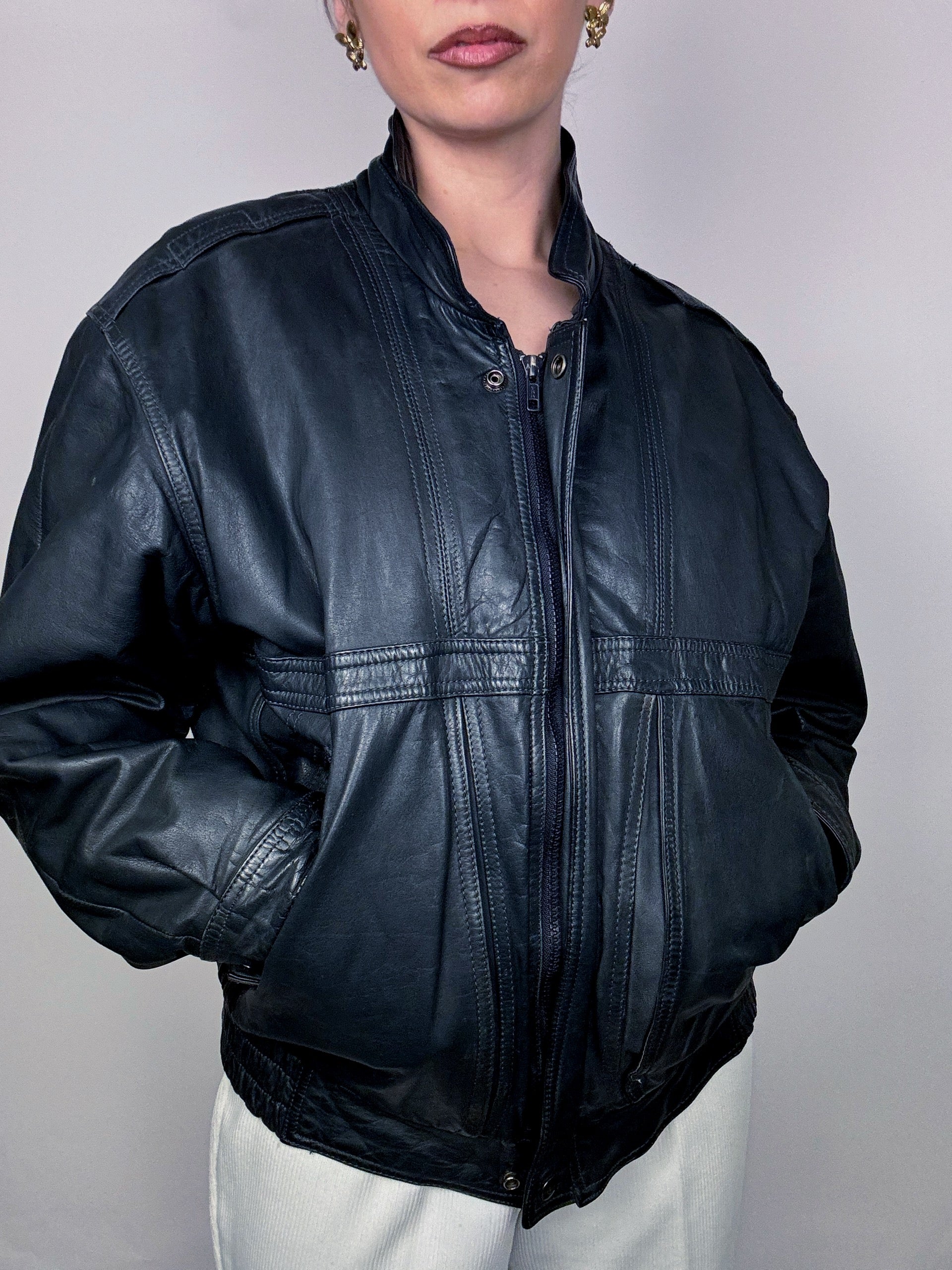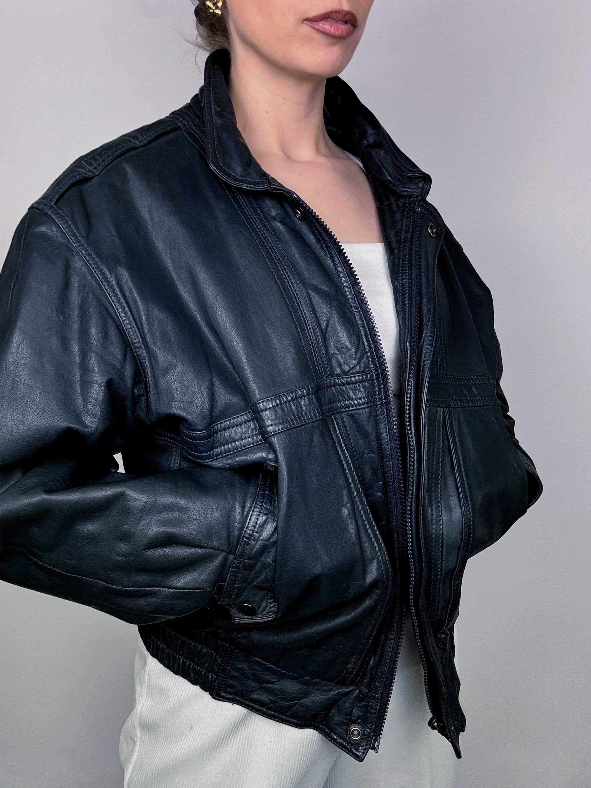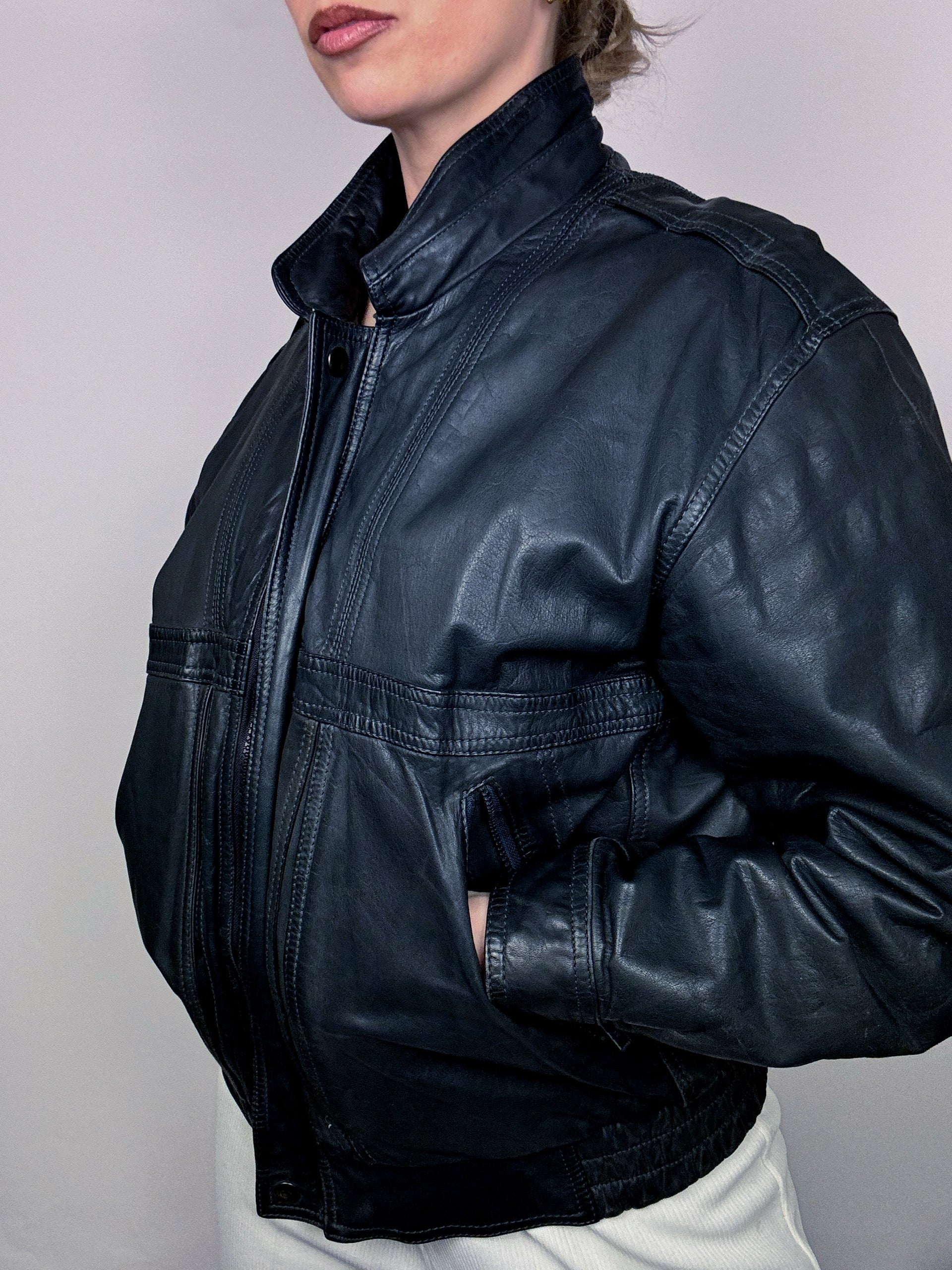 Blouson en cuir style aviator noir bleuté M vintage