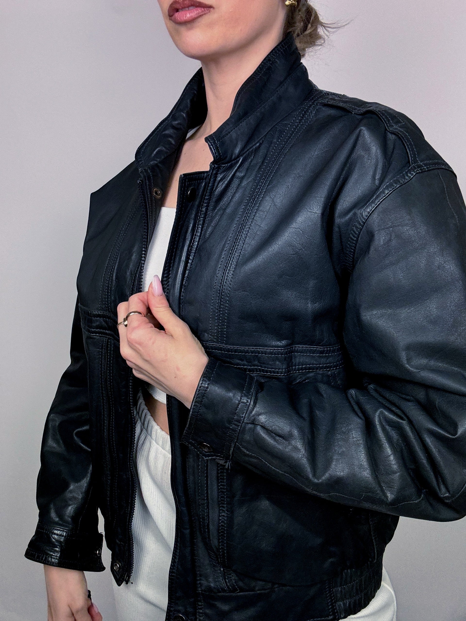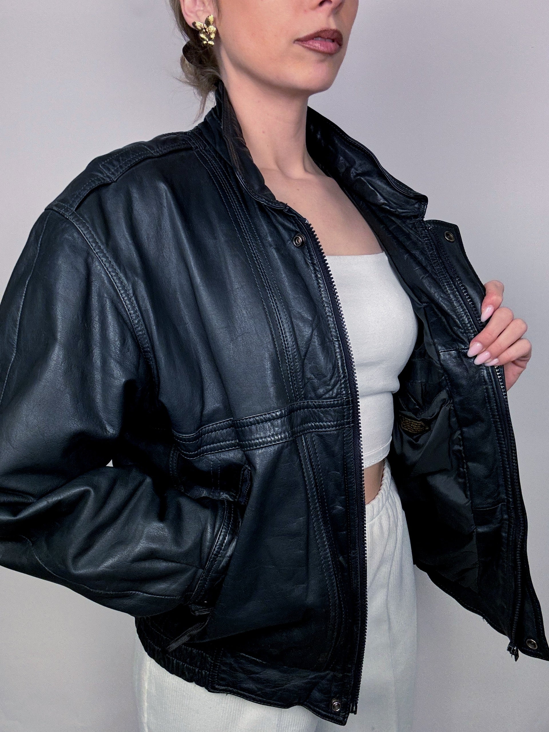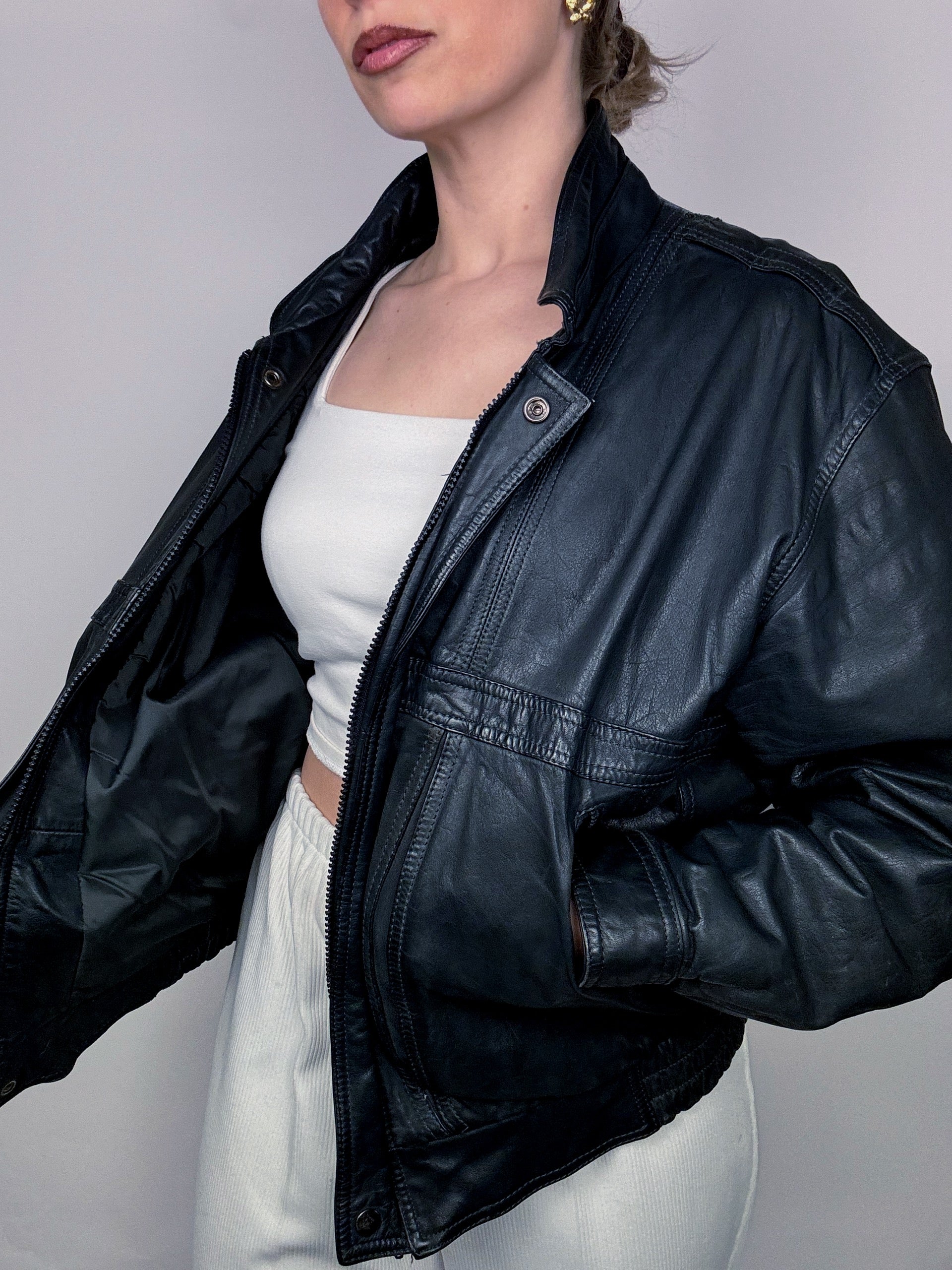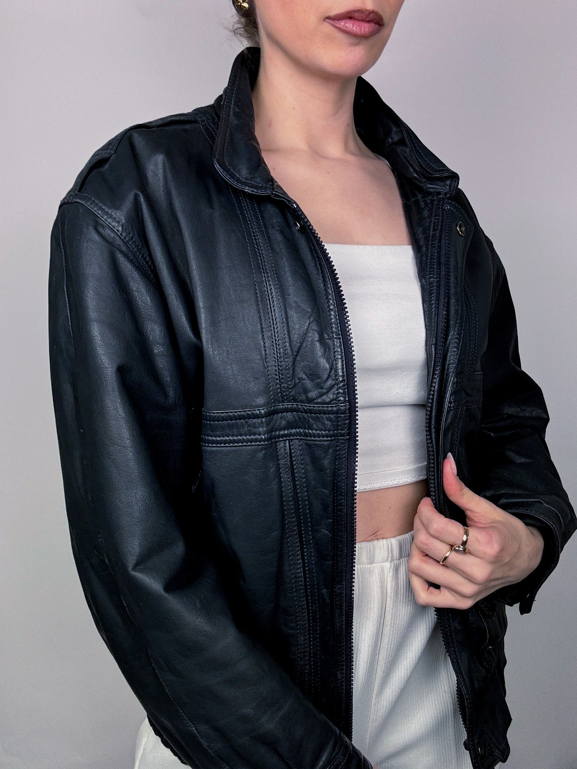 Blouson en cuir style aviator noir bleuté M vintage