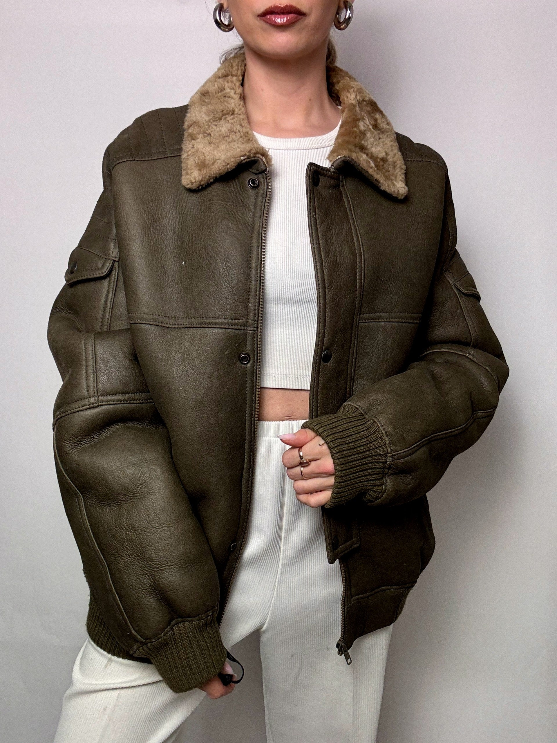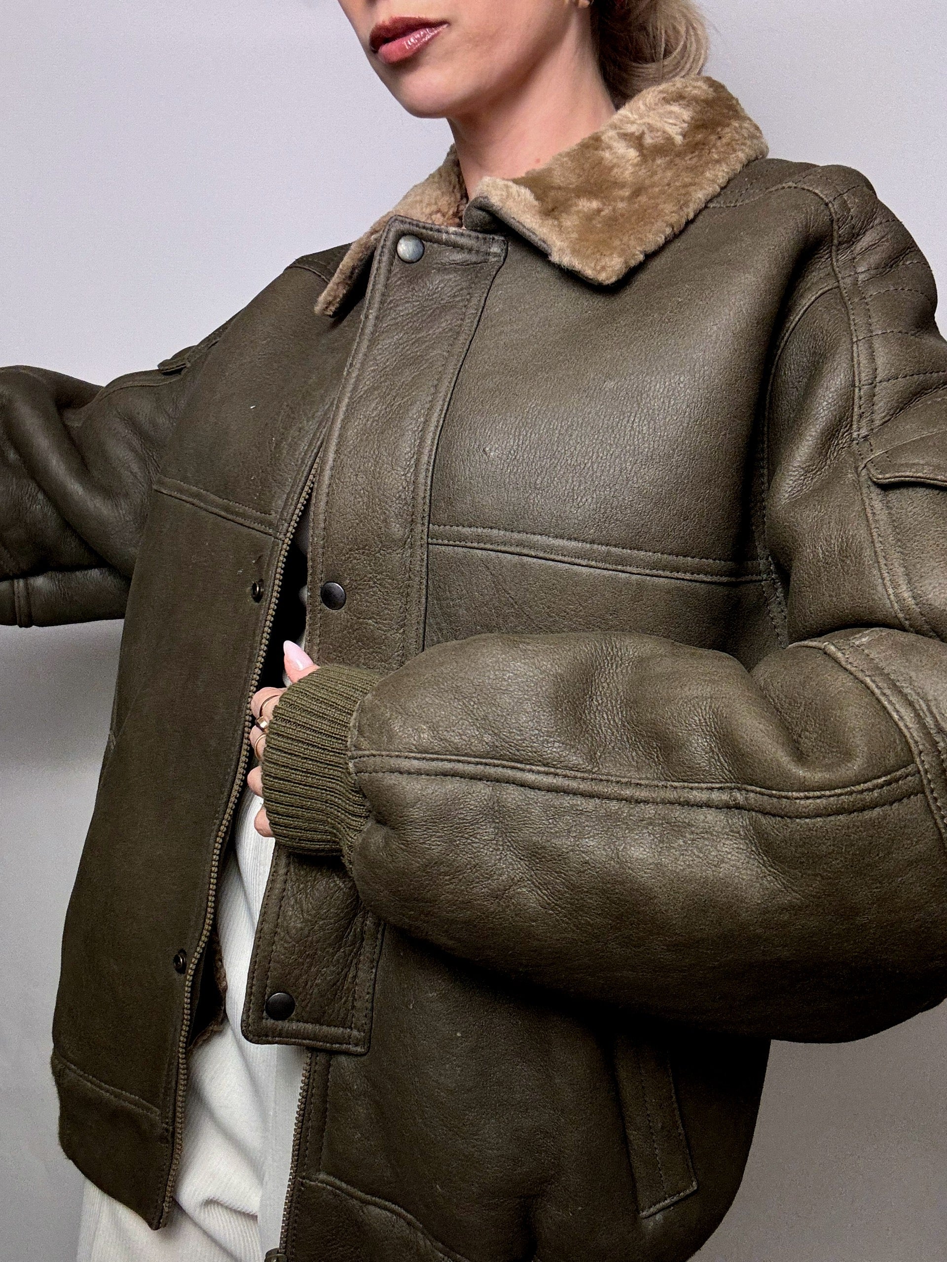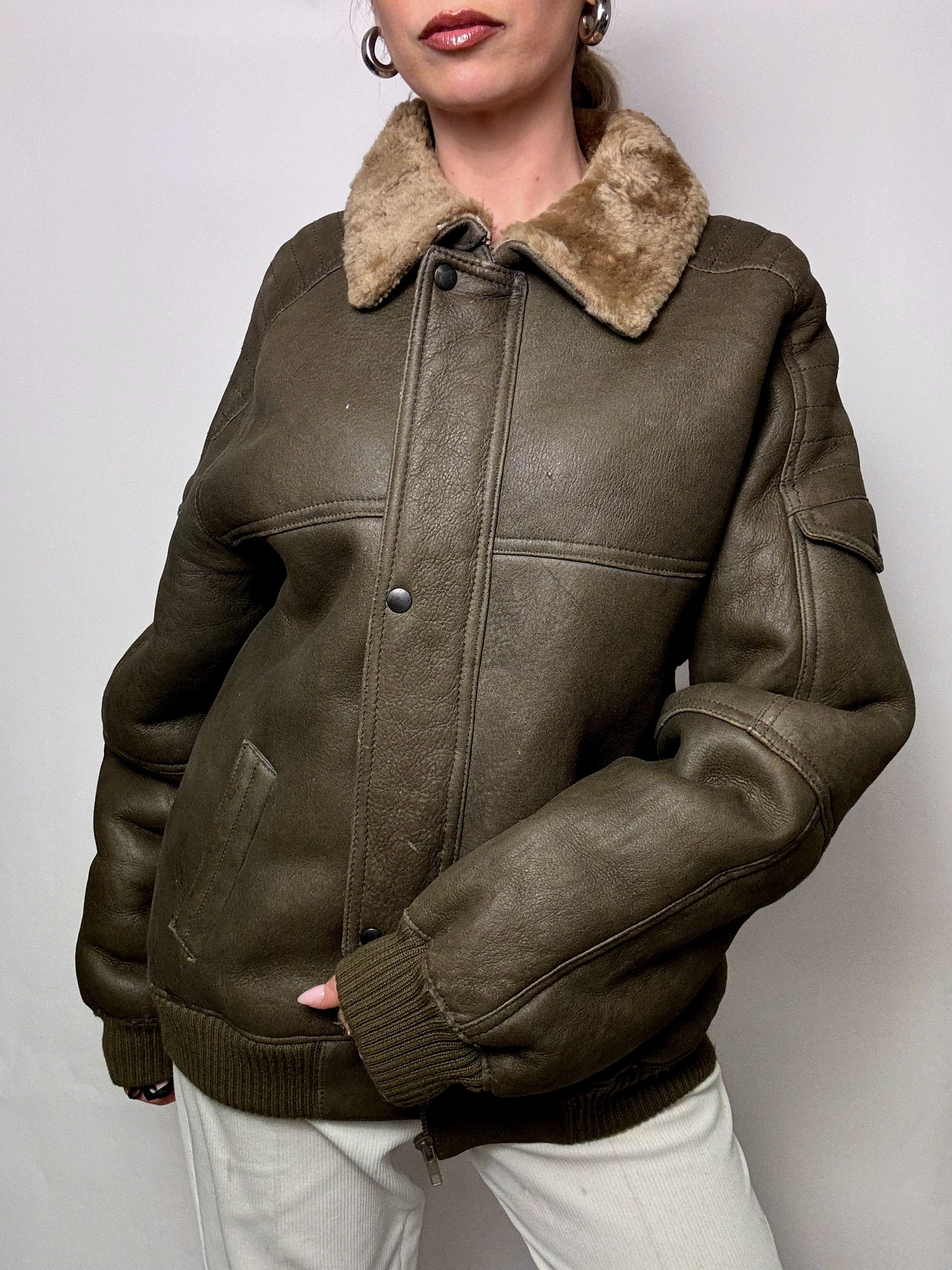 Blouson en peau de mouton retournée Kaki L/XL vintage