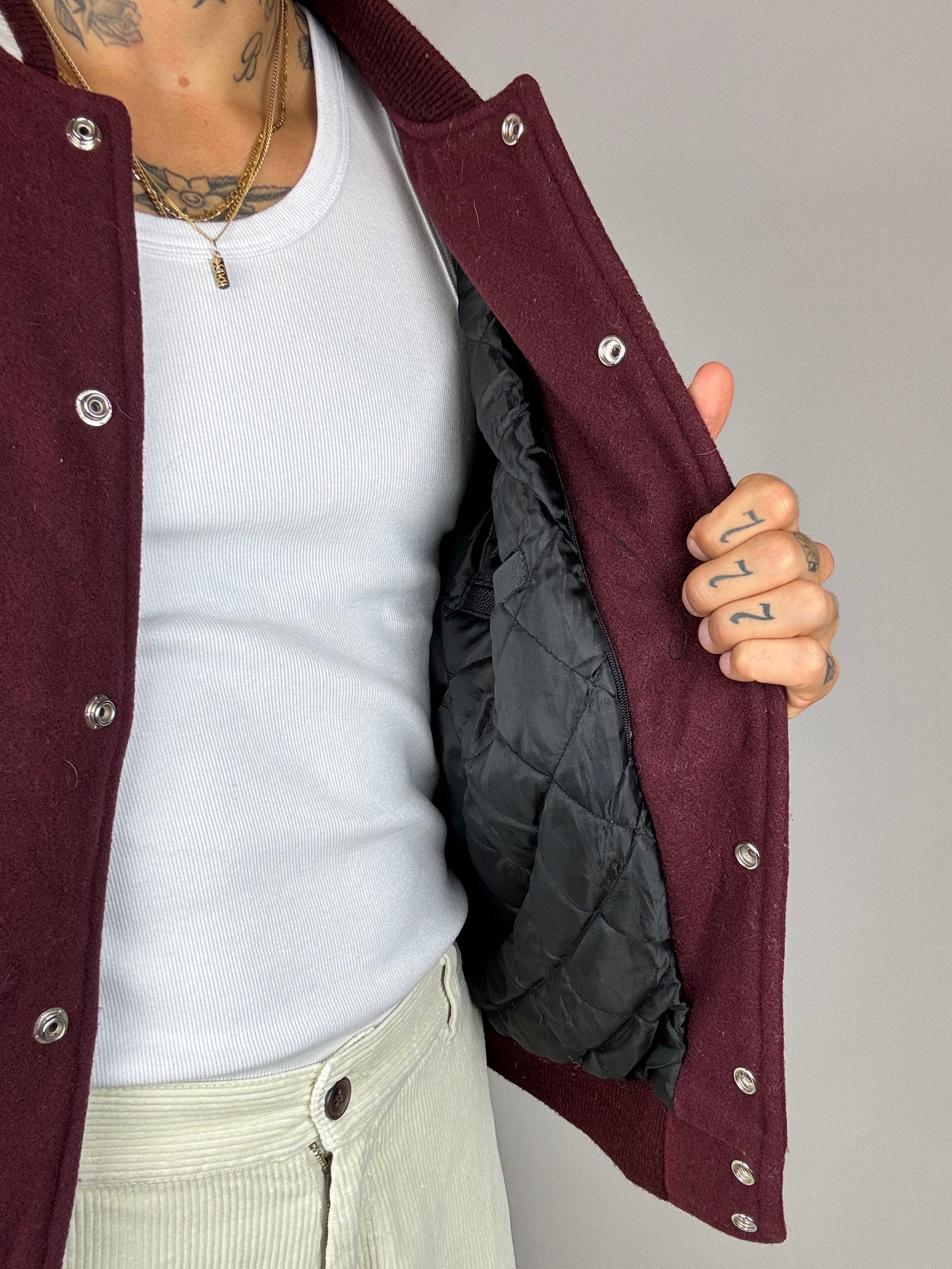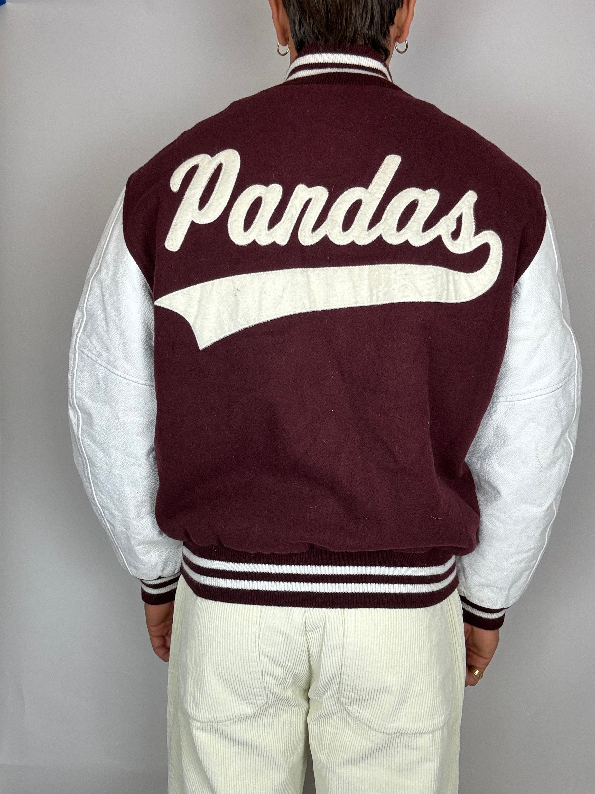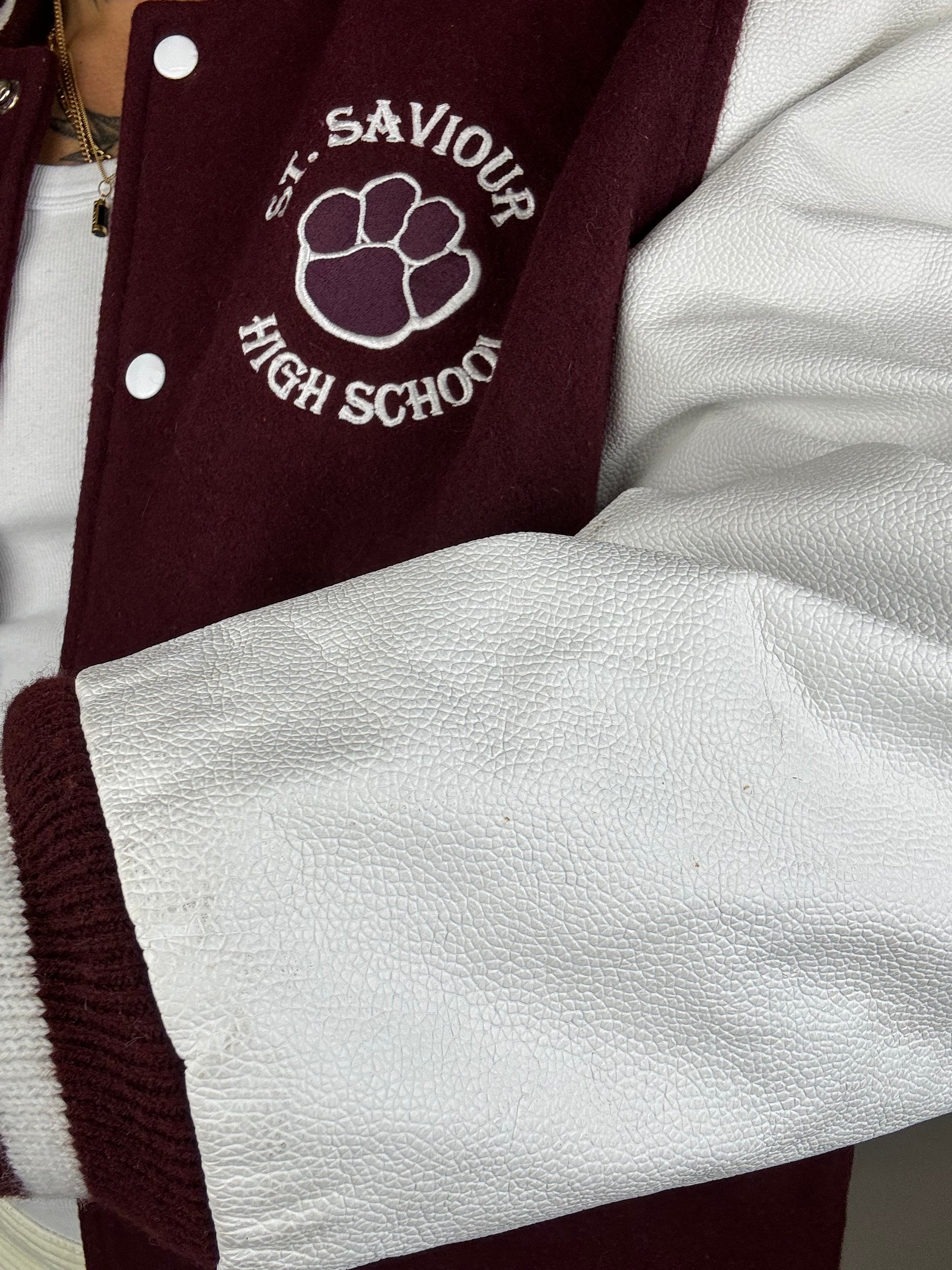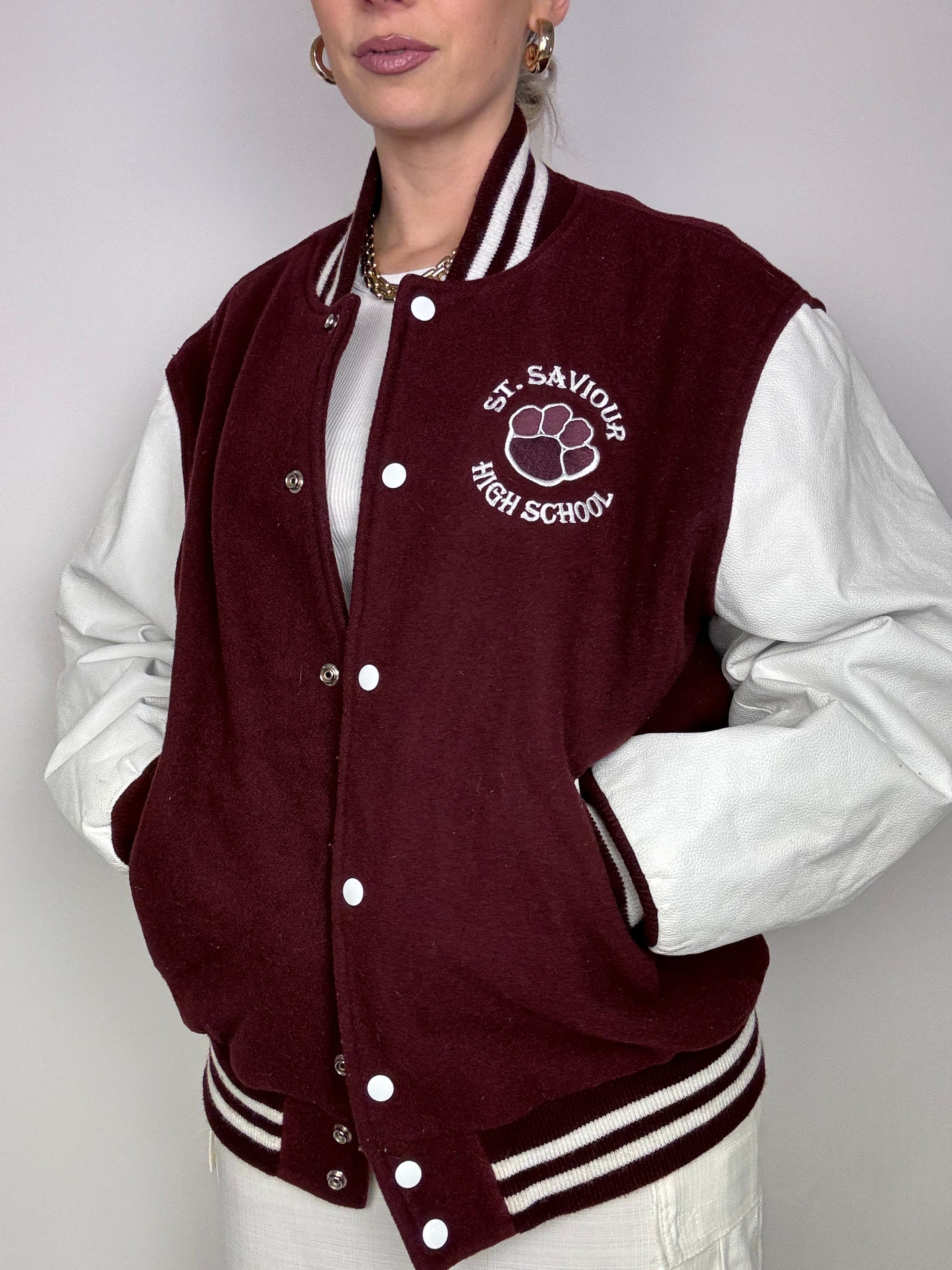 Bomber bordeau et blanc, manches en cuir vintage