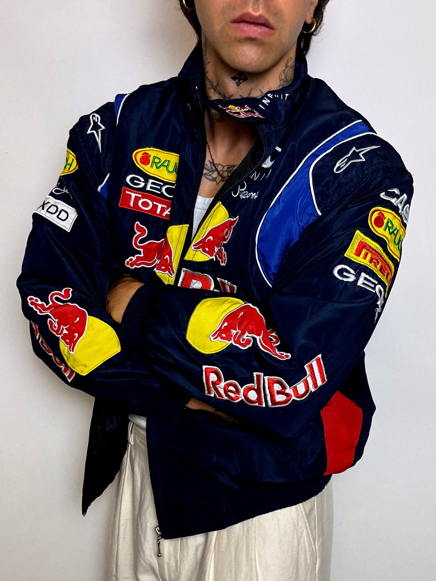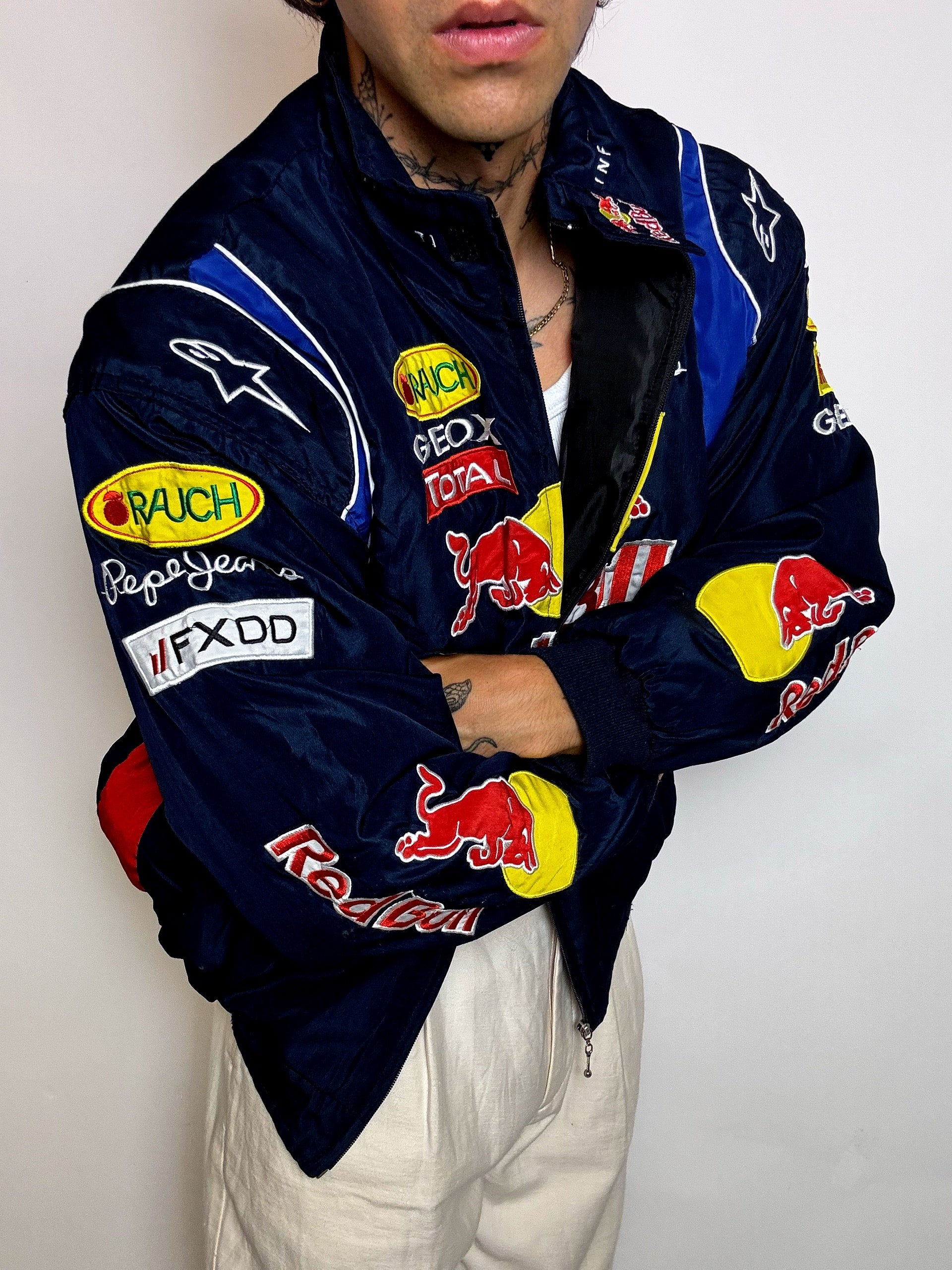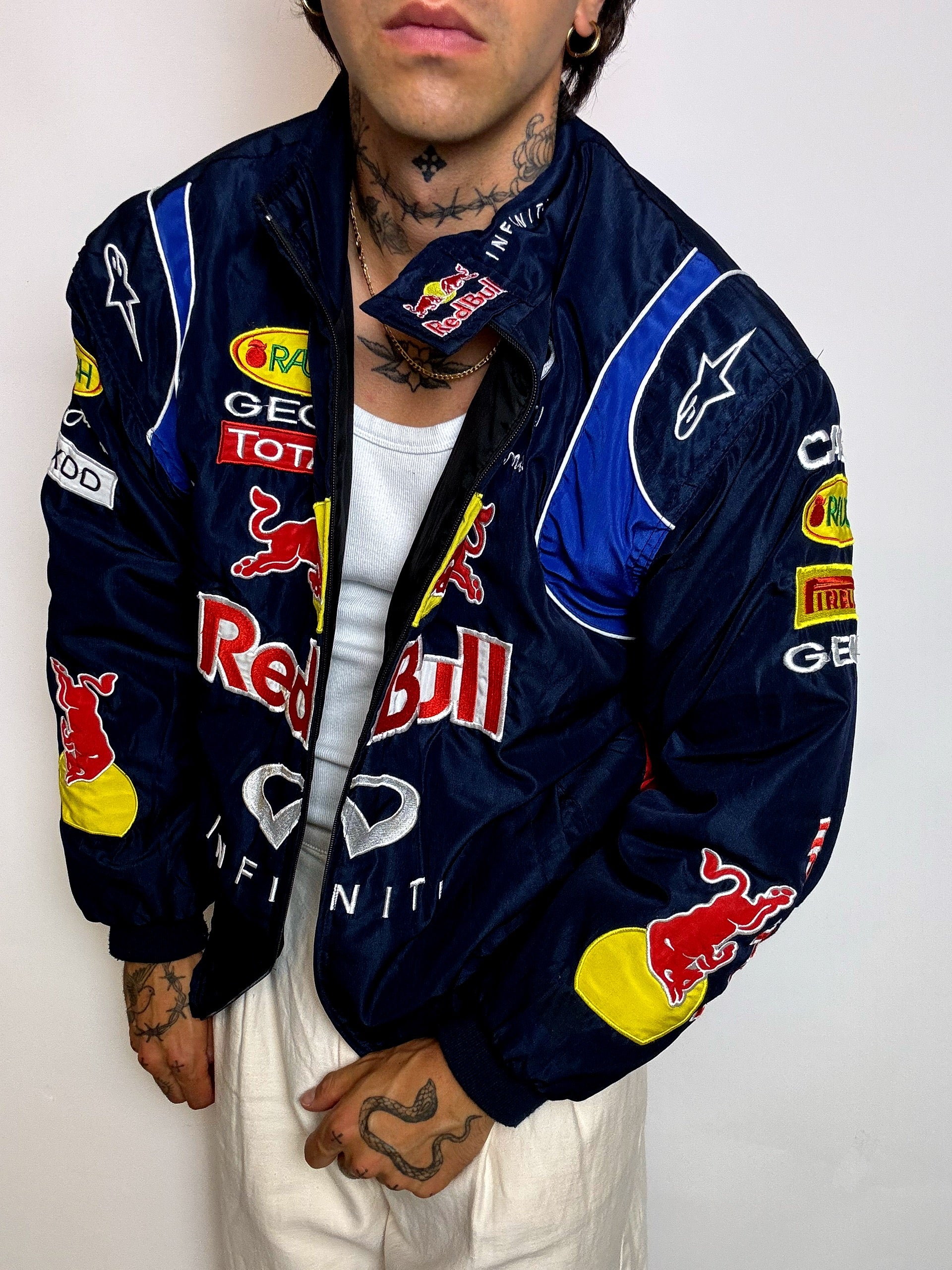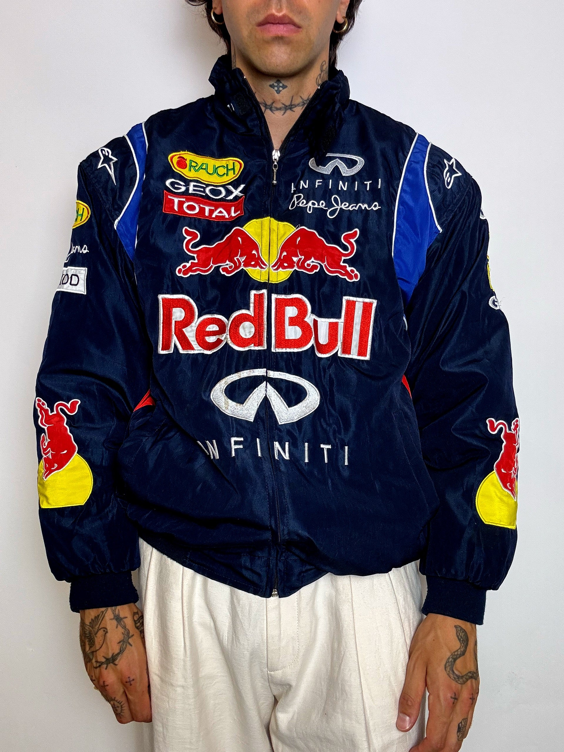 Veste iconique inspirée de l’écurie Red Bull Racing à l’époque Infiniti (2013–2015), cette pièce reprend les codes visuels des vestes portées dans les paddocks de Formule 1. Patchs brodés Red Bull, Infiniti, Total, Geox, Pepe Jeans… tout y est.