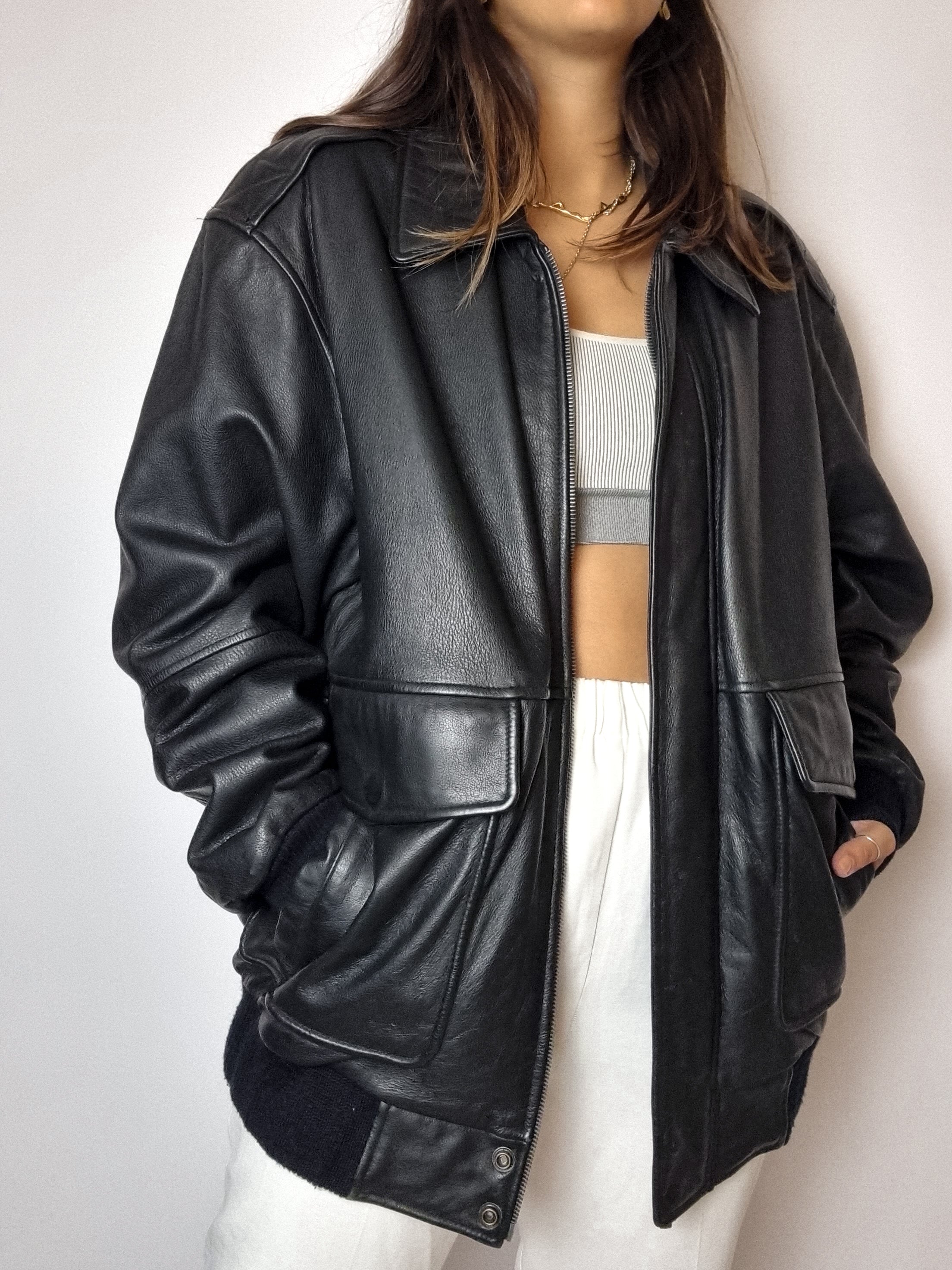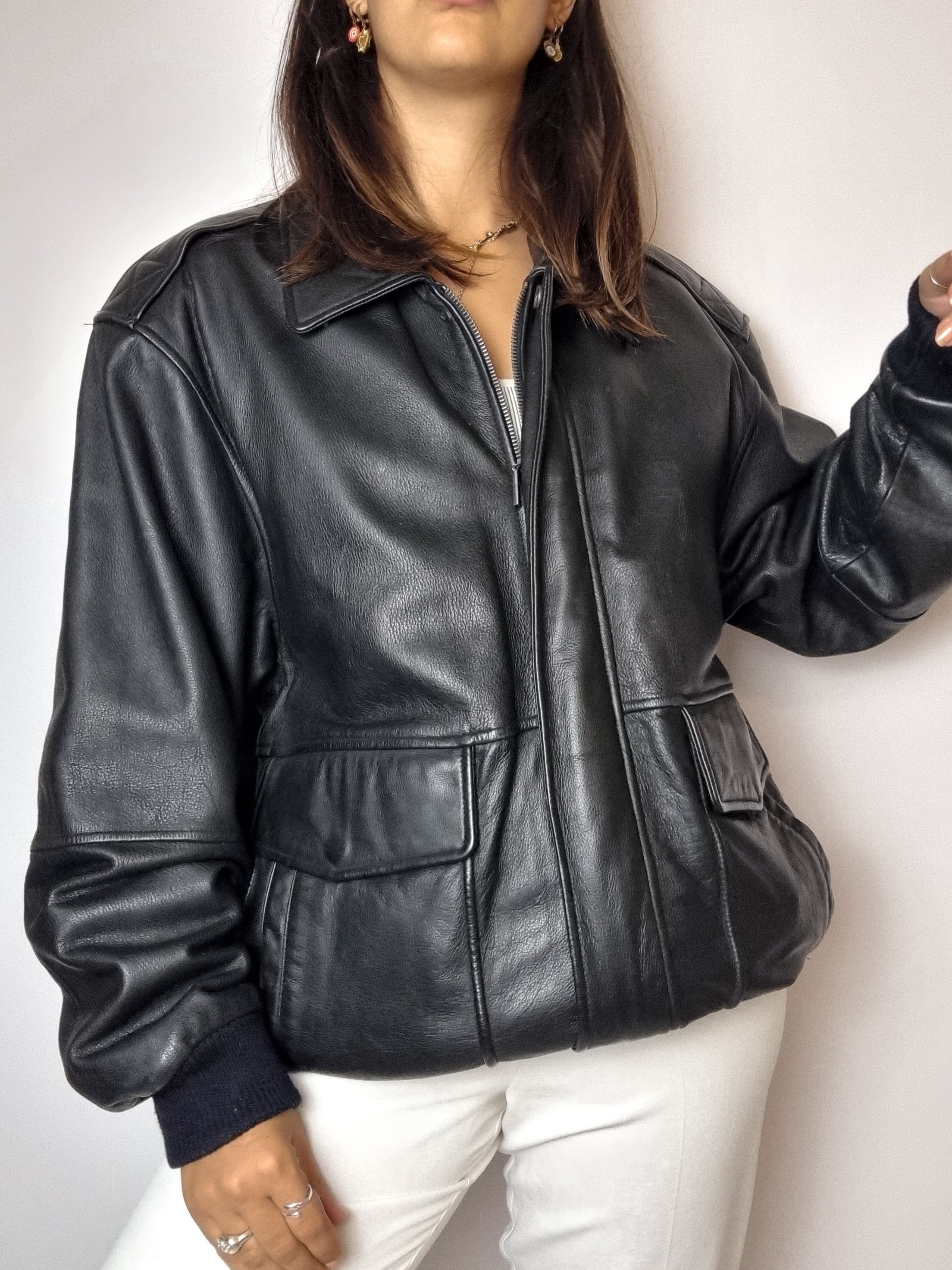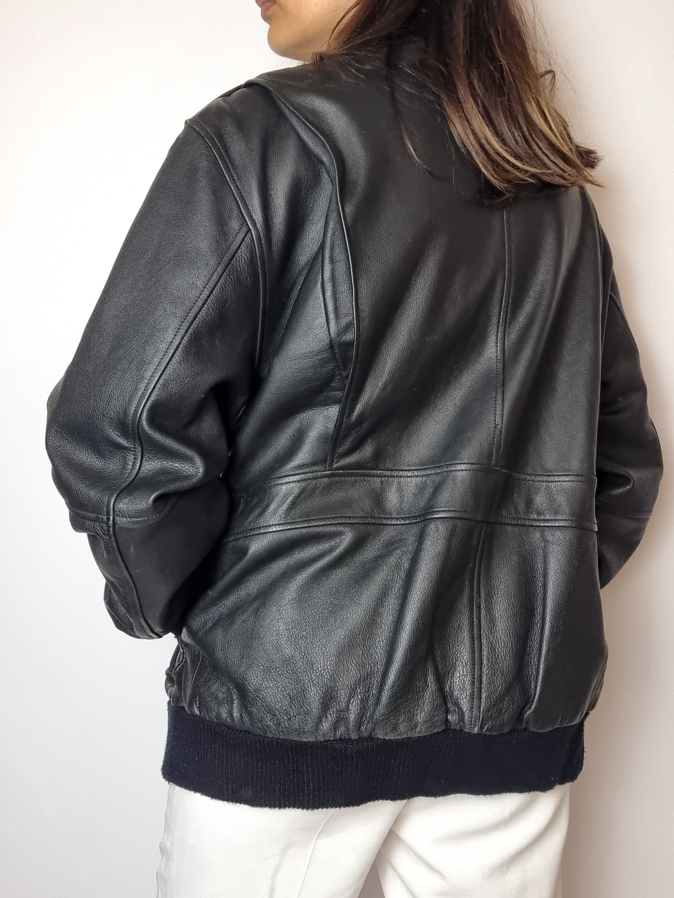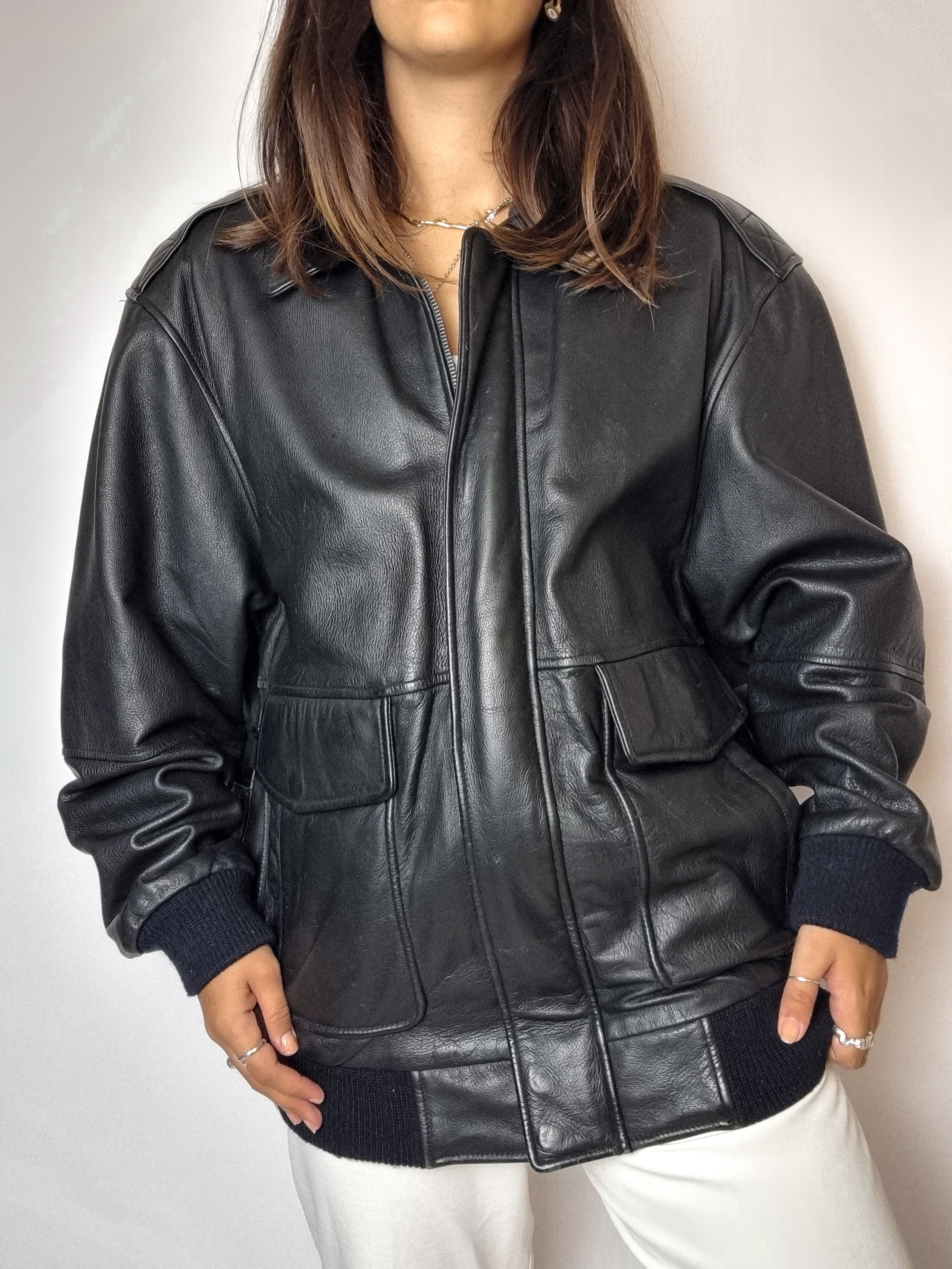 Bomber en cuir noir vintage L