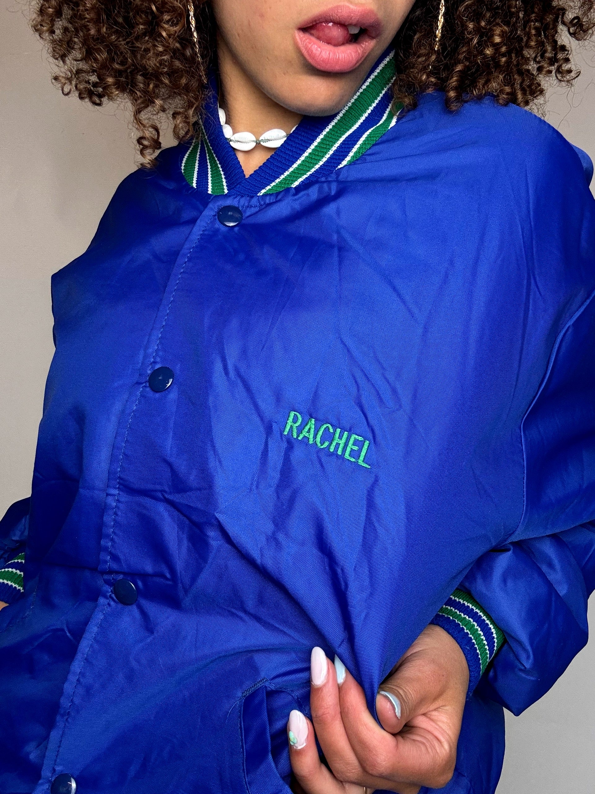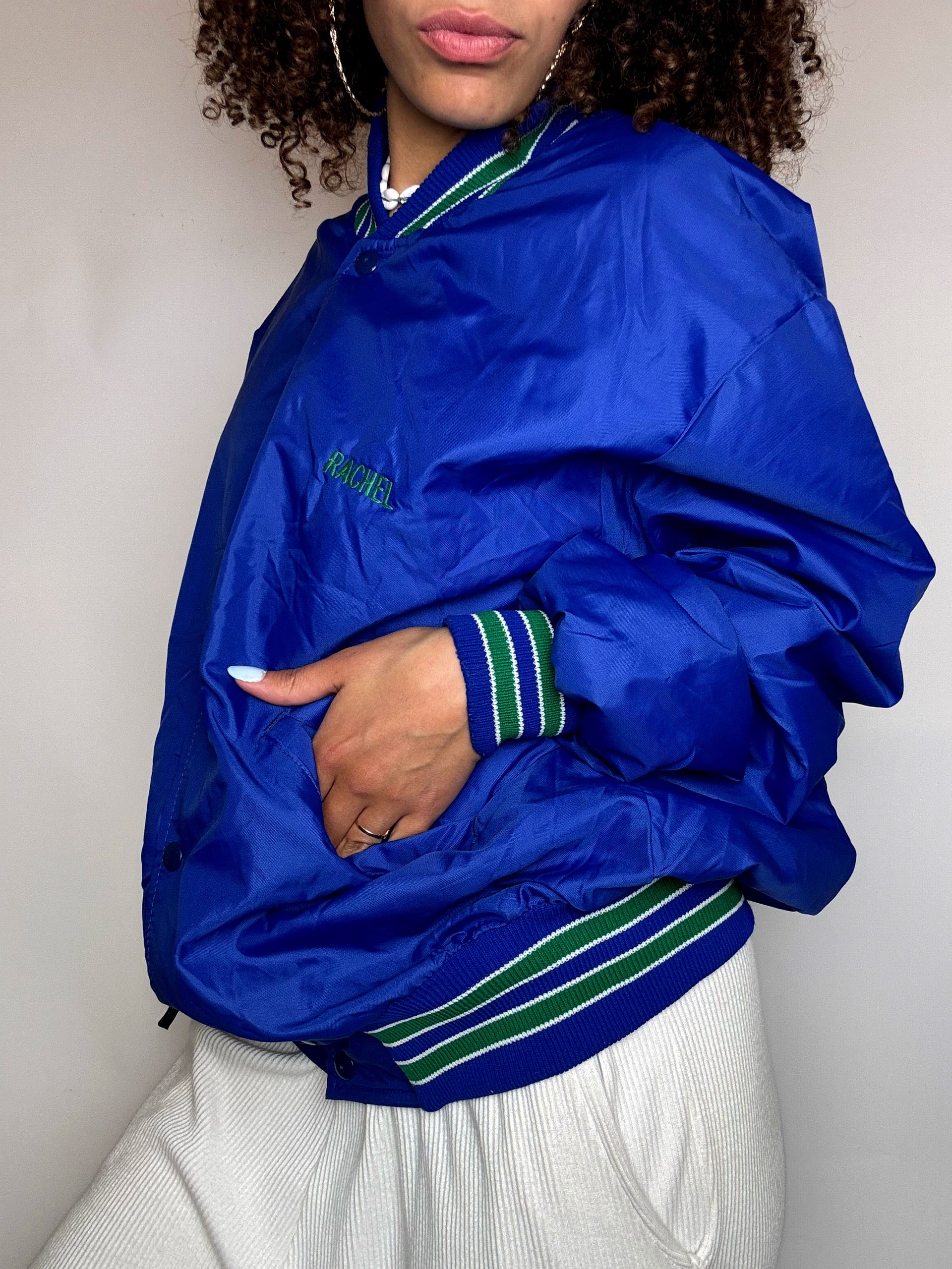 Le prénom Rachel brodé sur le devant indique qu’il s’agit d’une veste personnalisée, souvent portée fièrement par les membres de l’équipe lors d’événements scolaires ou de compétitions.