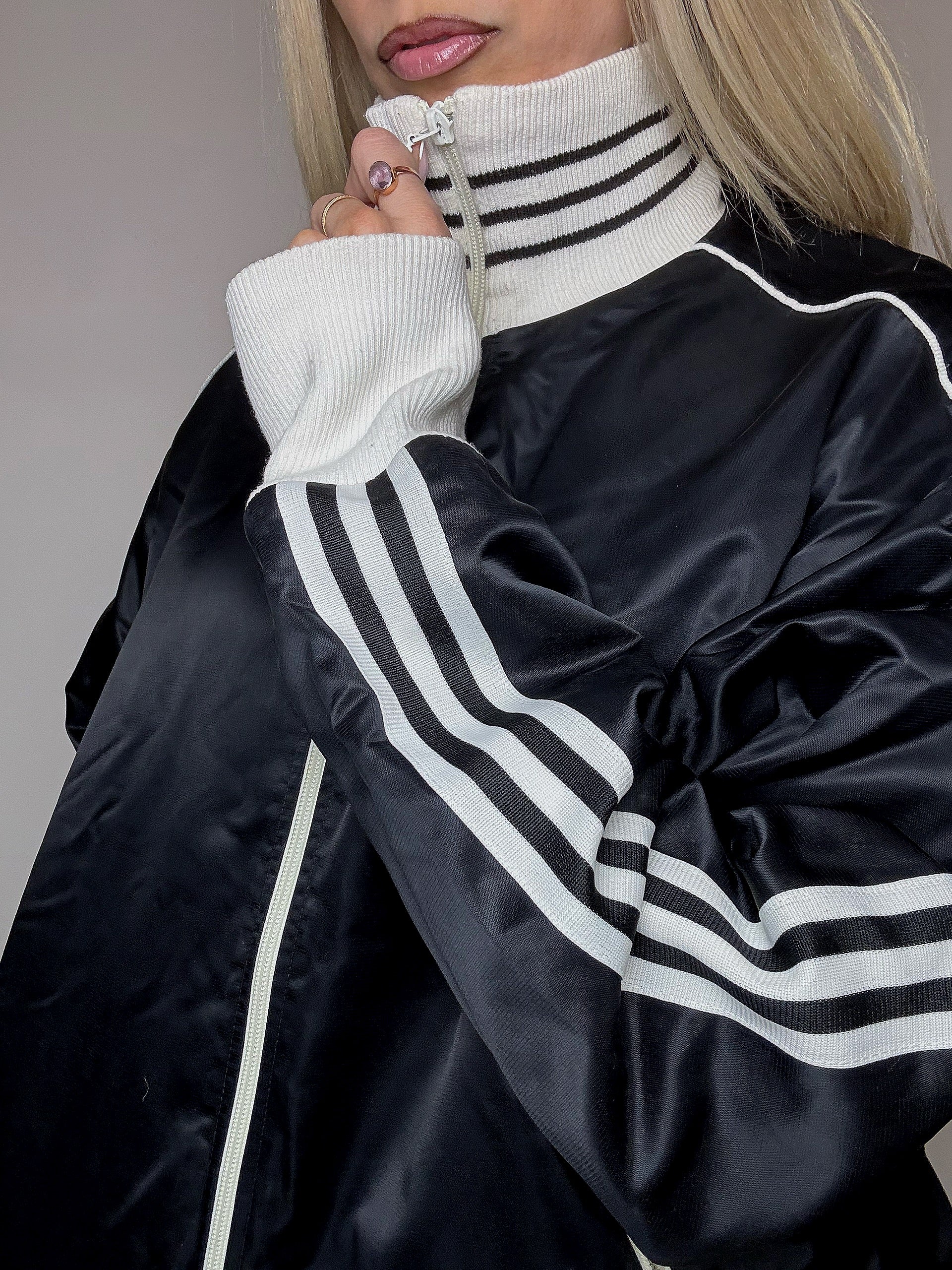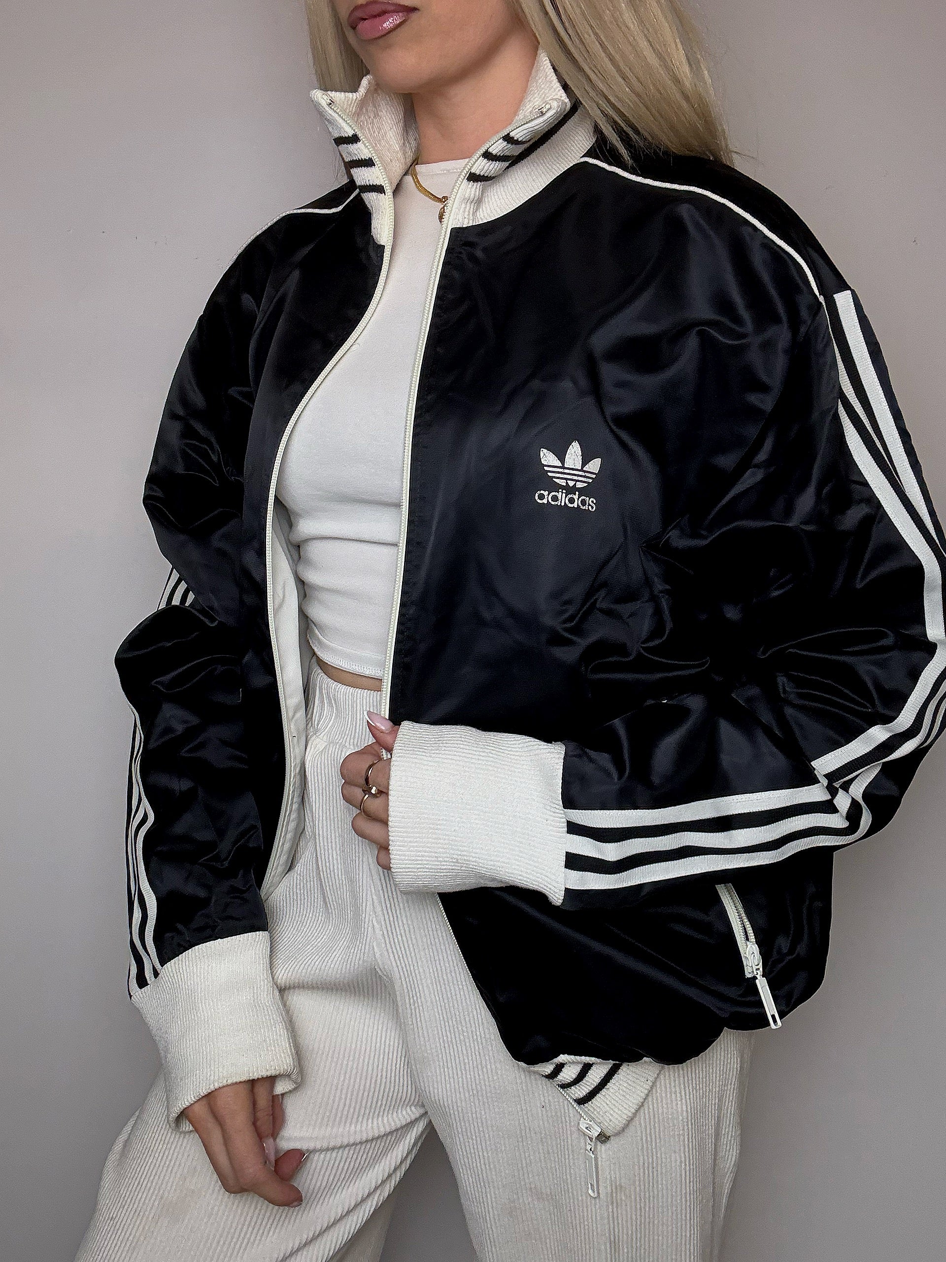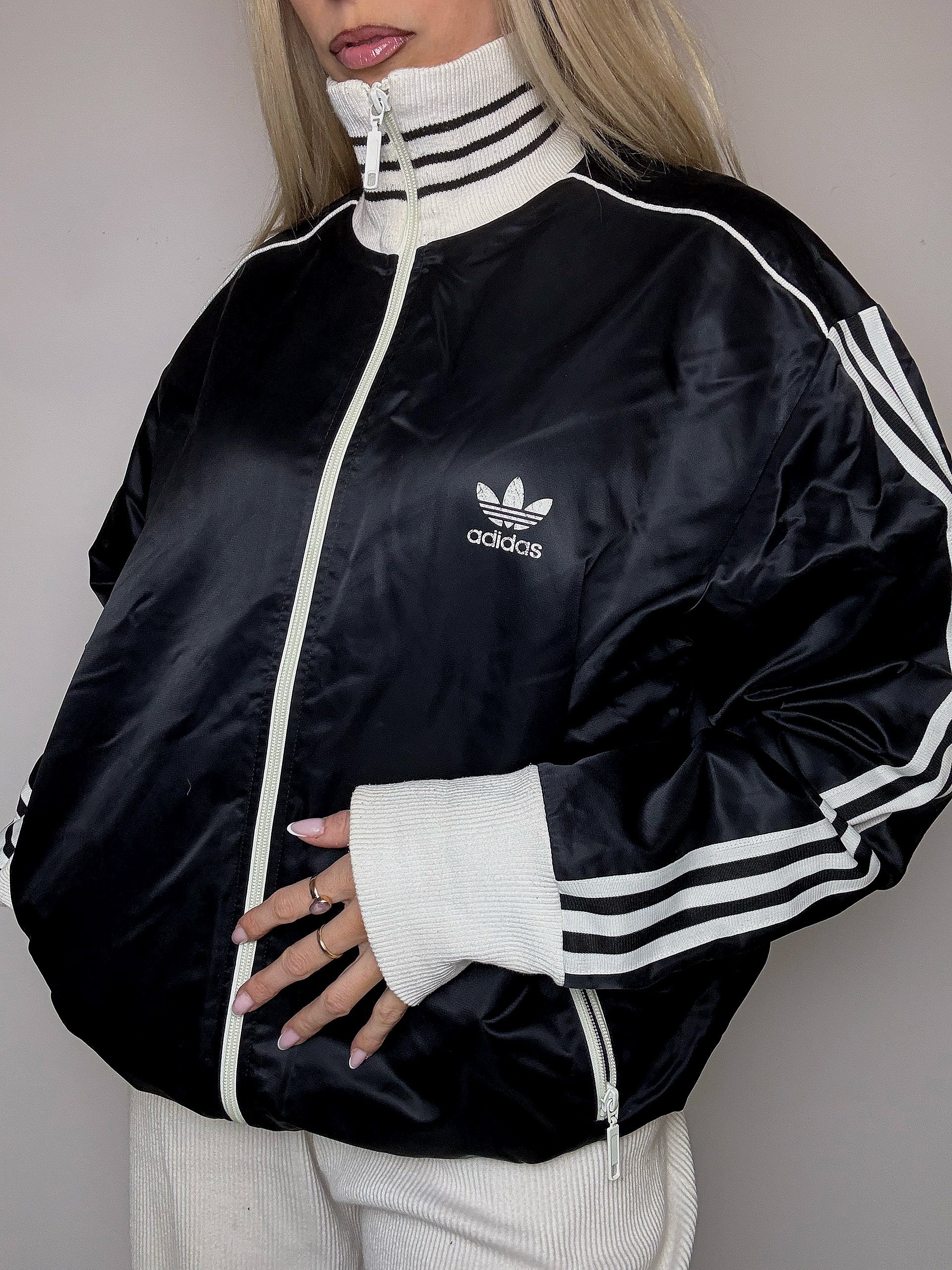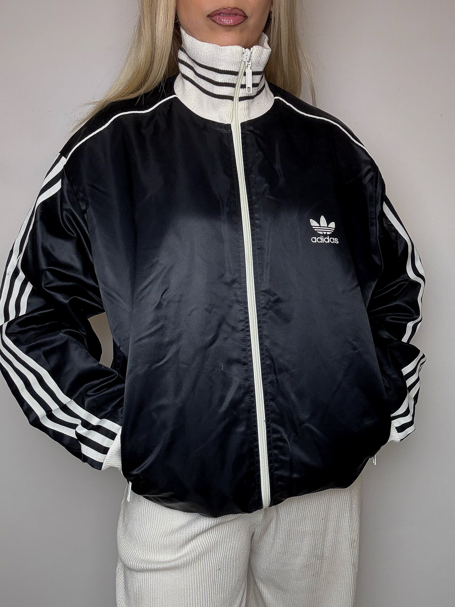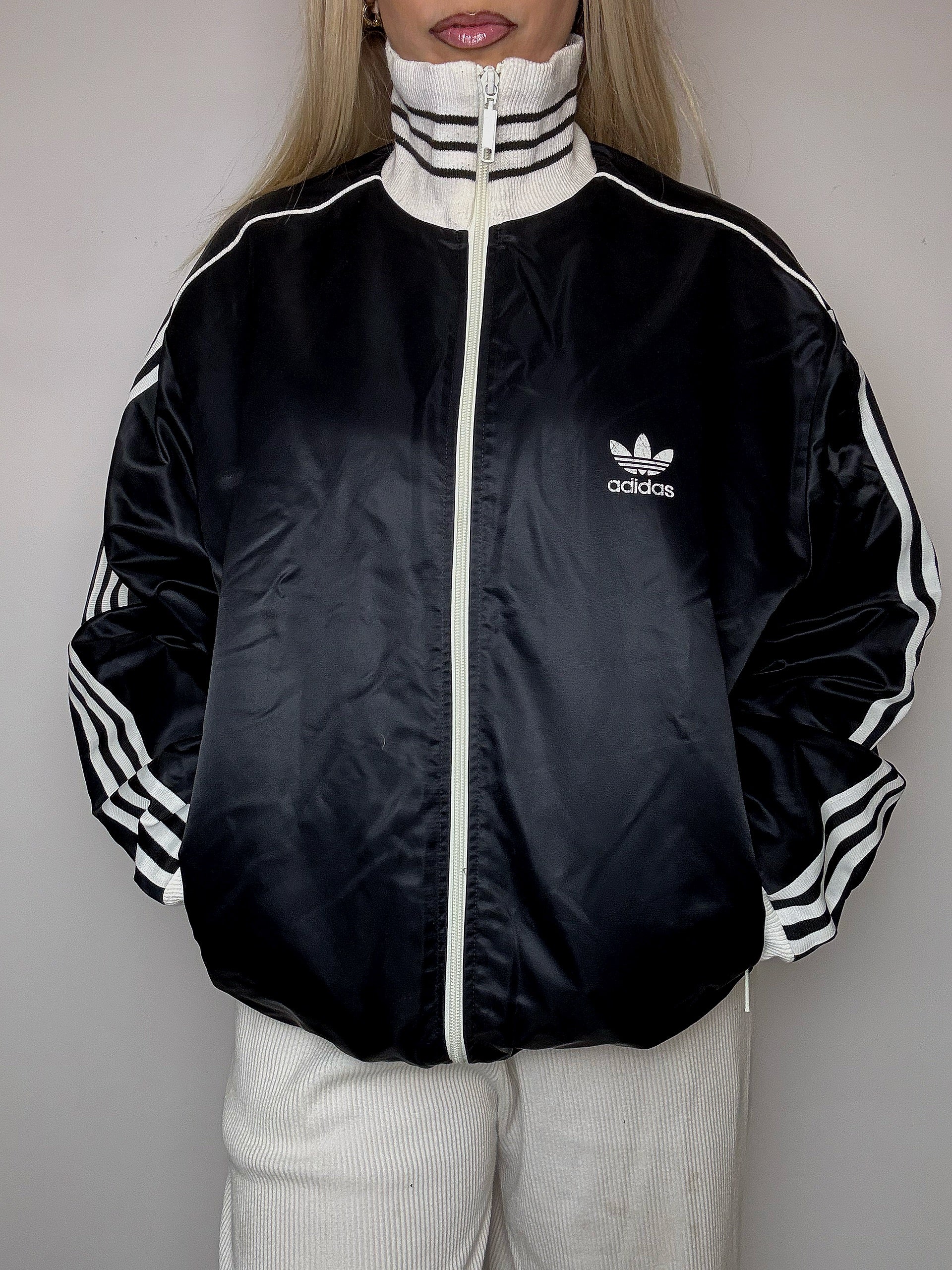 Une veste noire ADIDAS vintage ( en témoignent le logo trefoil et les bandes sur les manches )