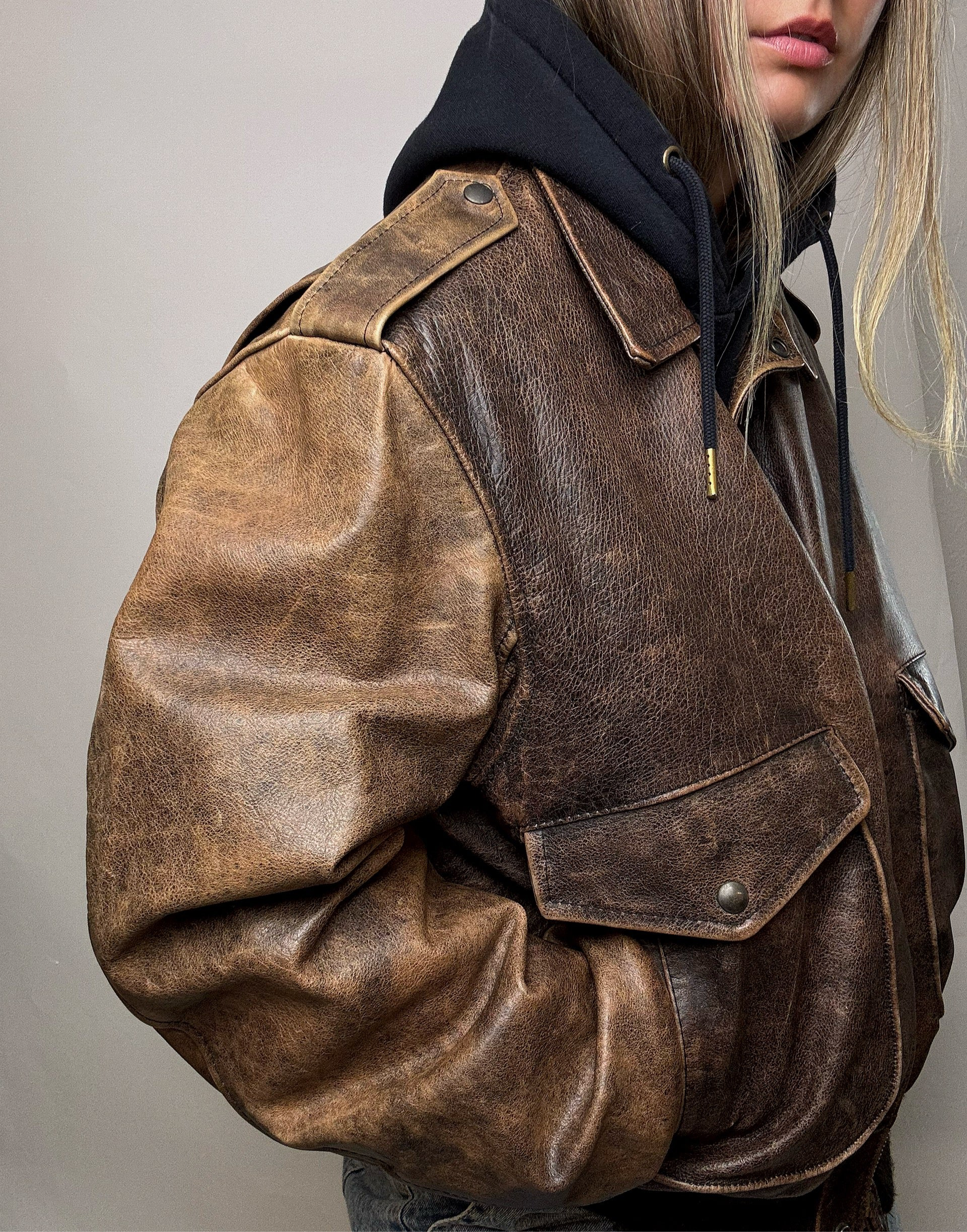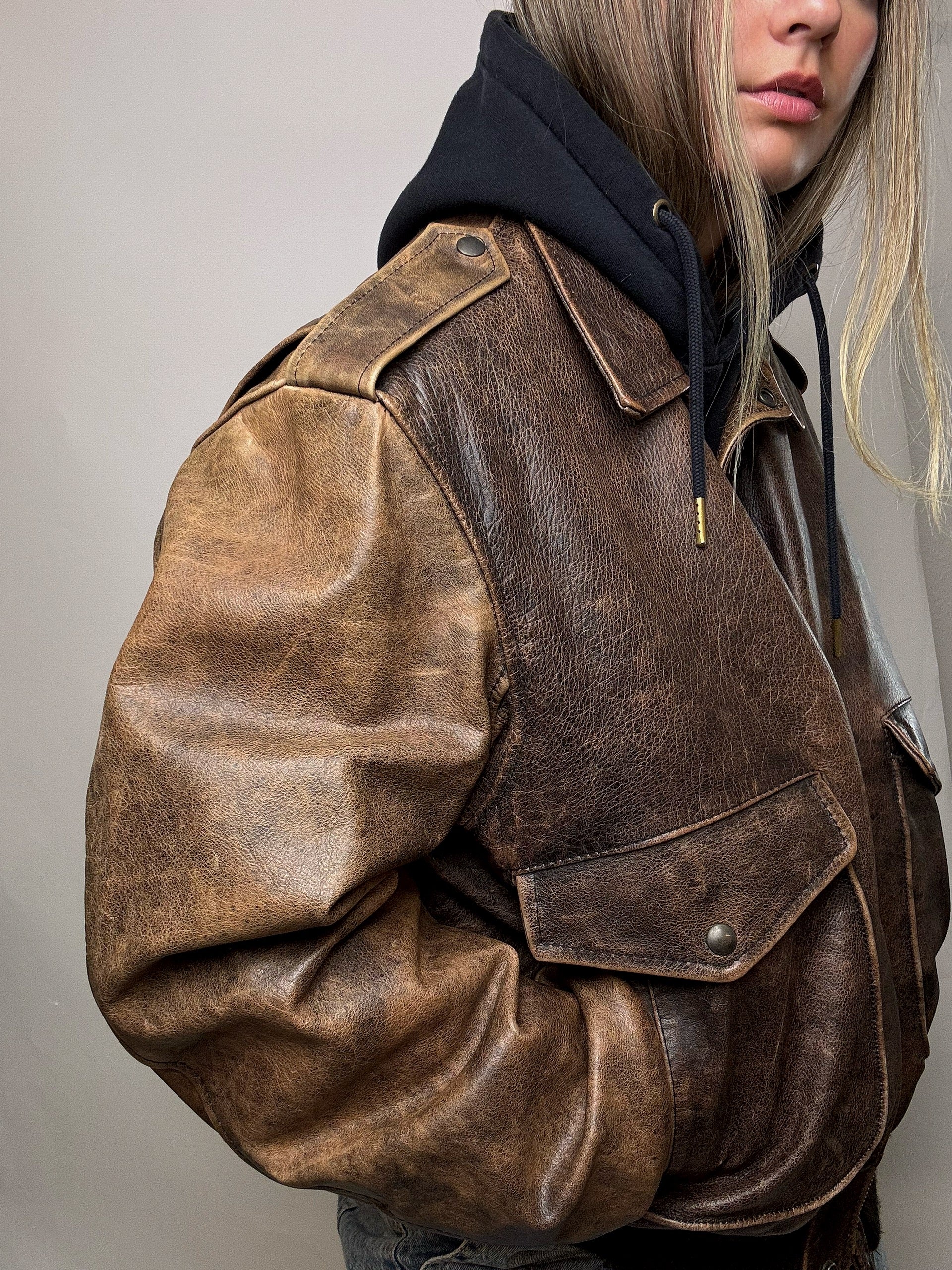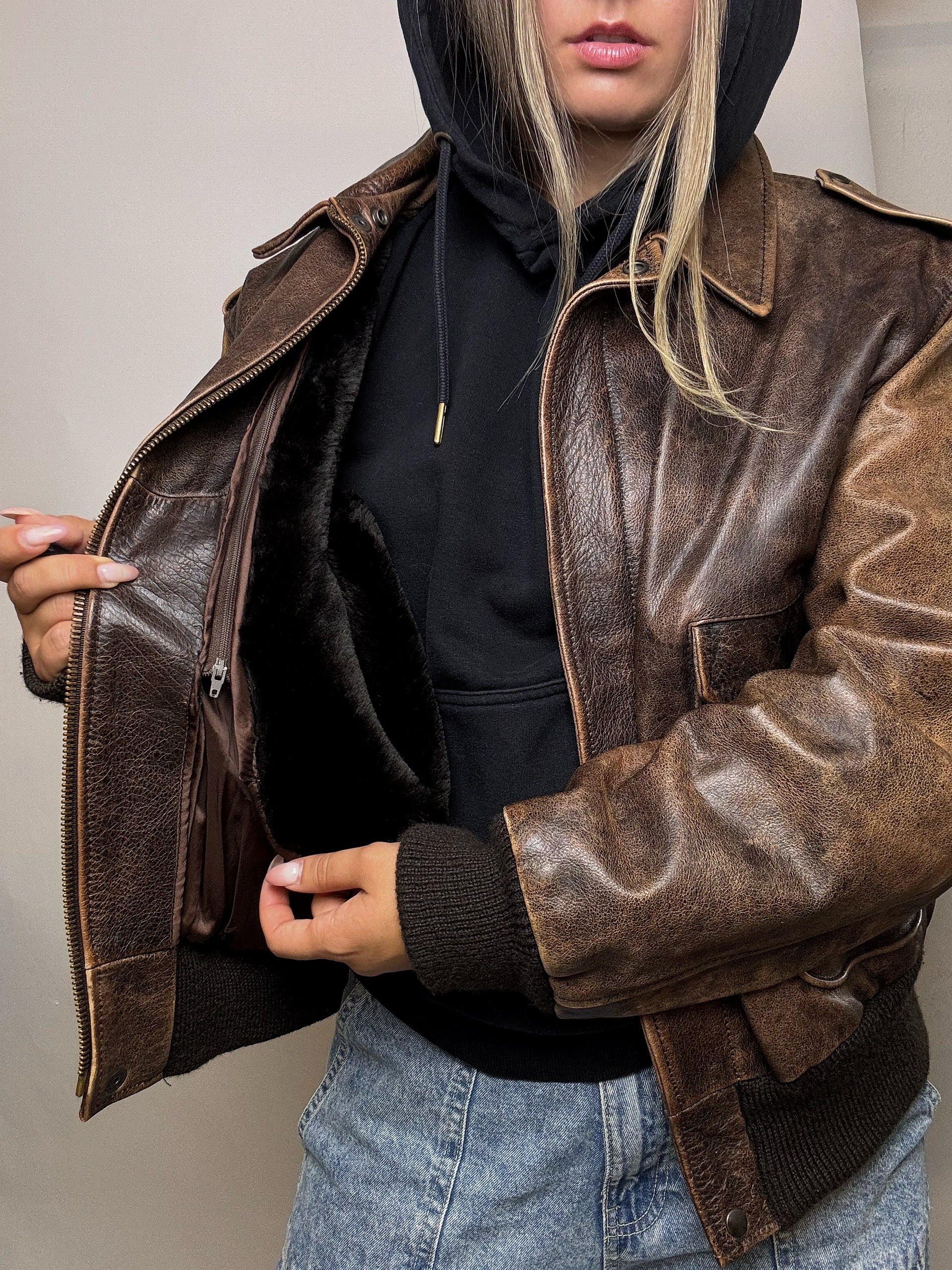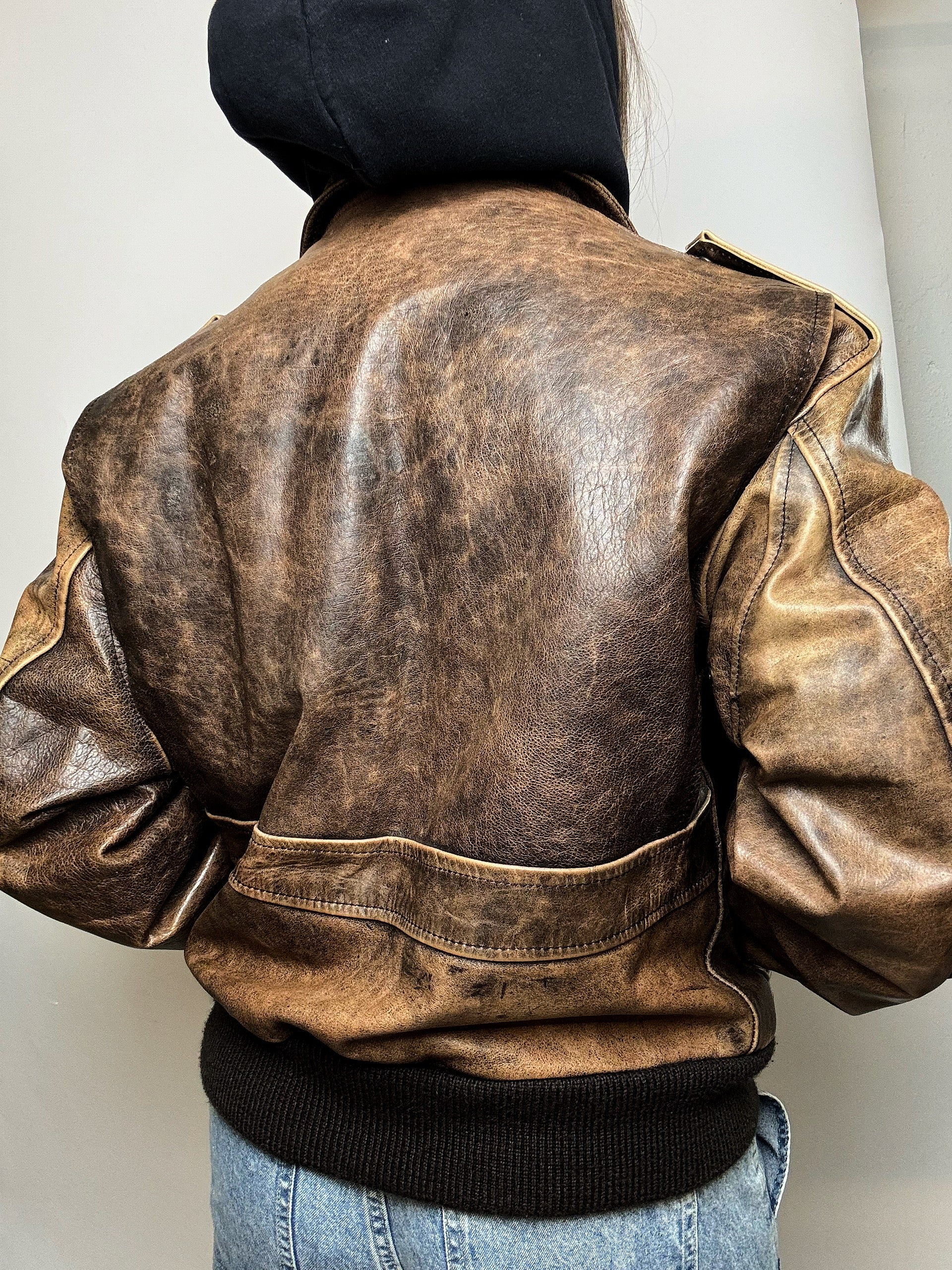 Splendide blouson style aviator en cuir ! Un intemporel, indispensable à ta garde robe ! Marques du temps sur un cuir qui vieillit parfaitement, avec de jolies variations/marques sur l’ensemble de la pièce !