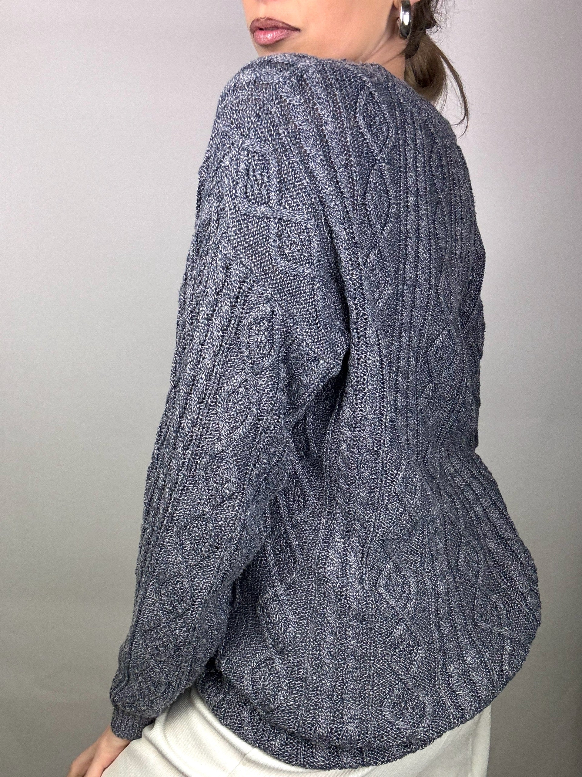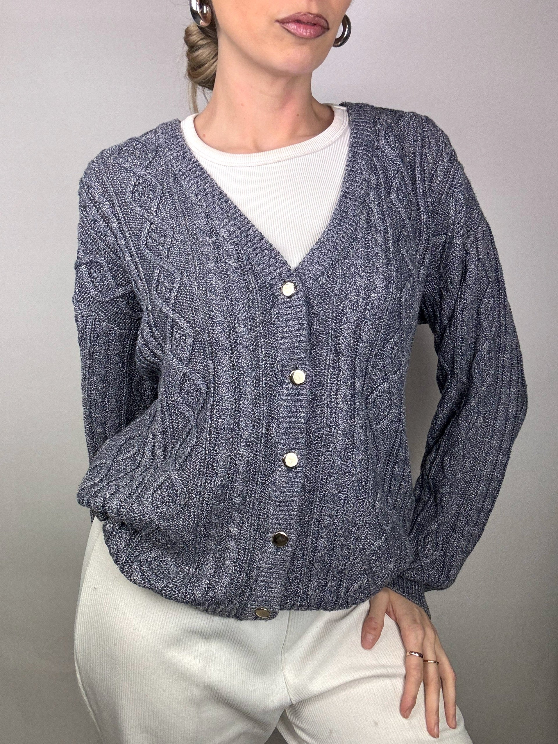 Cardigan tressé gris avec boutons bijoux M/L vintage