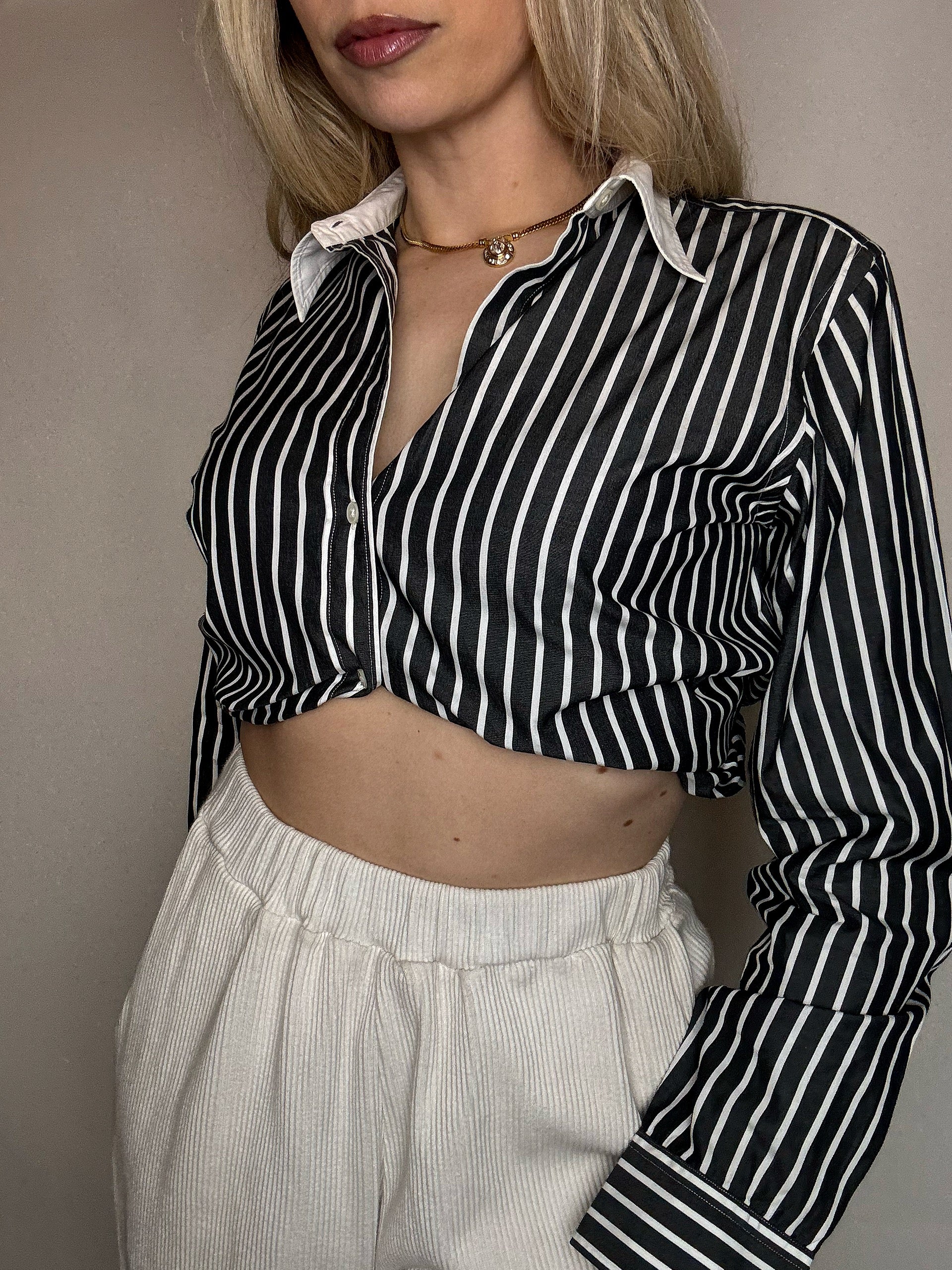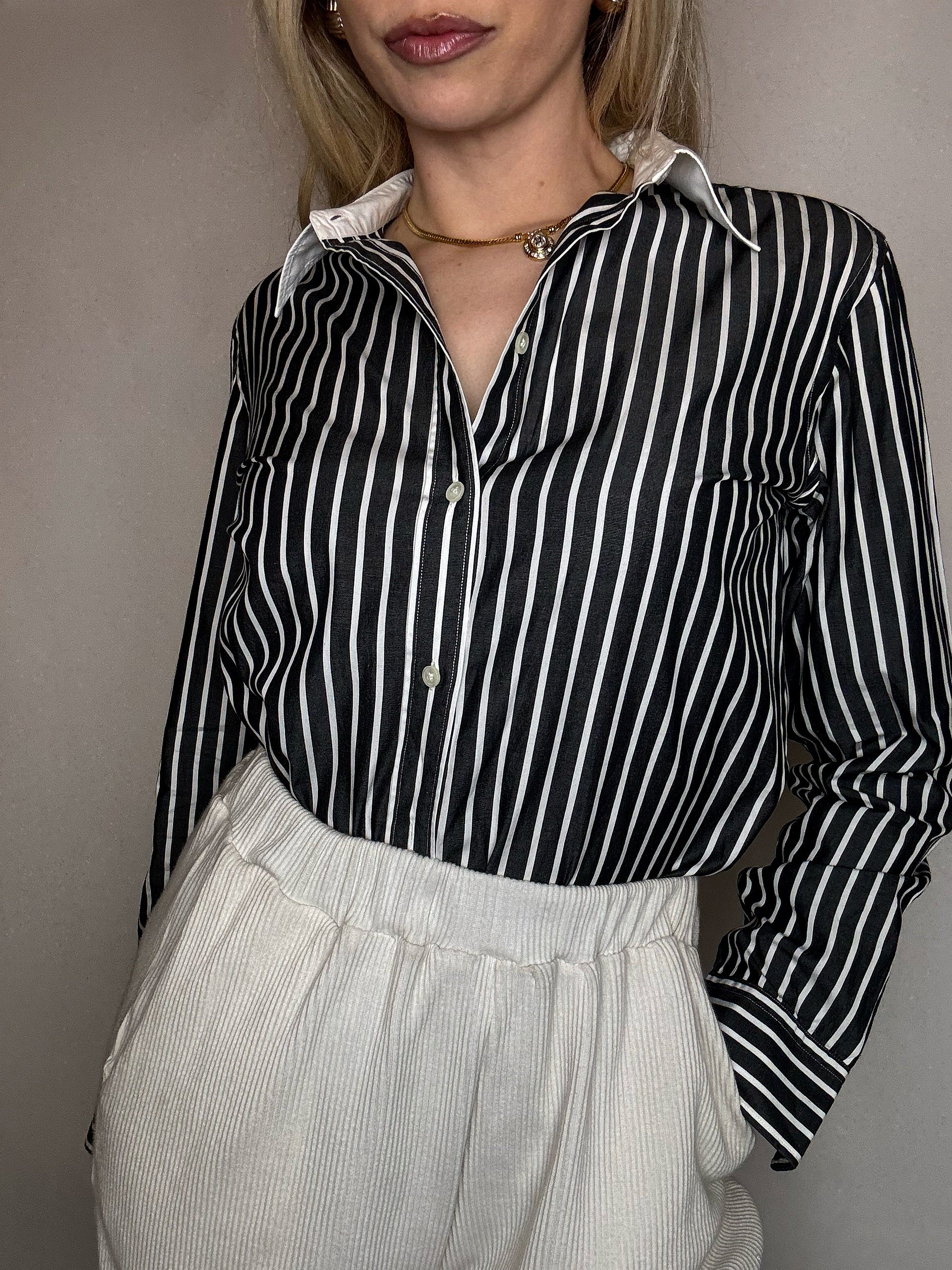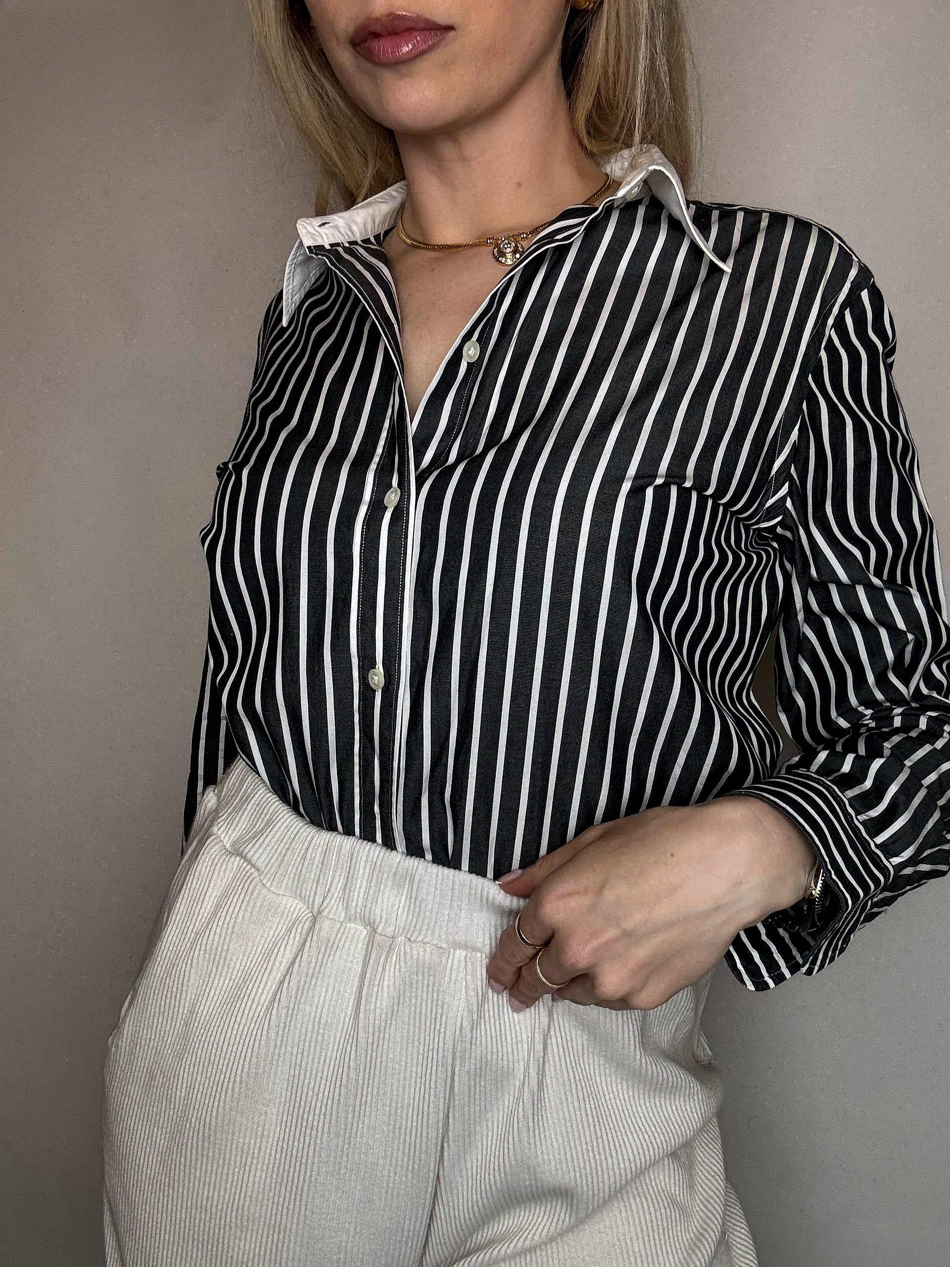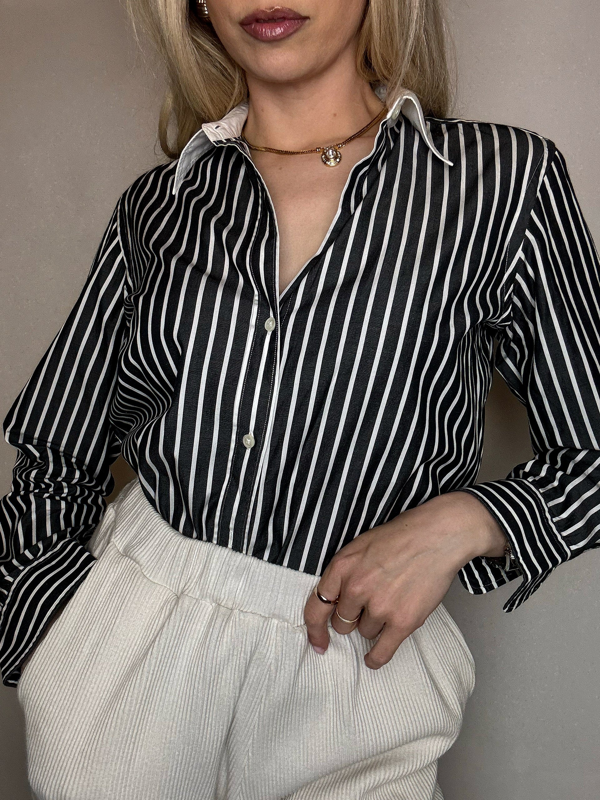 On adore ses rayures blanches sur noires et surtout le col blanc qui lui donne tout de suite une allure chic et old money !