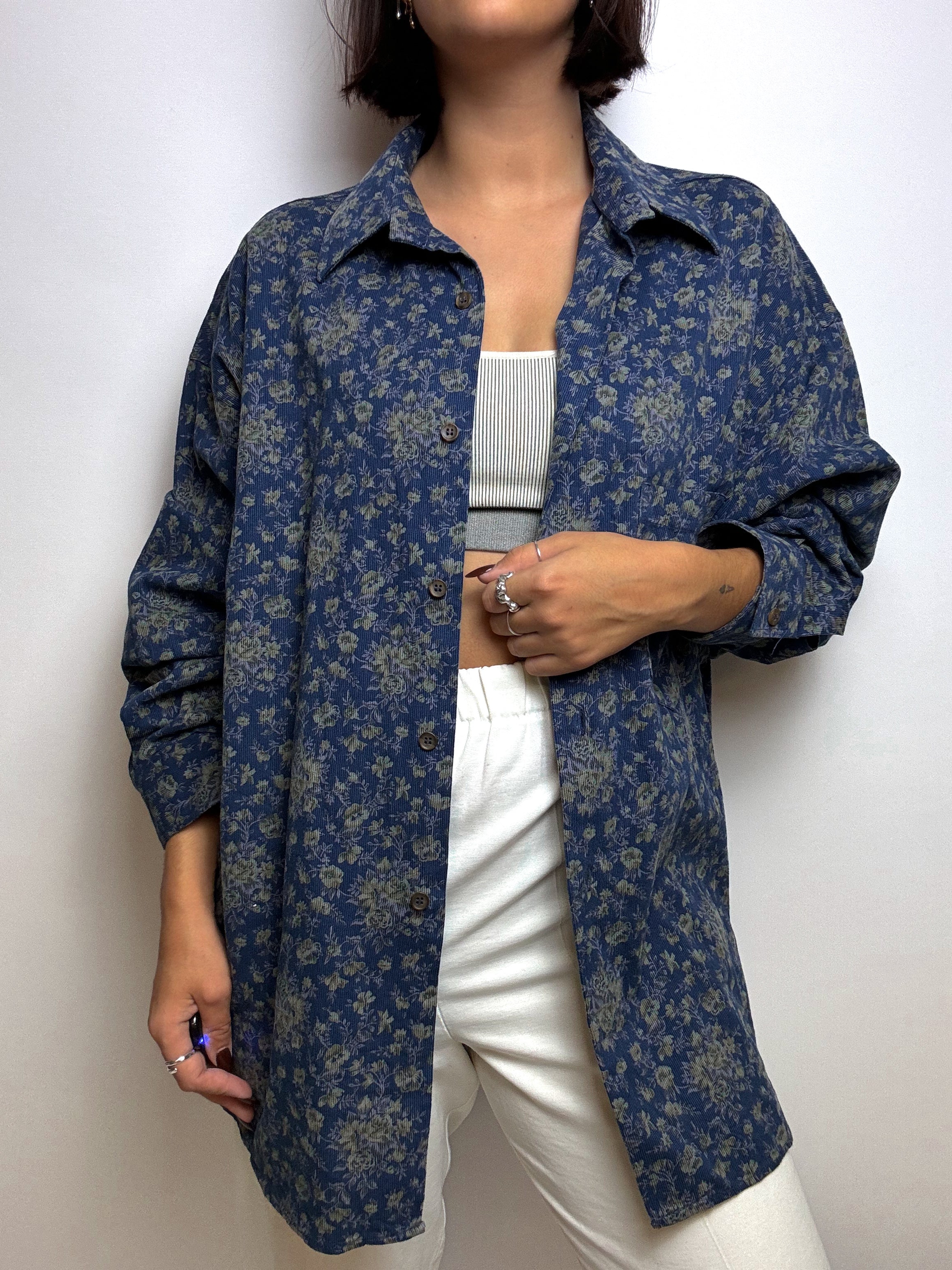 Chemise texturée bleue à fleurs vintage M/L