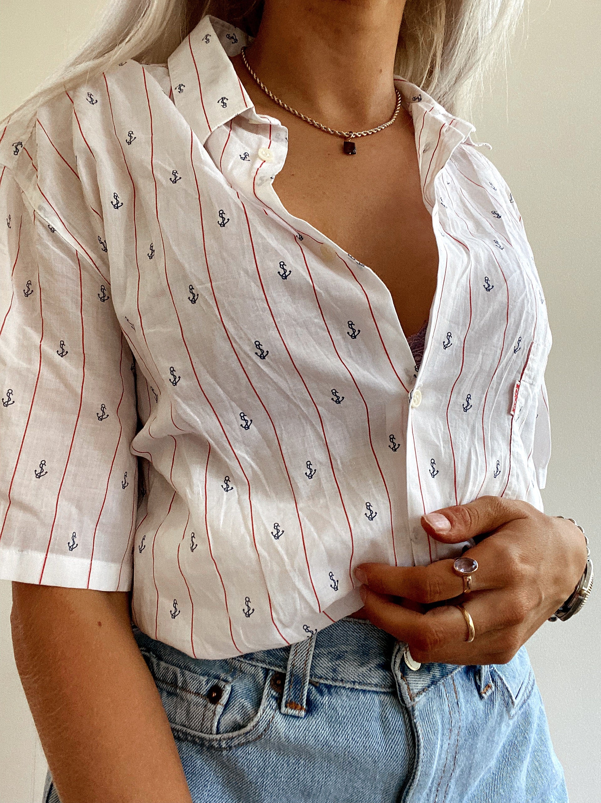 Chemise Vintage 80/90s blanche avec petites ancres bleues