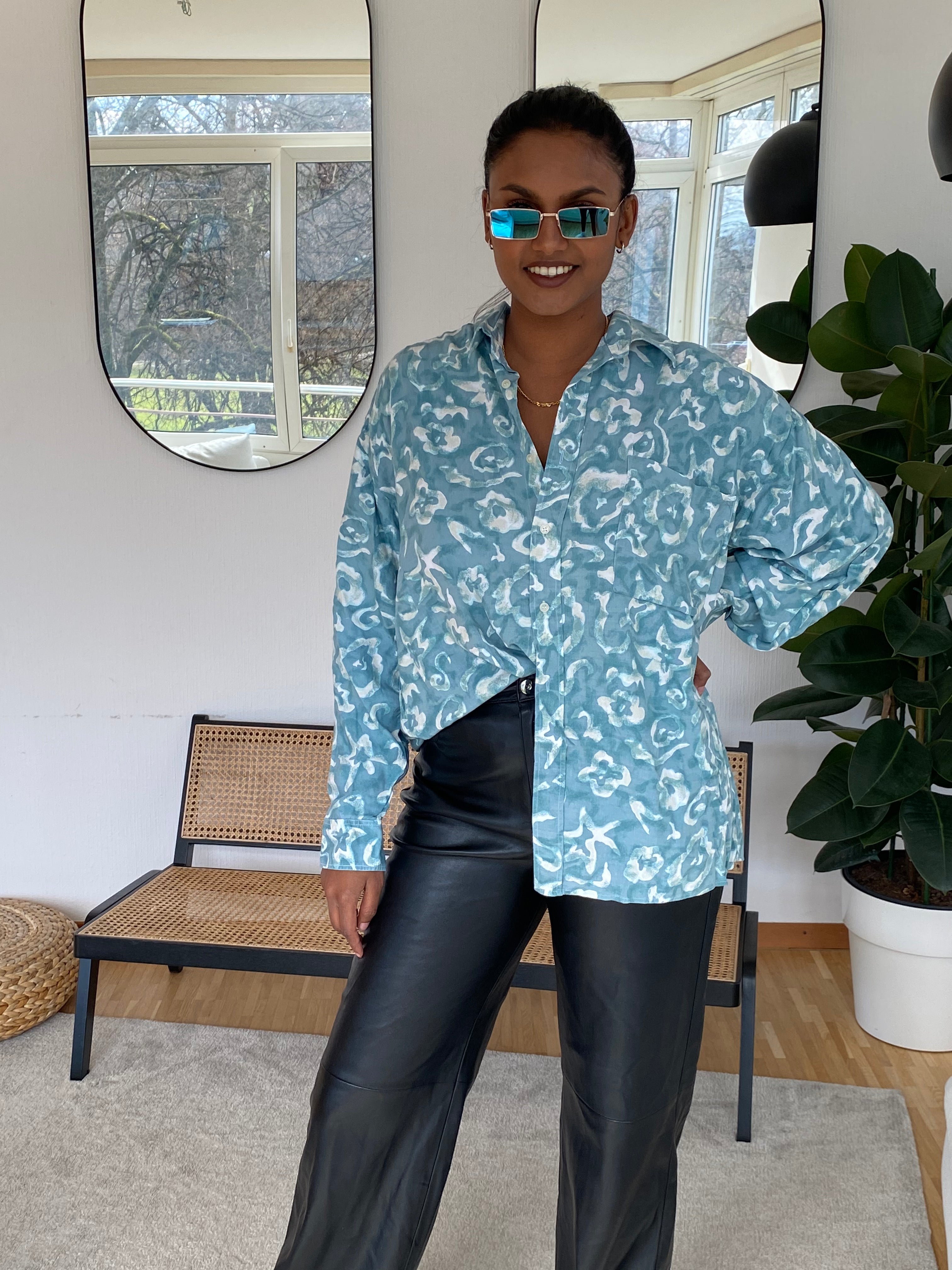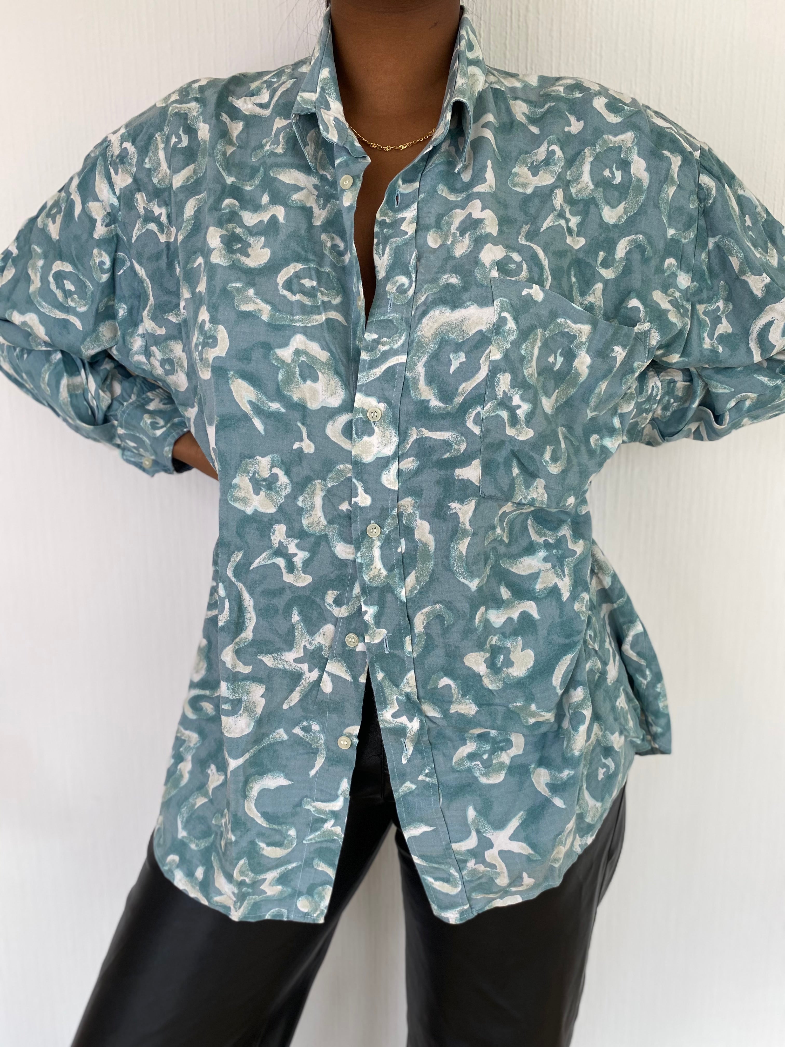 Chemise Vintage 80/90s blanche et turquoise à motifs XL