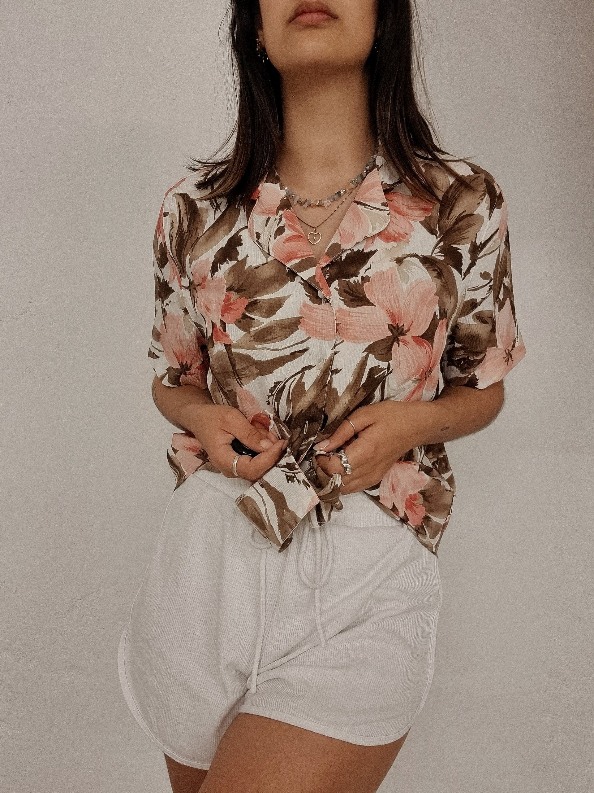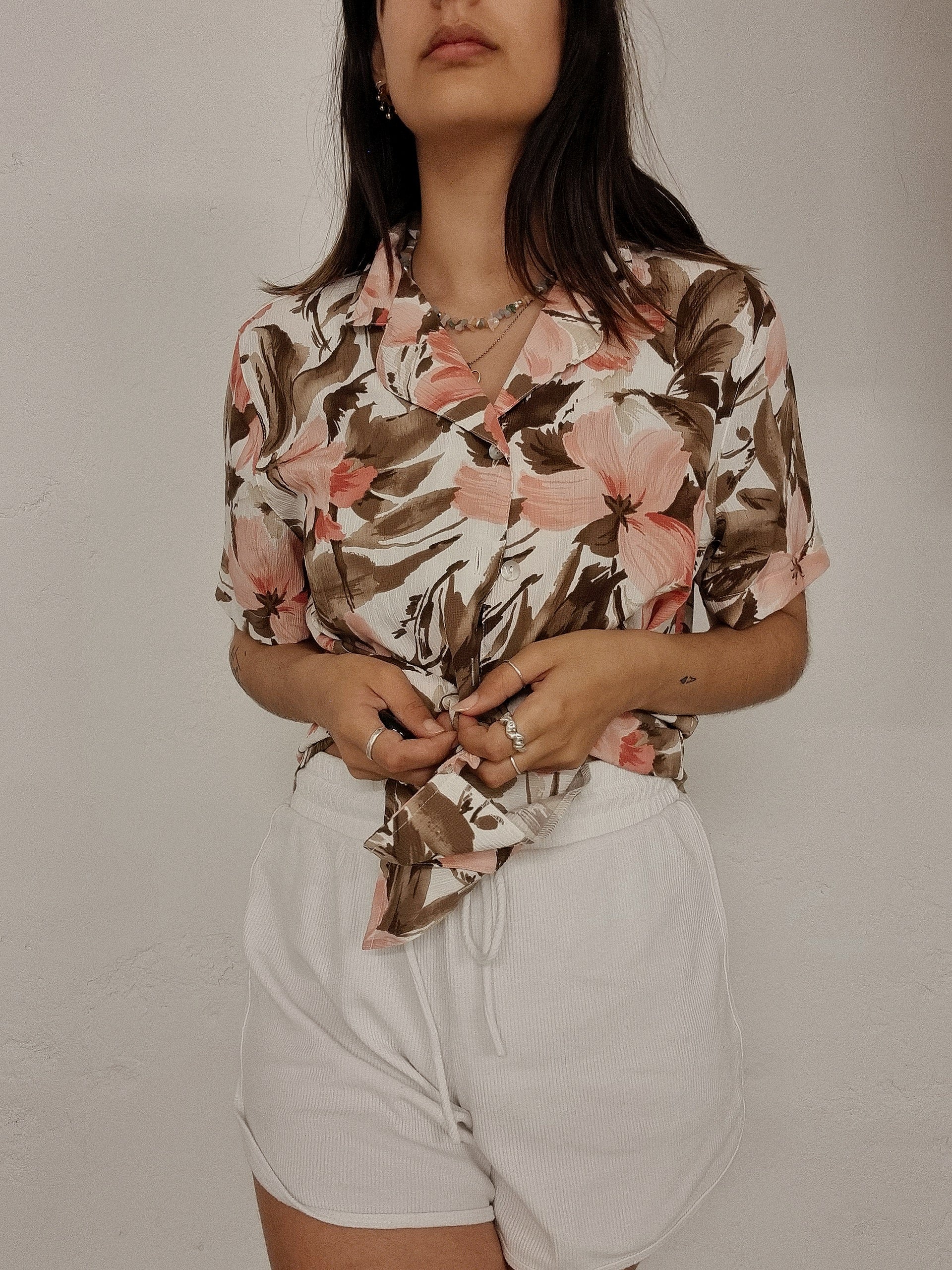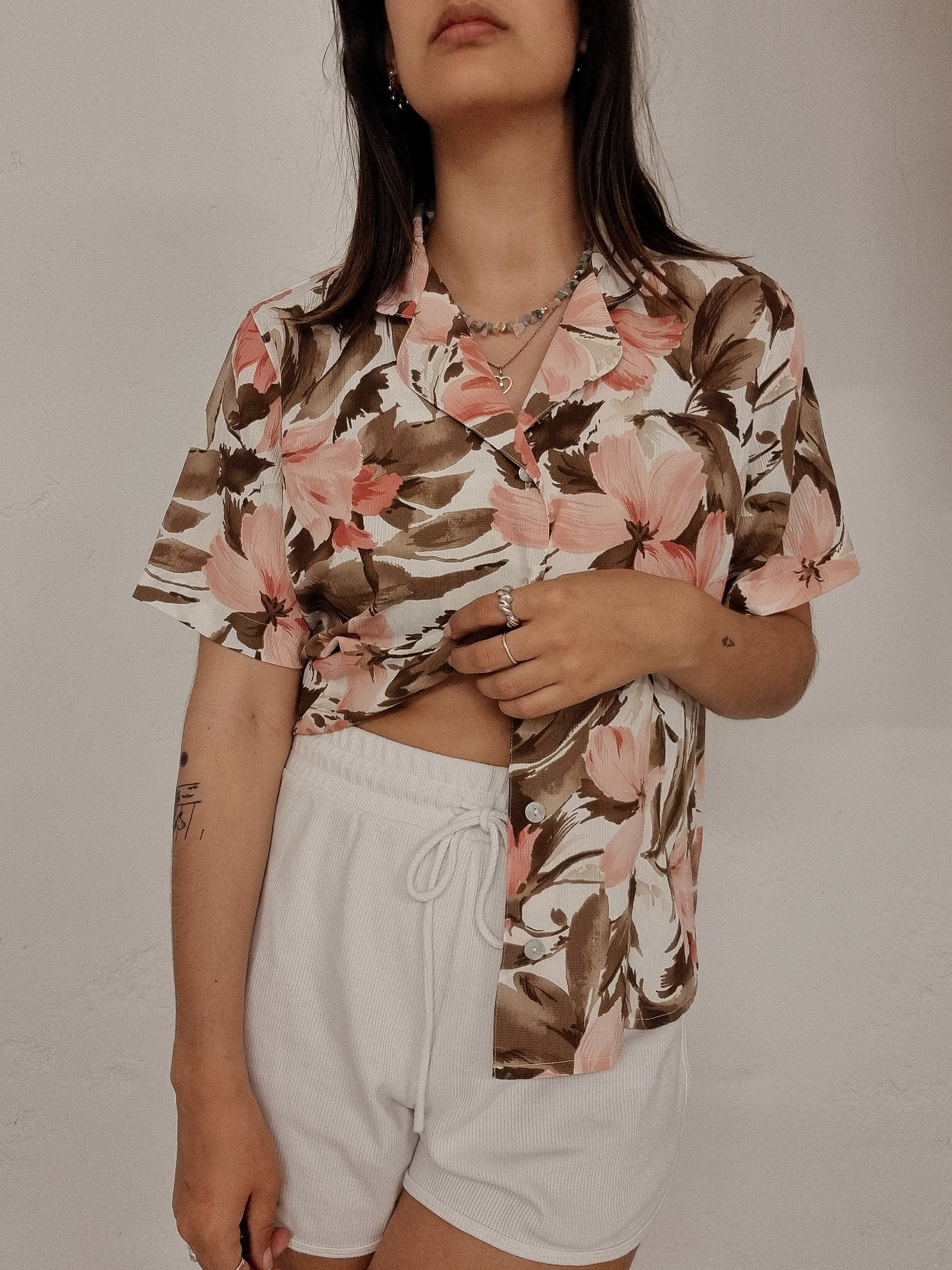 Chemise vintage blanche à fleurs hawaïenne rose M
