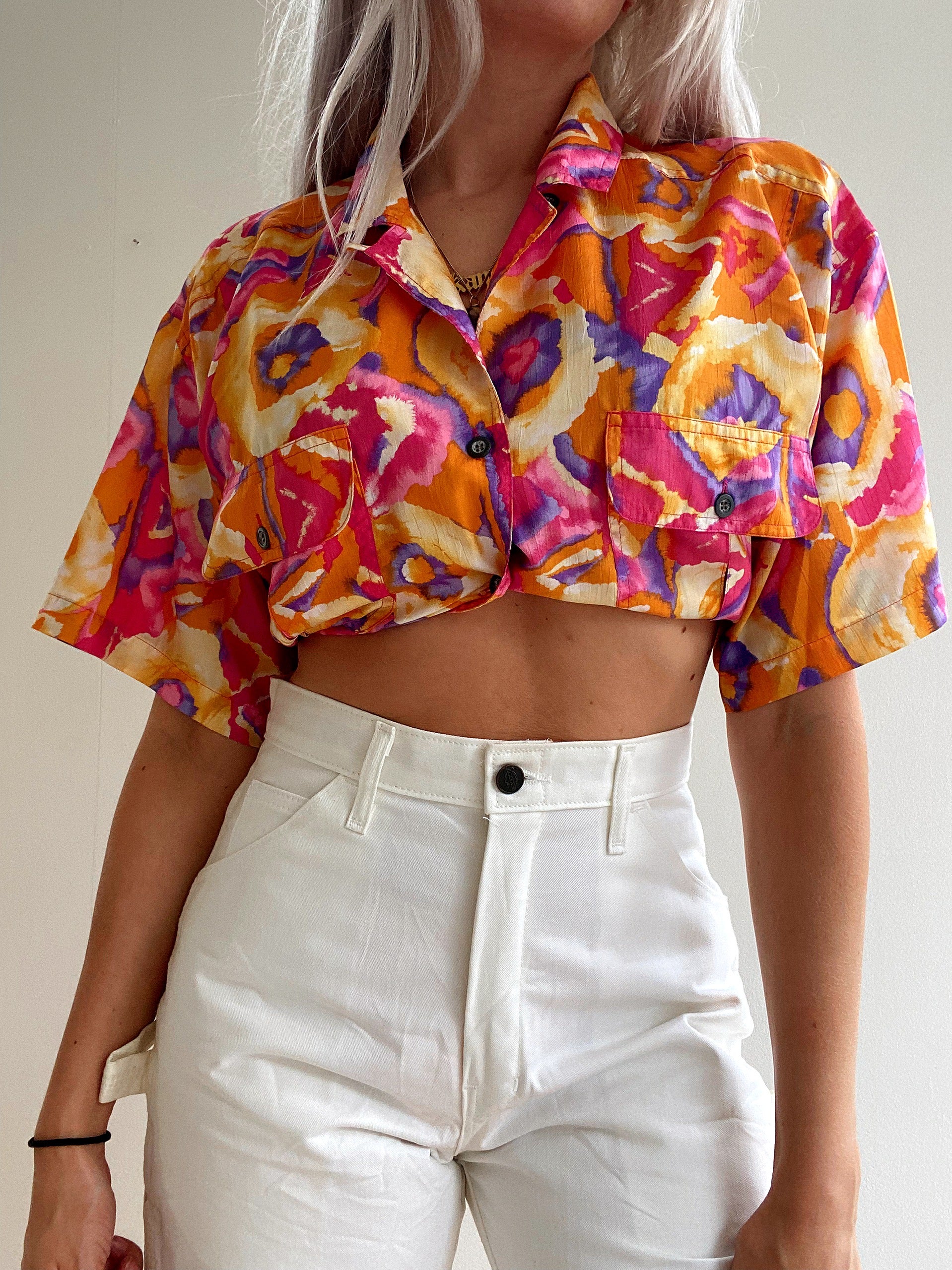Chemise Vintage 80/90s orange et roses à motifs