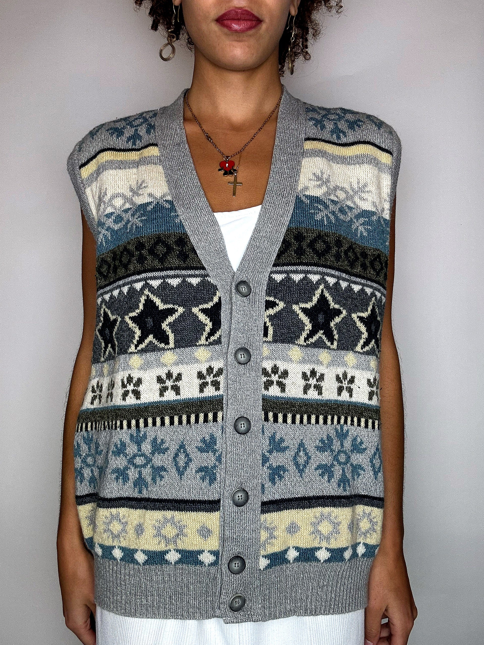 Gilet en maille bleu gris et beige L/XL vintage