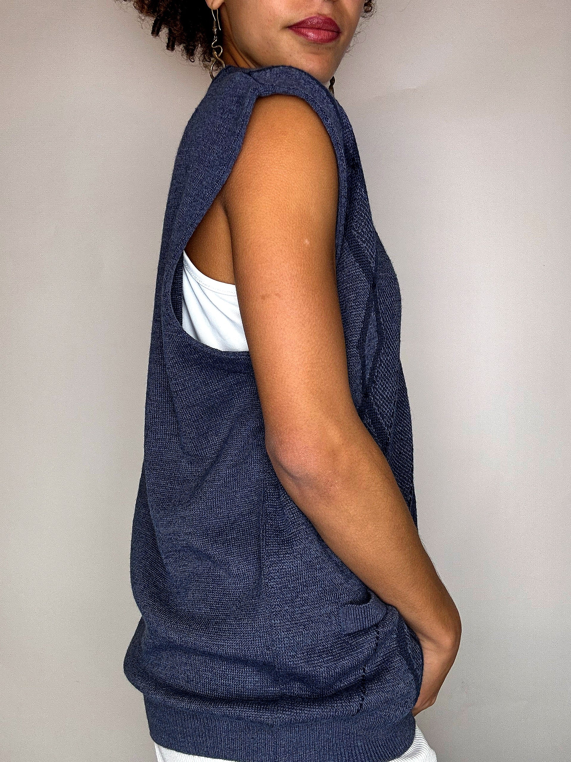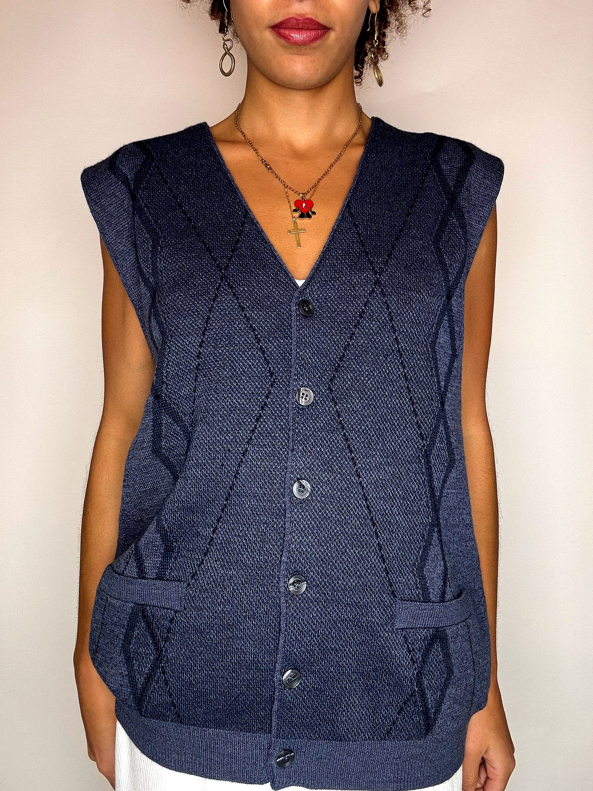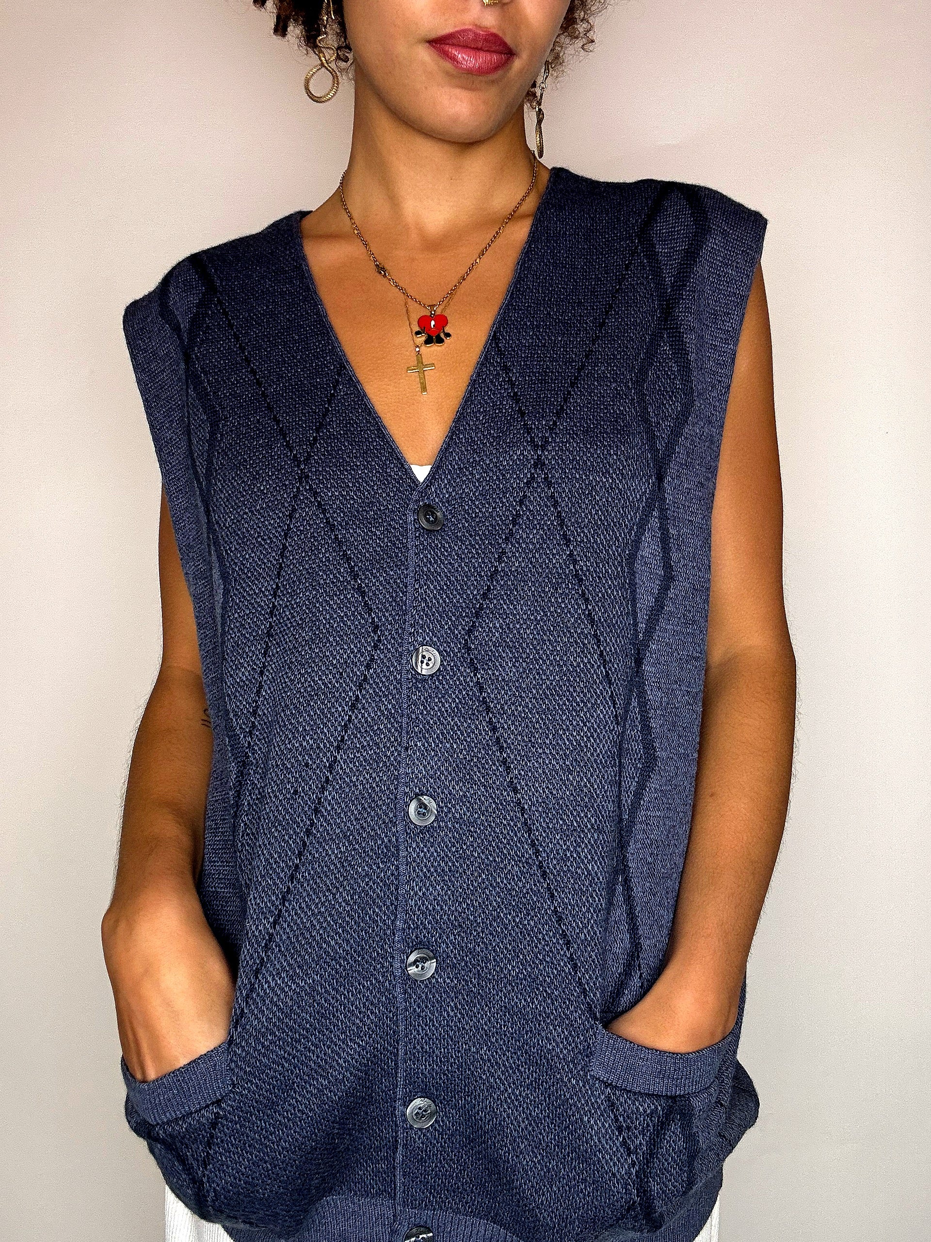 Gilet en maille bleu marine à carreaux L/XL vintage