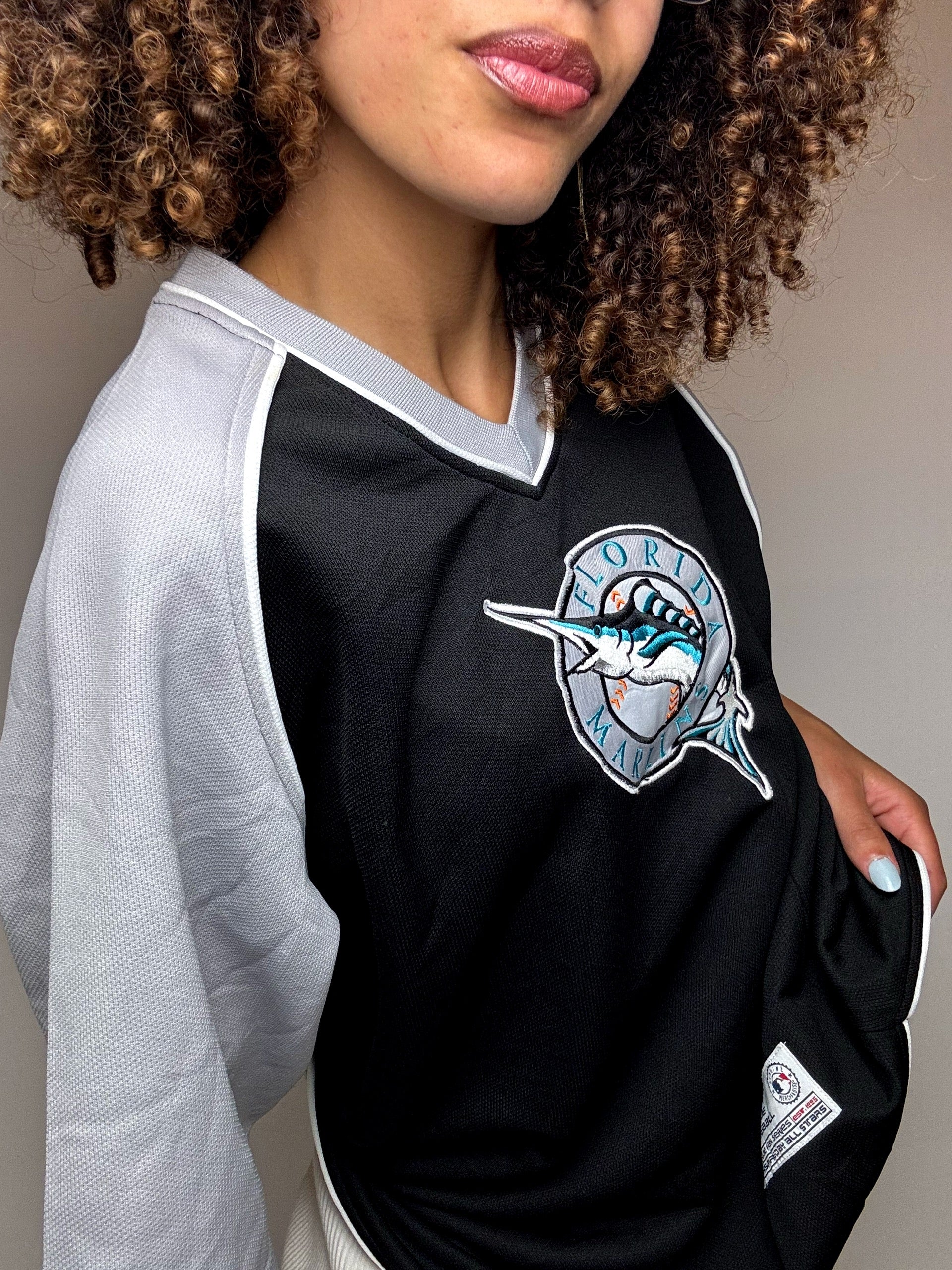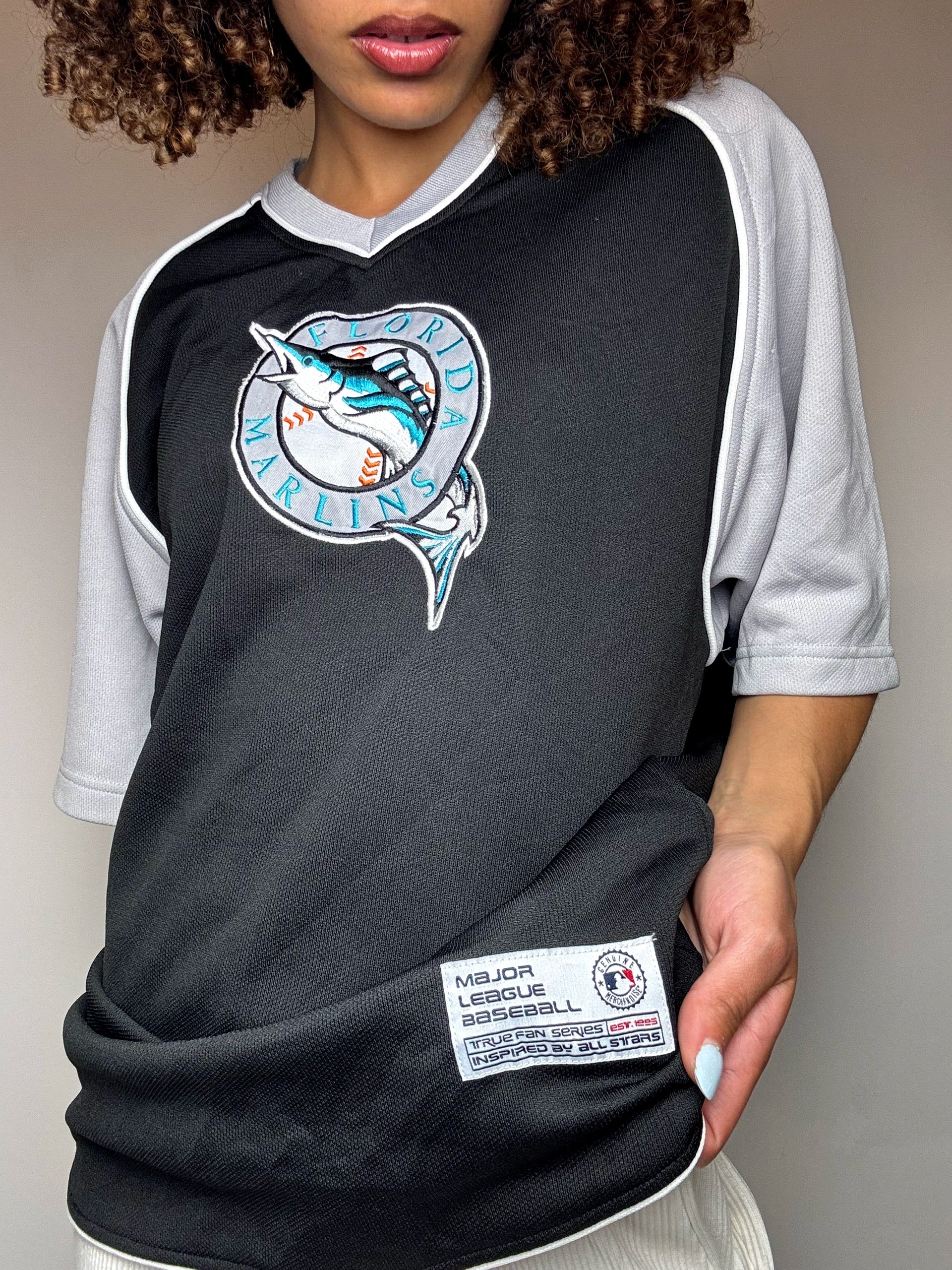 Pièce vintage dédiée aux Florida Marlins, franchise MLB fondée en 1993 à Miami. Design gris et noir, avec un marlin élancé (souvent pris pour un requin) et une balle de baseball en fond, emblèmes de l’équipe. Ce maillot capture l’esthétique rétro du club avant qu’il ne devienne les Miami Marlins. Une pièce rare et pleine de caractère pour les amateurs de baseball et de sportswear américain !