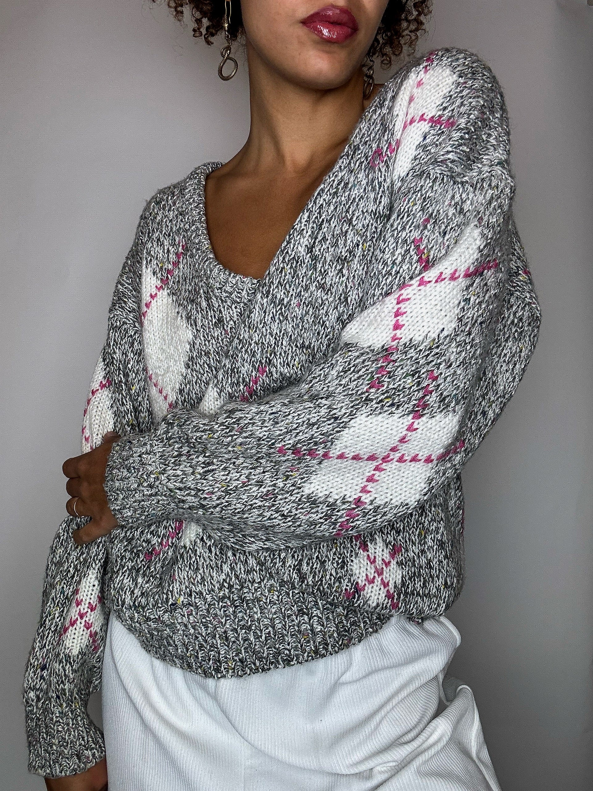 Pull gris à carreaux losanges rose M vintage
