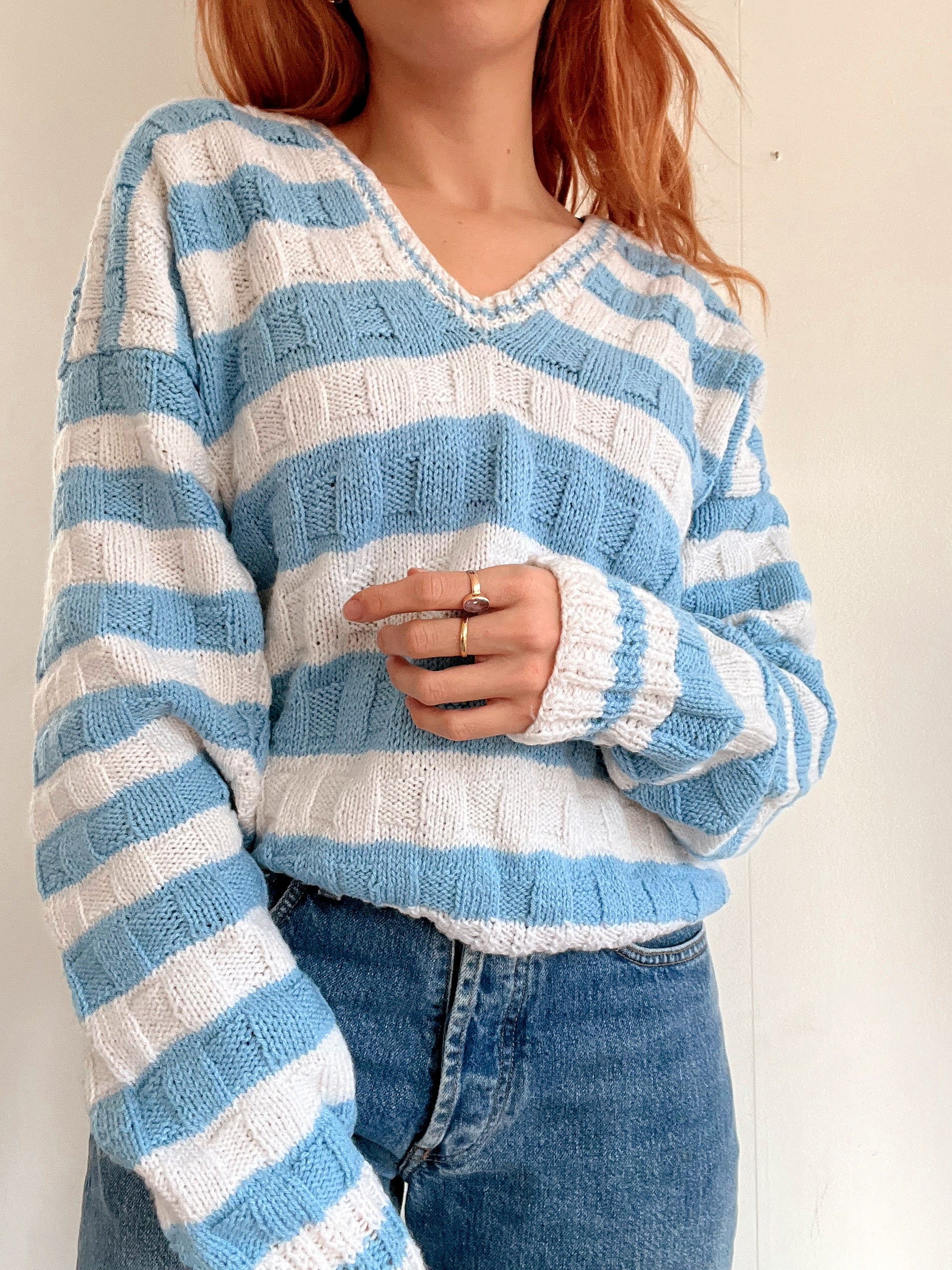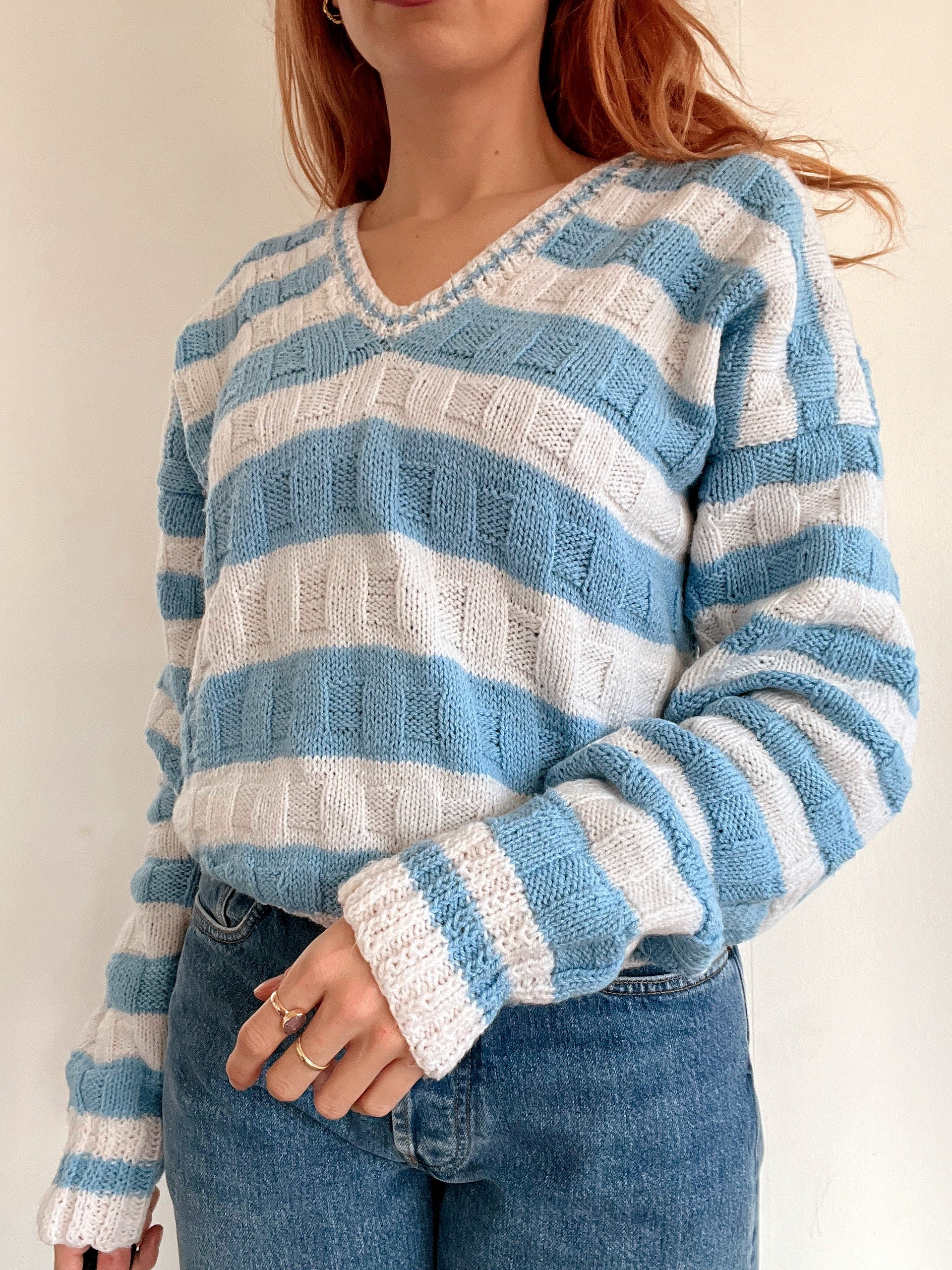 Pull vintage en maille bleu clair et blanc M/L