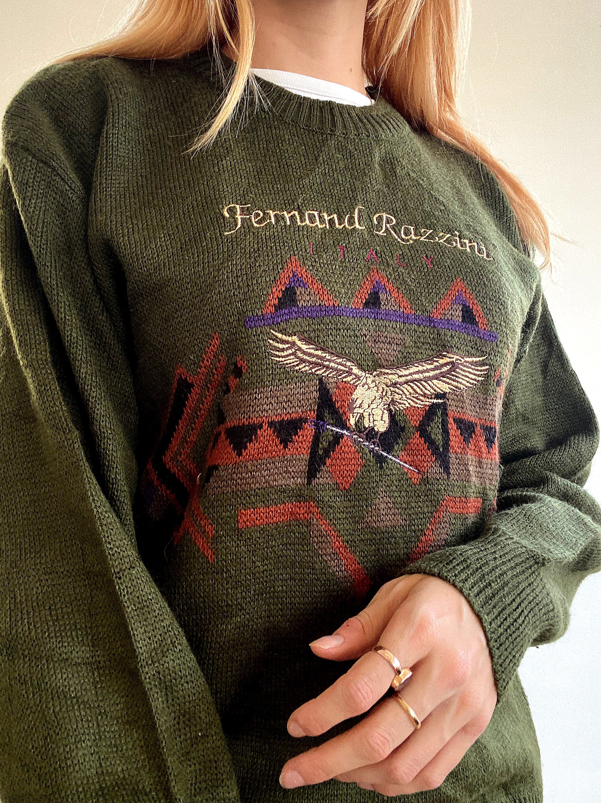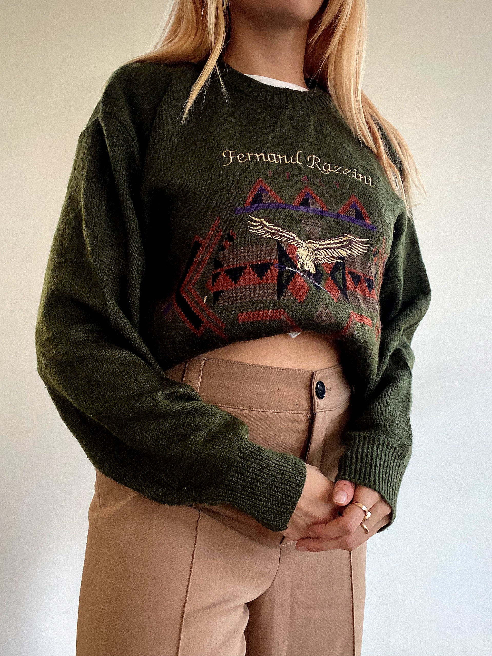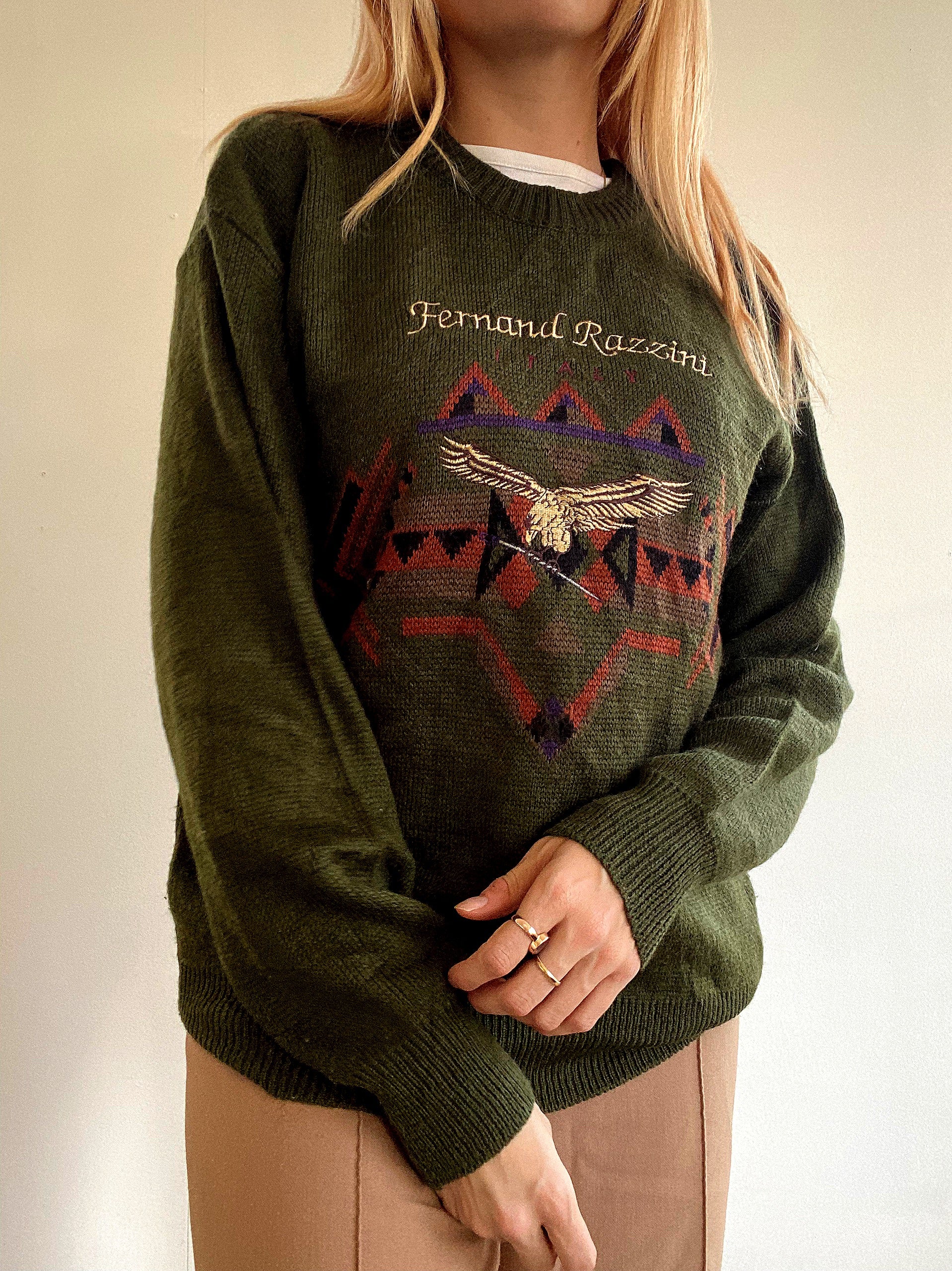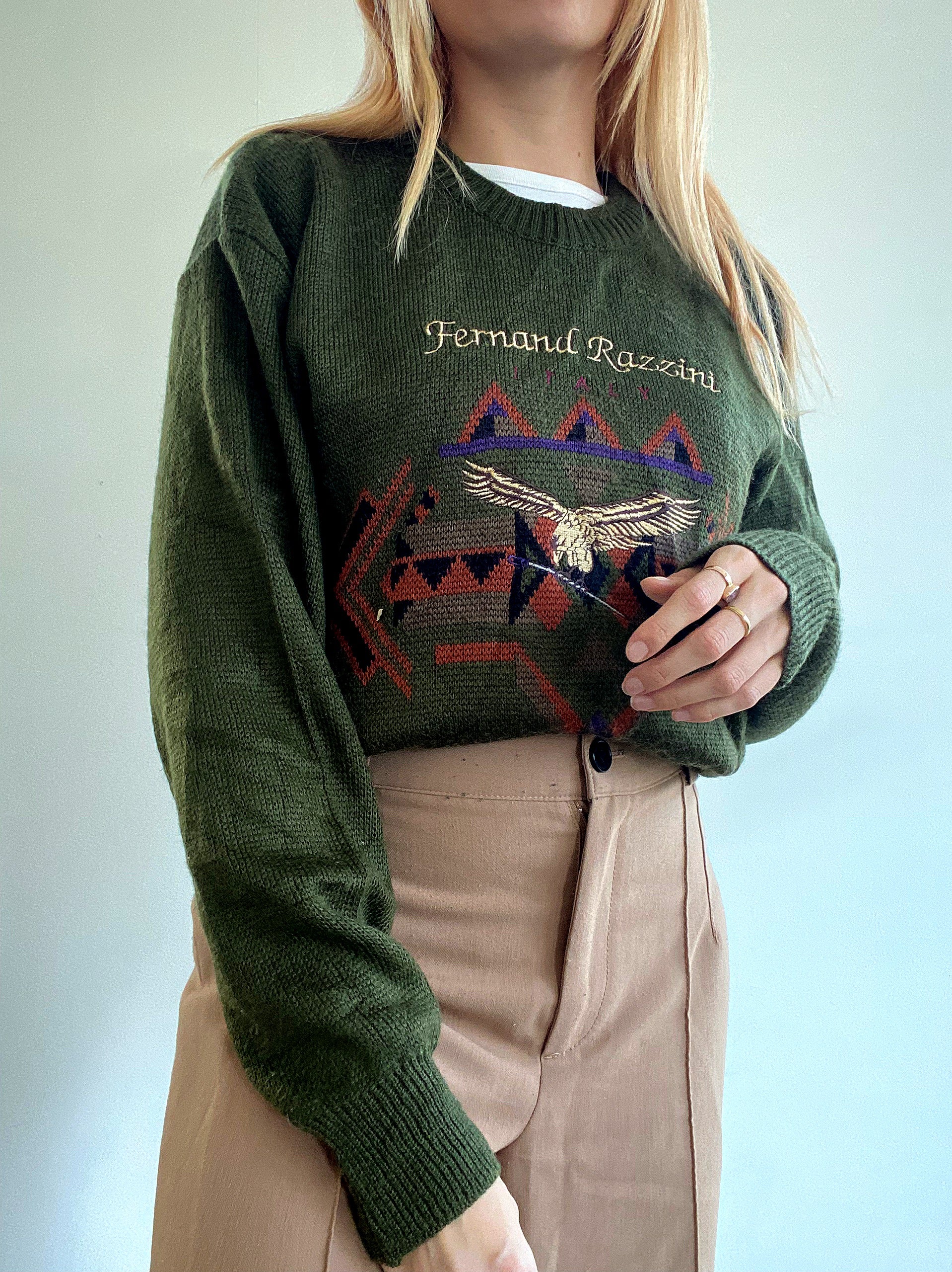 Pull vintage en laine vert khaki